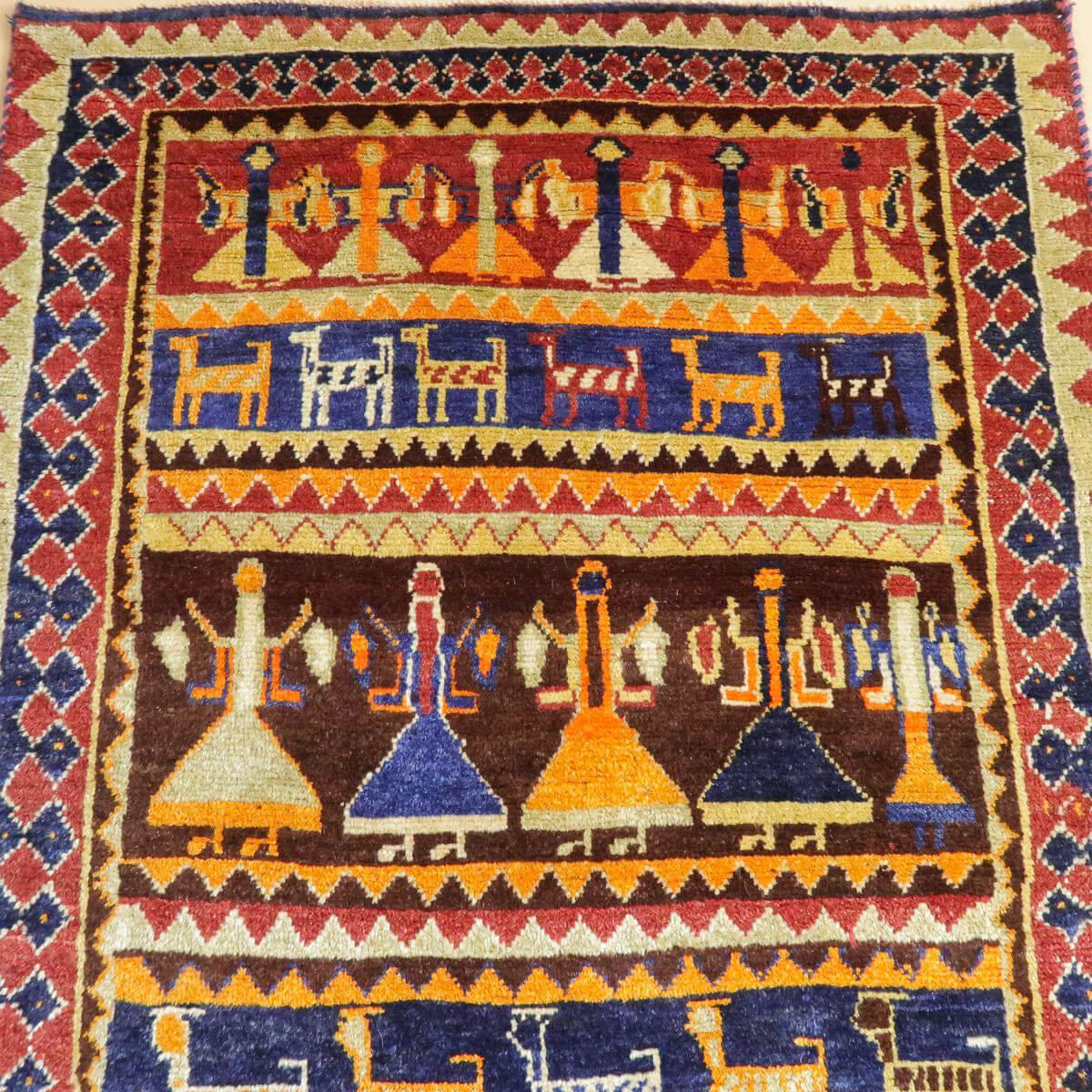 褪せた赤や紺、茶、黄オレンジ等、枯れた色合いとカシュガイの伝統柄が、たいへん魅力的で味わいあるカシュガイ族の少し古い年代のギャッベです。家庭用として作られたギャッベ本来の野性味溢れるこのようなトラディショナル・ギャッベは、特に、類似した品がめったになく、「世界に一枚」というユニーク性とその年代ならではの物という希少価値が高い品です。厚みは13ミリ程度と薄手で、オールドらしい摩耗したようなてろんとしなやかな生地感です。