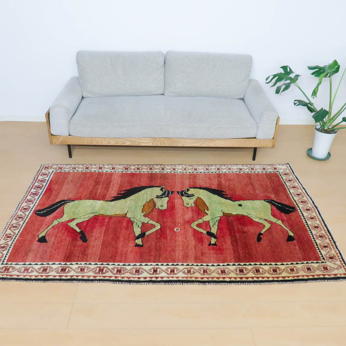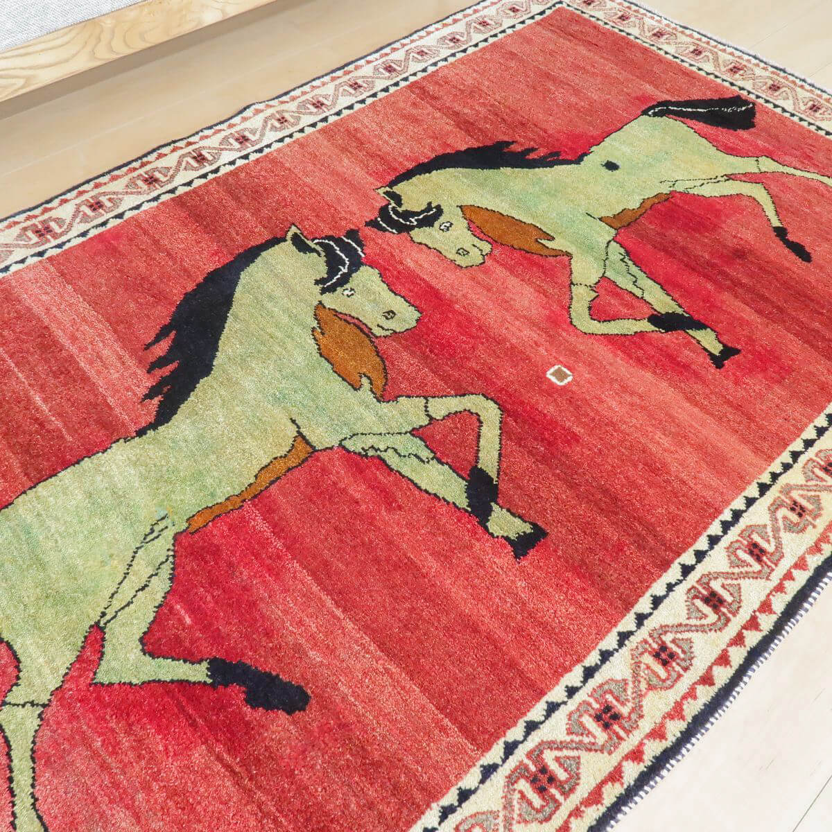 グラデーションの大変美しいザクロ色に黄緑味のかかったようなグレーベージュの大きな二匹の馬のデザイン。枯れた色合いとカシュガイの伝統柄が、たいへん魅力的で味わいあるカシュガイ族の少し古い年代のギャッベです。家庭用として作られたギャッベ本来の野性味溢れるこのようなトラディショナル・ギャッベは、特に、類似した品がめったになく、「世界に一枚」というユニーク性とその年代ならではの物という希少価値が高い品です。厚みは17ミリ程度、やんわりと沈み込む踏み心地で、ツヤのある滑らかなウール素材。