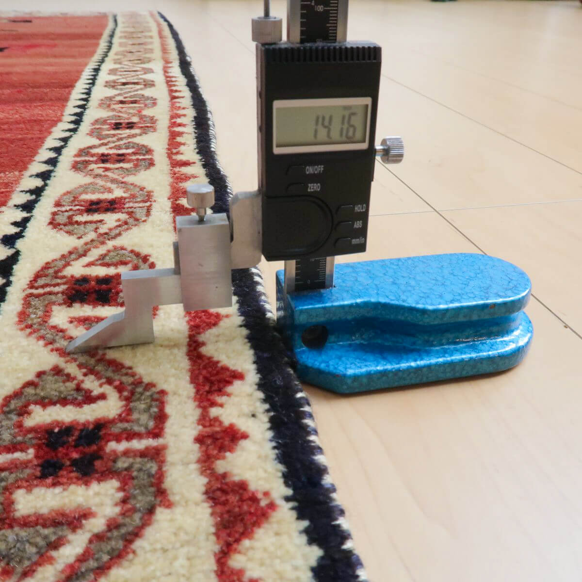 照明の違いで色合いが多少違って見えます。また、ギャッベは毛足に向きがあるので、見る方向で、明るかったり暗かったりも見えます。