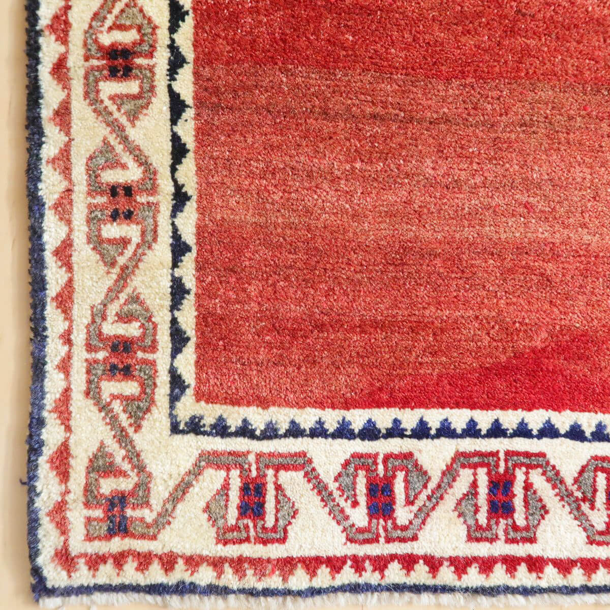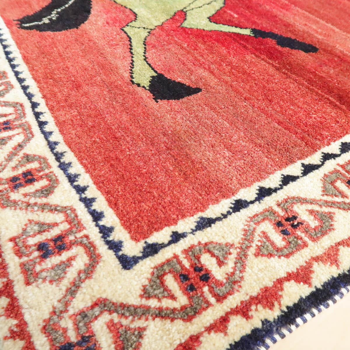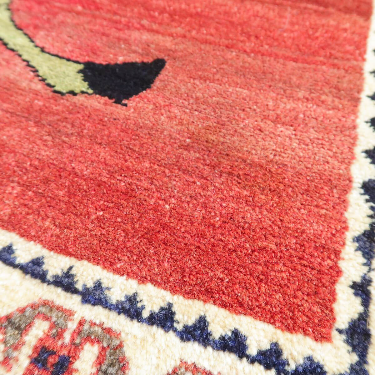 ベーシックなギャッベに比べると細めの糸を使用しており、ハリ感のある踏み心地が心地の良い、織りの詰まった作りです。コンディションの良い品を厳選しておりますが、年代なりの魅力としての擦れたような箇所、形の歪みやにじみ等がみられる部分は敢えて持たせるセレクトとしております、新品にはない味わいとしてご鑑賞ください。メンテナンスクリーニングは現地と自社で二重に施しており、清潔感をもって使えます。