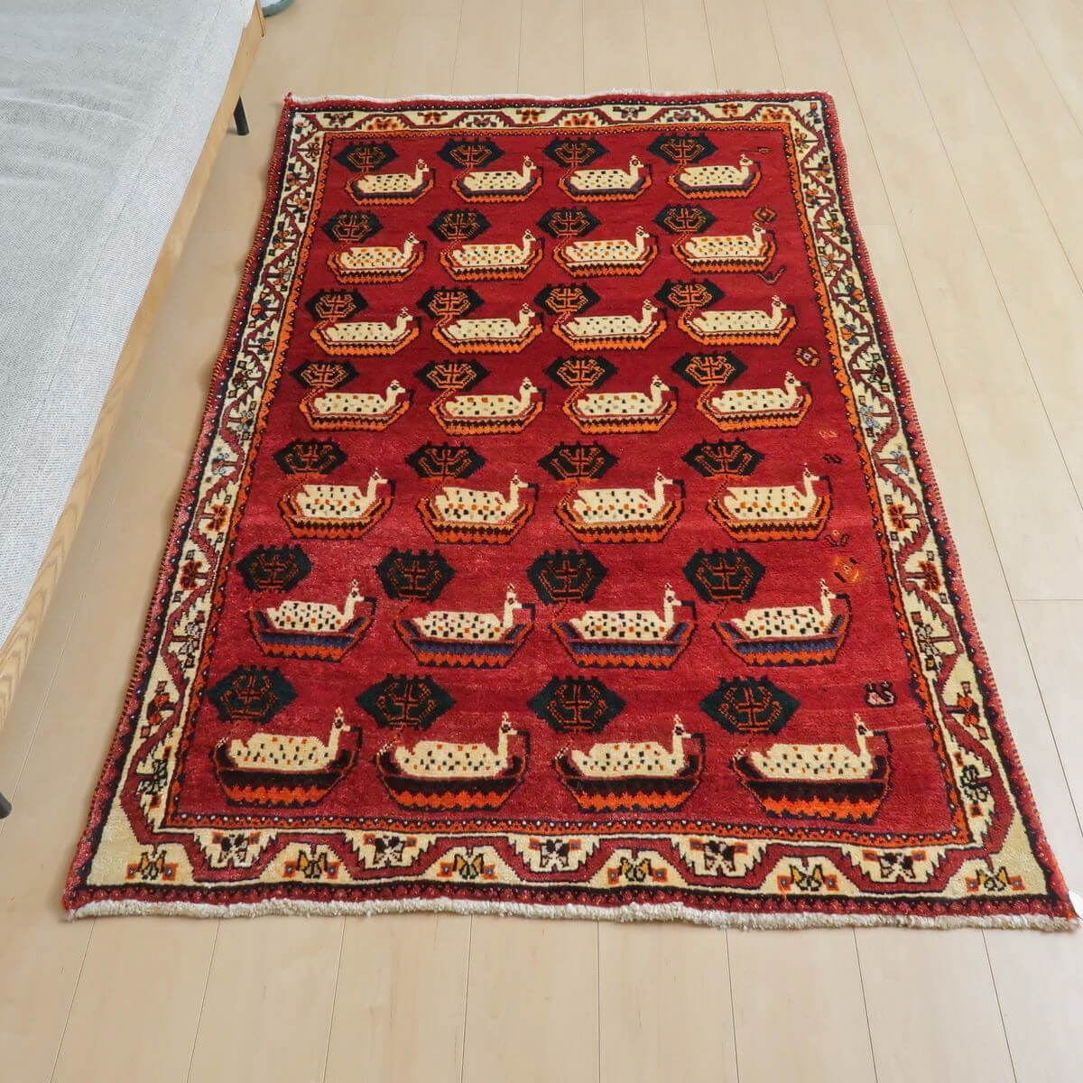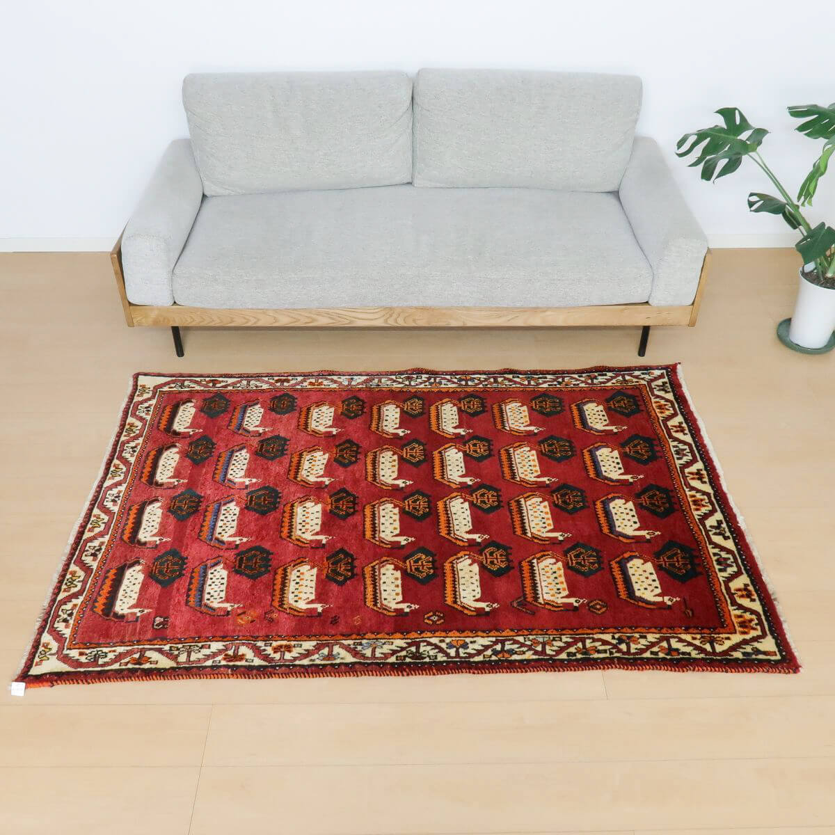 ベーシックなギャッベに比べると細めの糸を使用しており、ハリ感のある踏み心地が心地の良い、織りの詰まった作りです。コンディションの良い品を厳選しておりますが、年代なりの魅力としての擦れたような箇所、形の歪みやにじみ等がみられる部分は敢えて持たせるセレクトとしております、新品にはない味わいとしてご鑑賞ください。メンテナンスクリーニングは現地と自社で二重に施しており、清潔感をもって使えます。
