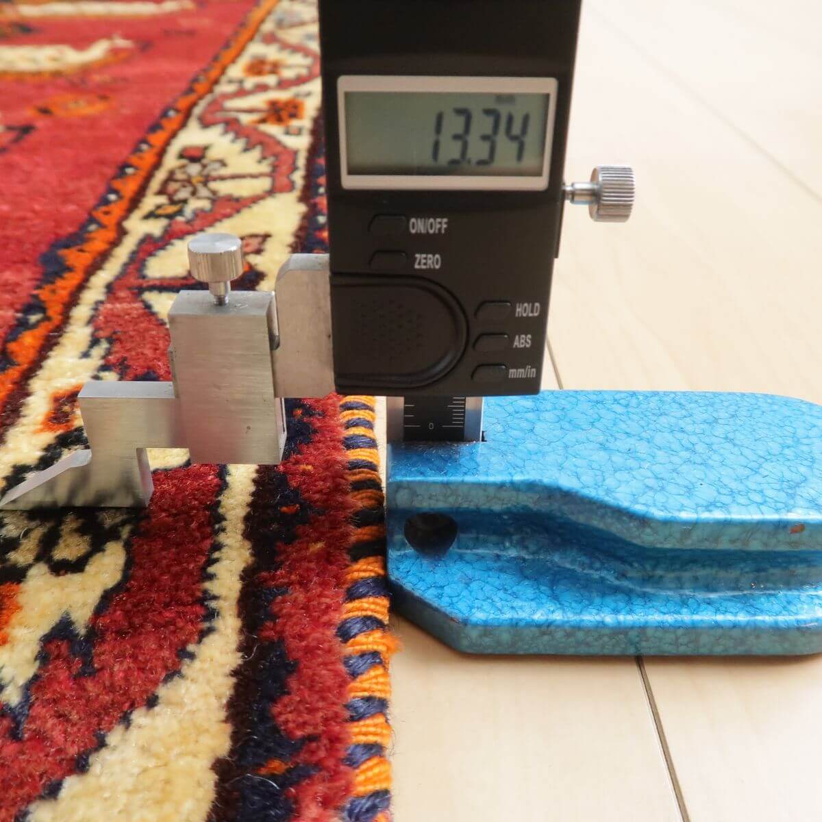 照明の違いで色合いが多少違って見えます。また、ギャッベは毛足に向きがあるので、見る方向で、明るかったり暗かったりも見えます。