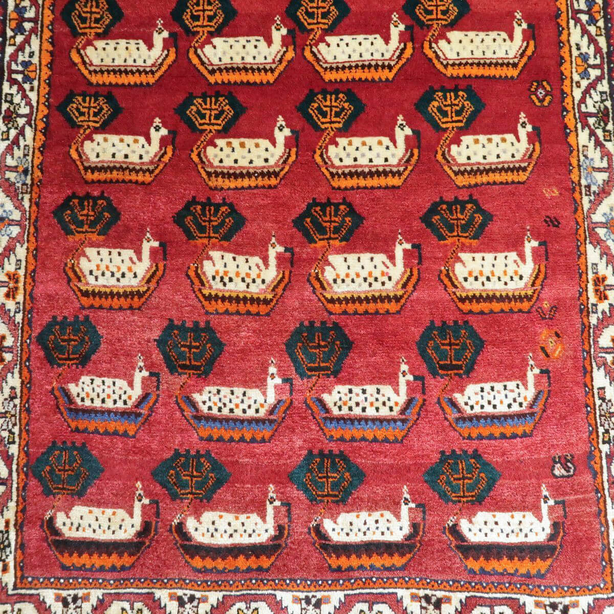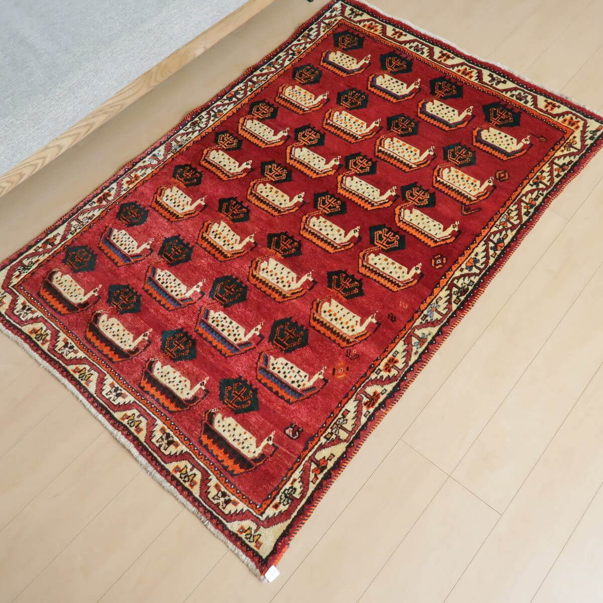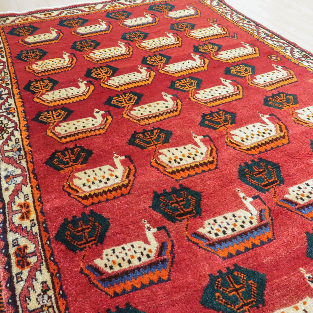 やや渋みのかかった落ち着きのある色合いに、個性のあるモチーフが並びます。色の取り合わせとカシュガイの伝統柄が、レトロな雰囲気。たいへん魅力的で味わいあるカシュガイの少し古い年代の品。家庭用として作られた、本来の野性味溢れるこのようなトラディショナル・ギャッベは、特に、類似した品がめったになく、「世界に一枚」というユニーク性とその年代ならではの物という希少価値が高い品です。厚みは17ミリ位、やんわりと沈み込む踏み心地で、ツヤめく滑らかなウール素材、目の細かな丁寧なつくりです。