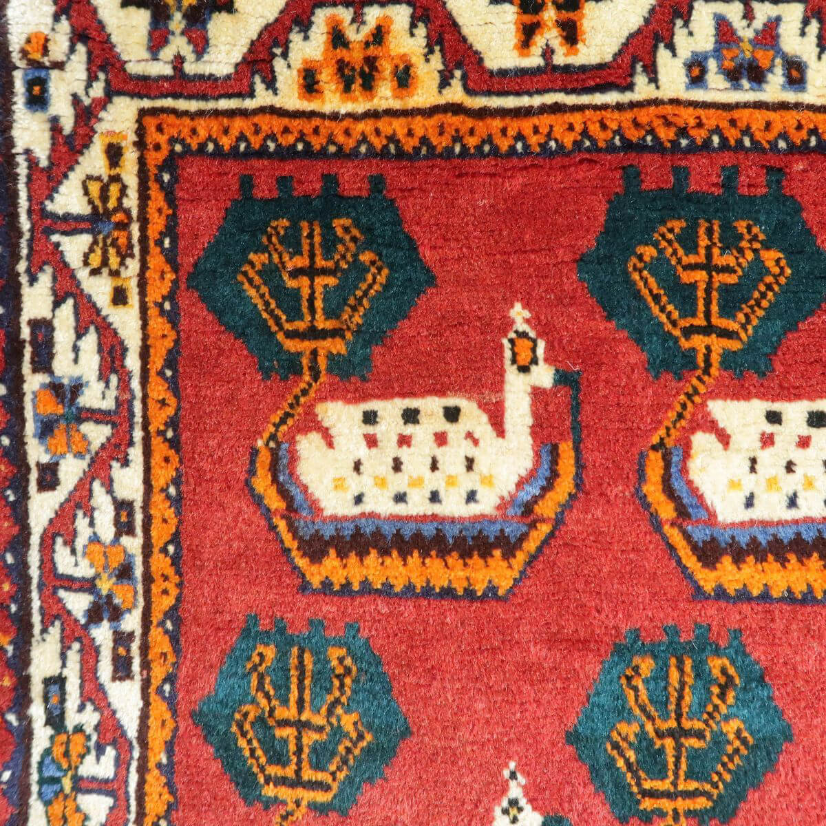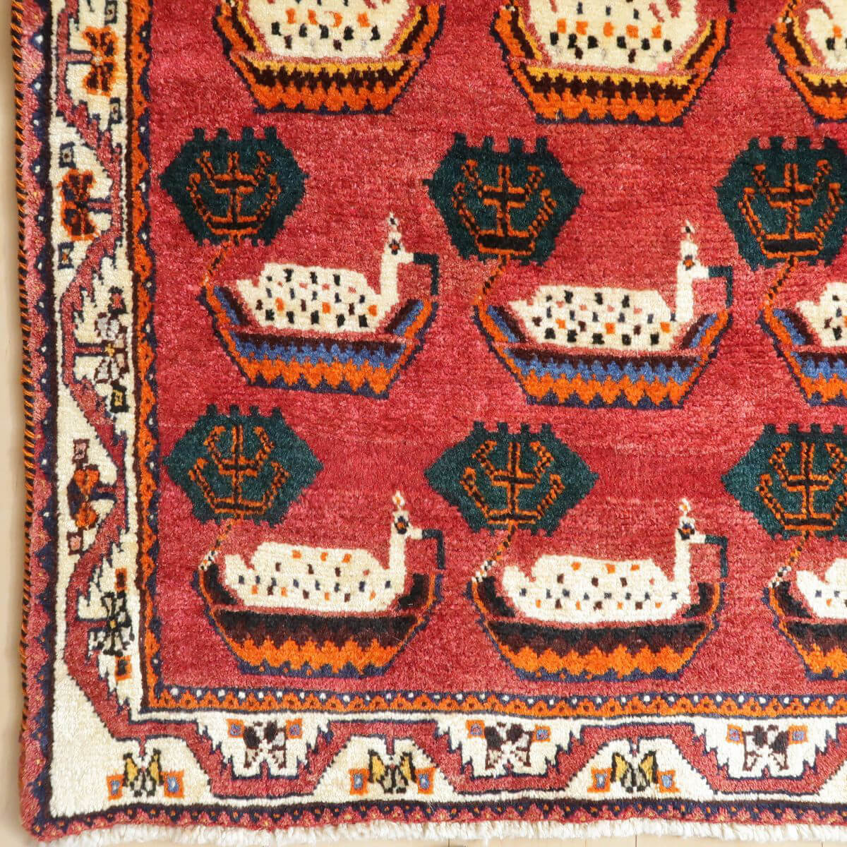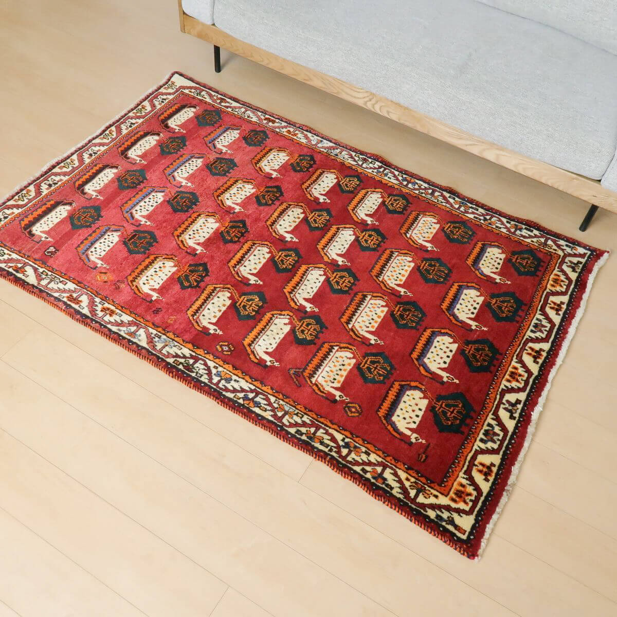 やや渋みのかかった落ち着きのある色合いに、個性のあるモチーフが並びます。色の取り合わせとカシュガイの伝統柄が、レトロな雰囲気。たいへん魅力的で味わいあるカシュガイの少し古い年代の品。家庭用として作られた、本来の野性味溢れるこのようなトラディショナル・ギャッベは、特に、類似した品がめったになく、「世界に一枚」というユニーク性とその年代ならではの物という希少価値が高い品です。厚みは17ミリ位、やんわりと沈み込む踏み心地で、ツヤめく滑らかなウール素材、目の細かな丁寧なつくりです。