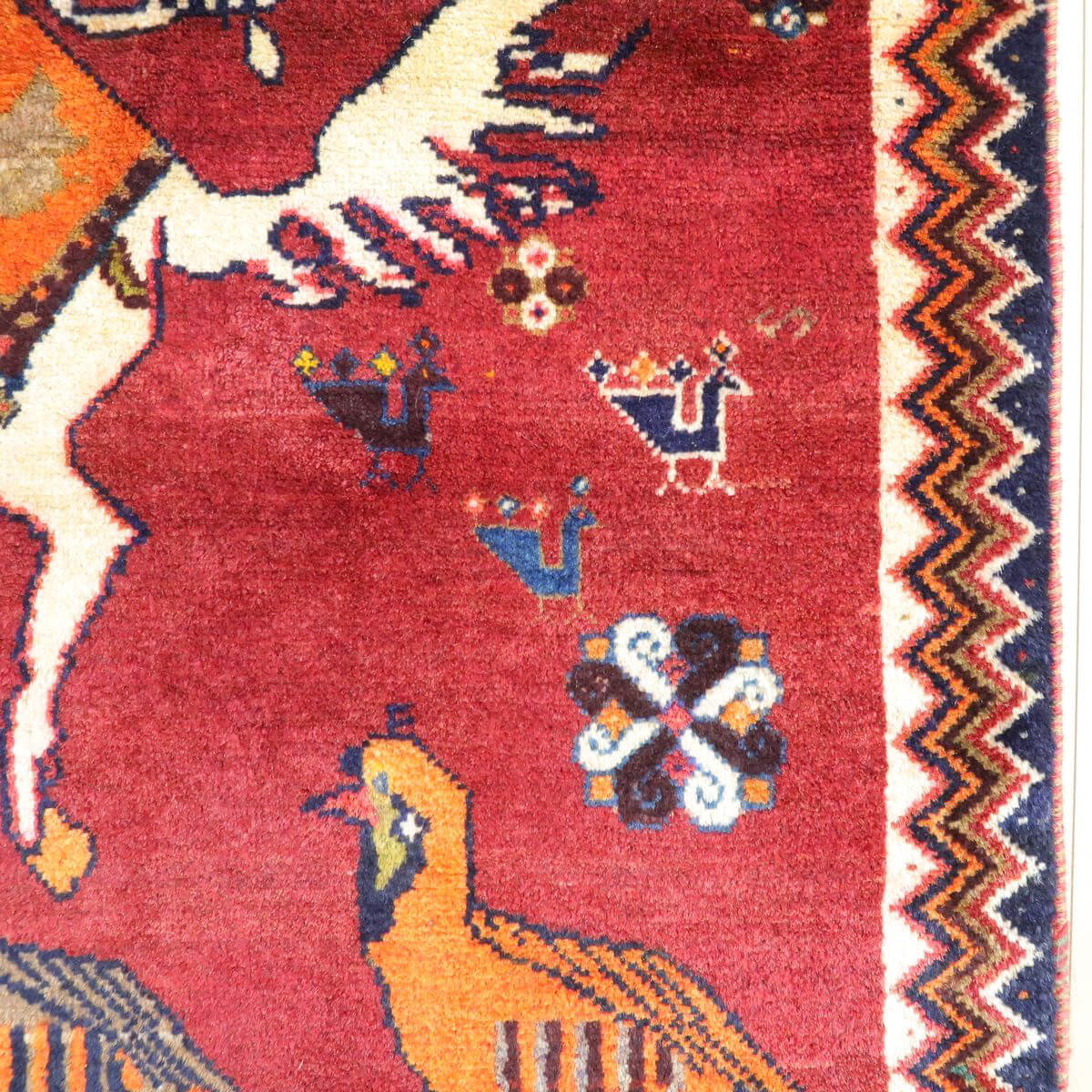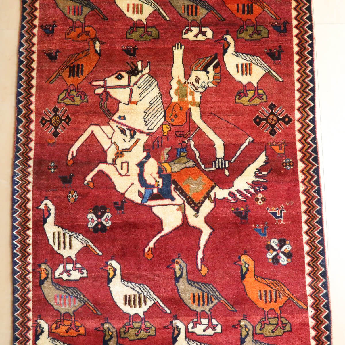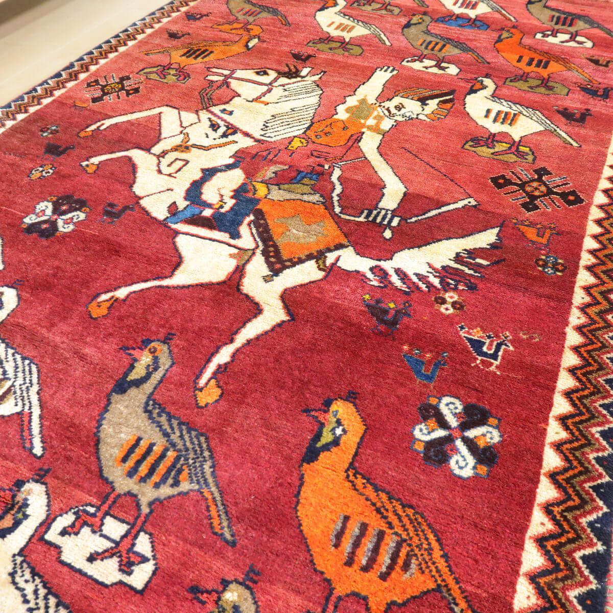 やや渋みのかかった落ち着きのある色合いに、個性のあるモチーフが並びます。色の取り合わせとカシュガイの伝統柄が、レトロな雰囲気。たいへん魅力的で味わいあるカシュガイの少し古い年代の品。家庭用として作られた、本来の野性味溢れるこのようなトラディショナル・ギャッベは、特に、類似した品がめったになく、「世界に一枚」というユニーク性とその年代ならではの物という希少価値が高い品です。厚みは17ミリ位、やんわりと沈み込む踏み心地で、ツヤめく滑らかなウール素材、目の細かな丁寧なつくりです。