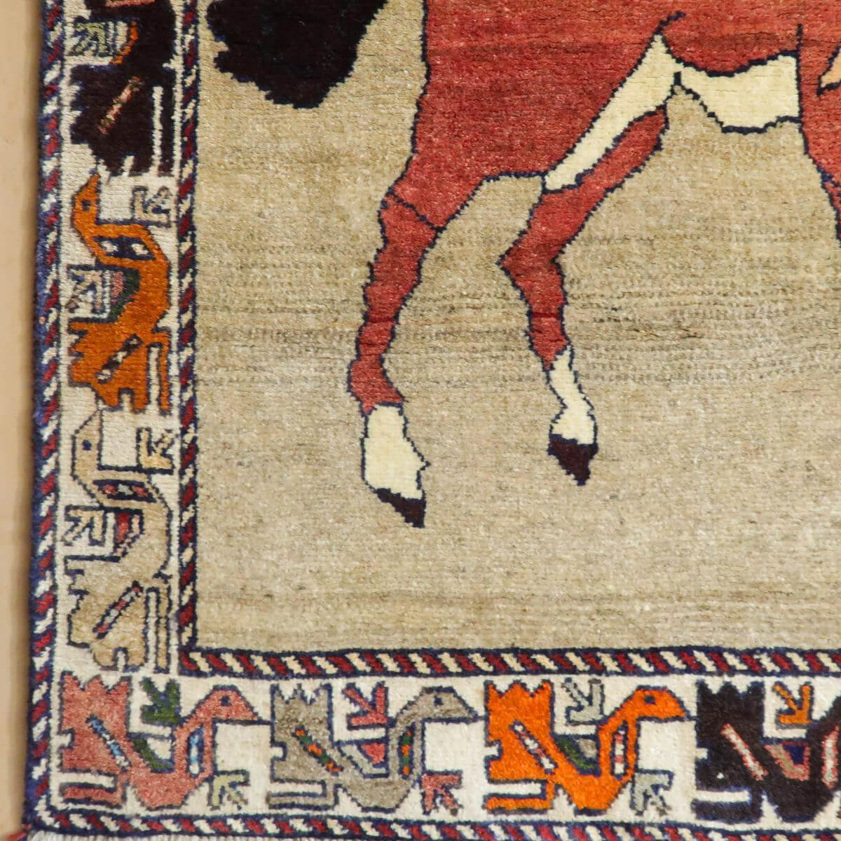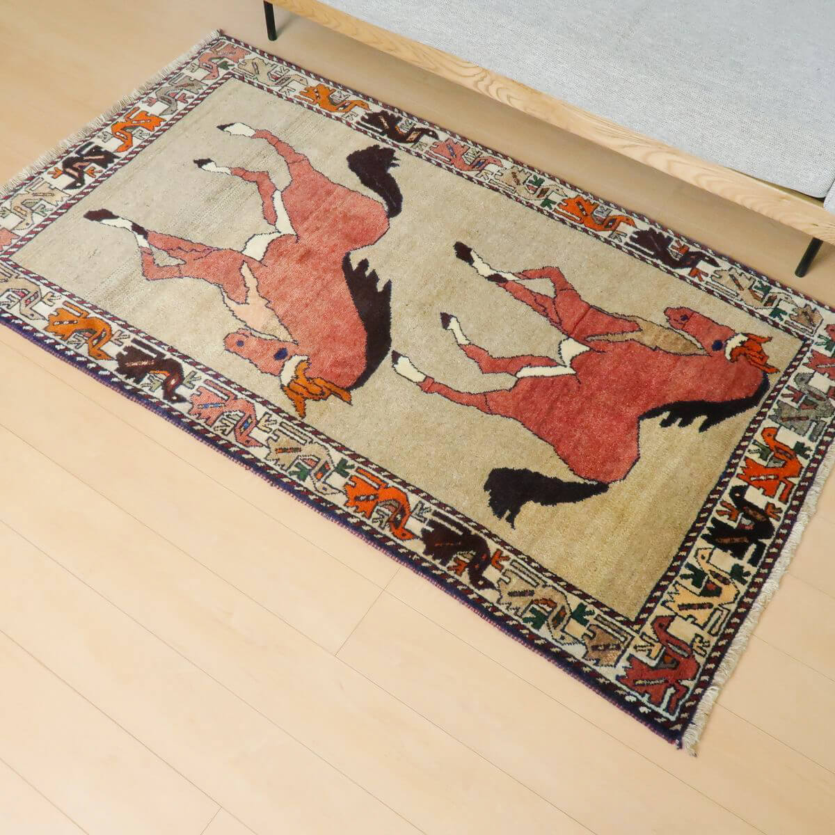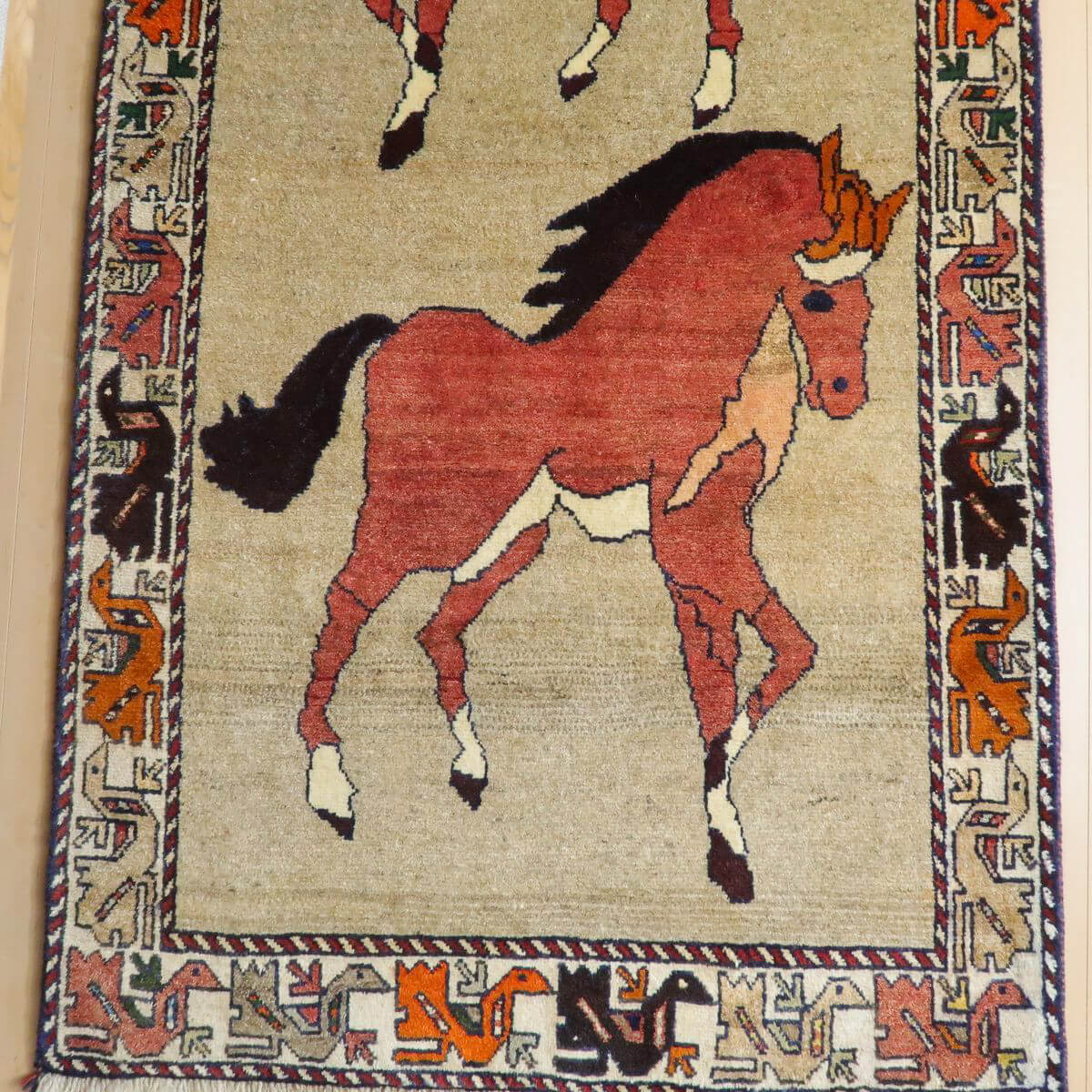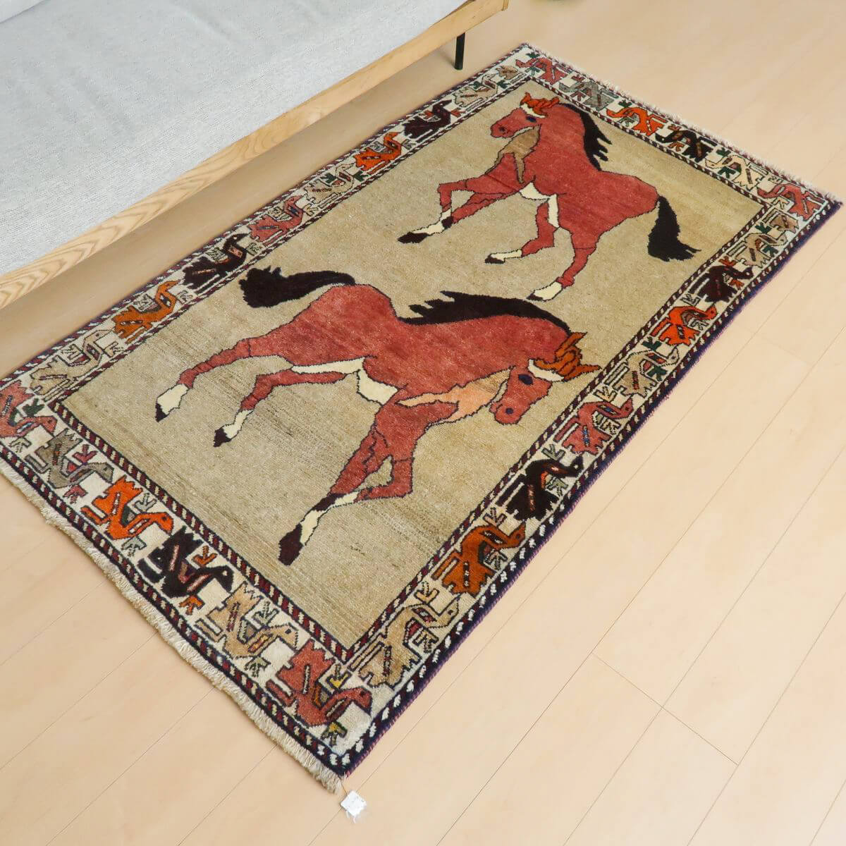 柔らかな薄めのベージュに、赤レンガ色の二匹の馬、やわらかな表情が優しげな雰囲気となっています。エンジ、紺、オレンジなどの配色。家庭用として作られたギャッベ本来の野性味溢れるこのようなトラディショナル・ギャッベは、特に、類似した品がめったになく、「世界に一枚」というユニーク性とその年代ならではの物という希少価値が高い品です。厚みは18ミリ強位、ふんわり沈み込む踏み心地で、柔らかな手触りです。350,000円→245,000円の在庫一掃価格です。