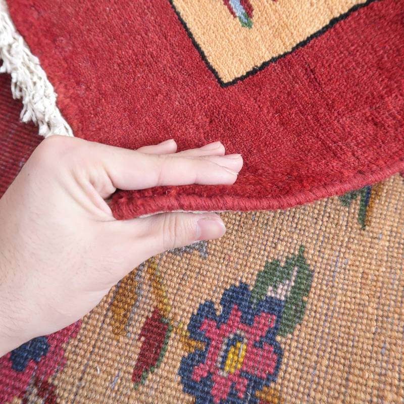 照明の違いで色合いが多少違って見えます。また、ギャッベは毛足に向きがあるので、見る方向で、明るかったり暗かったりも見えます。