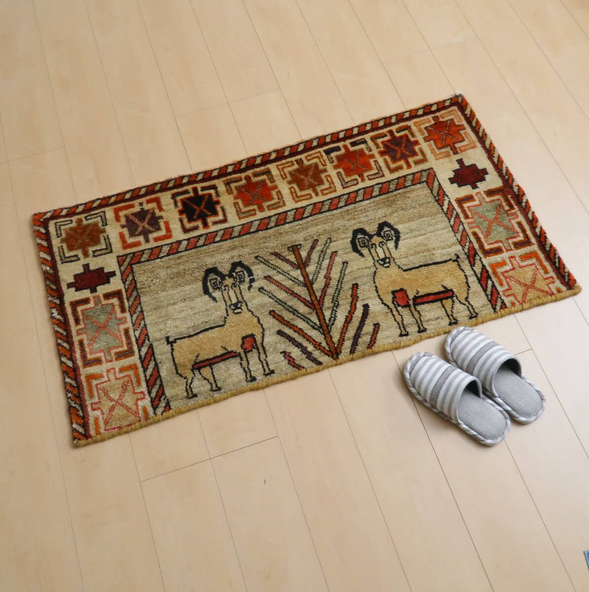 照明の違いで色合いが多少違って見えます。また、ギャッベは毛足に向きがあるので、見る方向で、明るかったり暗かったりも見えます。