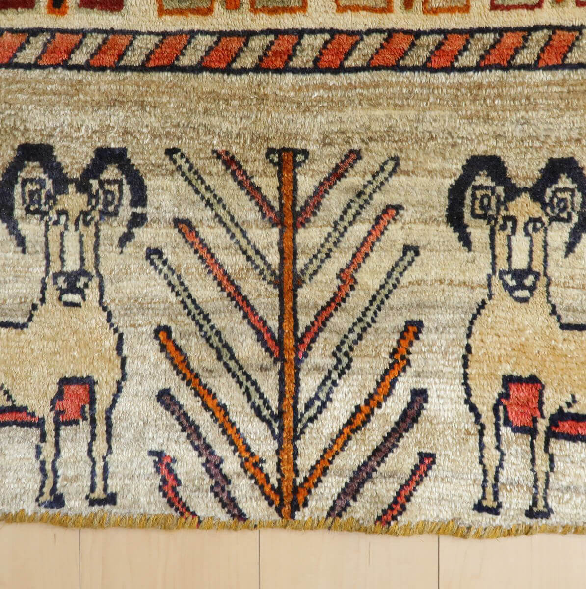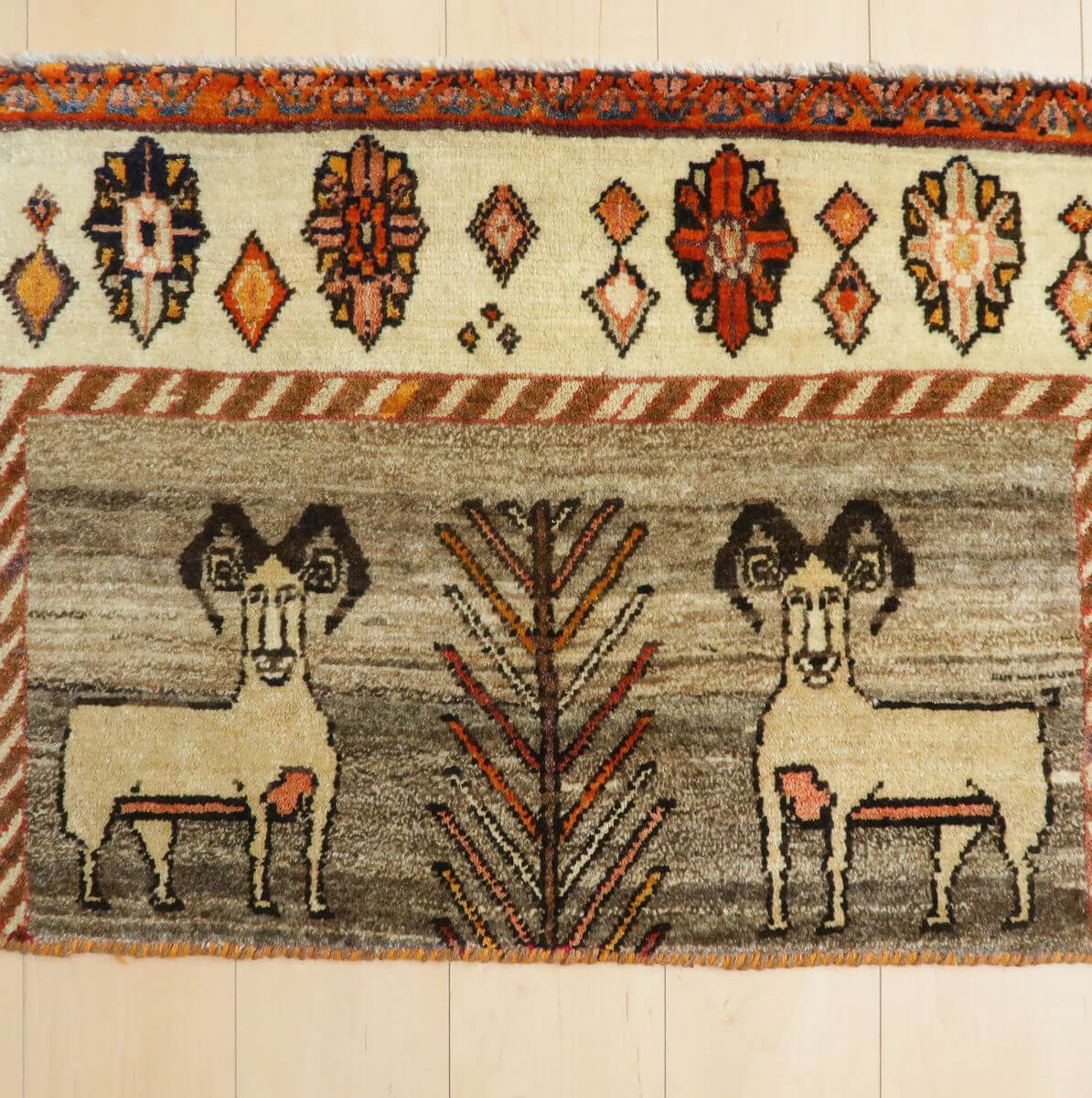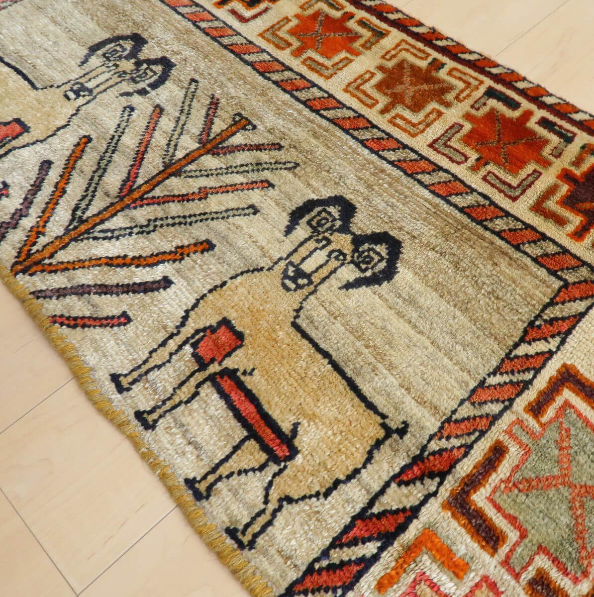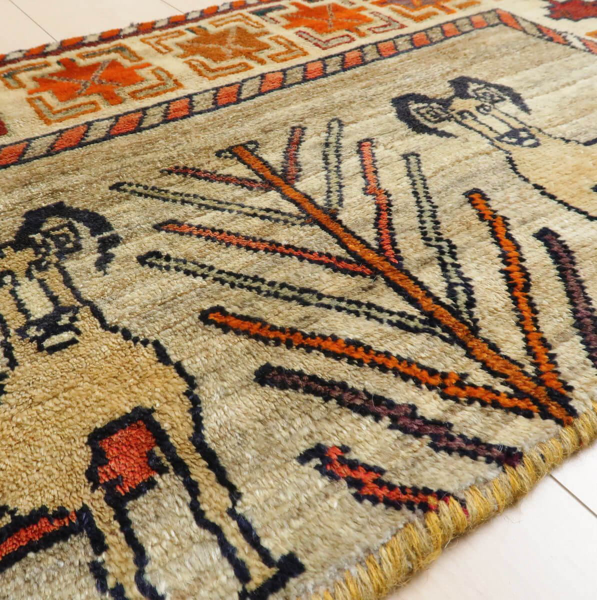 ナチュラルな雰囲気が感じられる柔らかなベージュに、表情のあるモチーフ。渋みのかかった色合いとカシュガイの伝統柄が、たいへん魅力的で味わいある少し古い年代に織られた品。家庭用として作られた、本来の野性味溢れるこのようなトラディショナル・ギャッベは、特に、類似した品がめったになく、「世界に一枚」というユニーク性とその年代ならではの物という希少価値が高い品です。厚みは16ミリ位、やんわりと沈み込む踏み心地で、しなやかな生地、ツヤめく滑らかなウール素材。