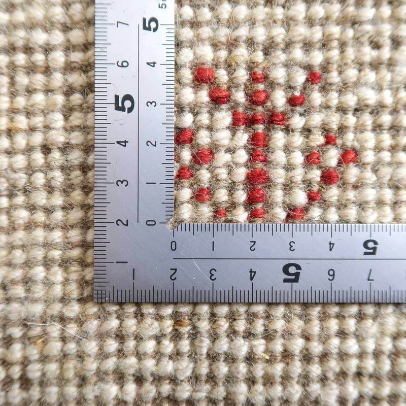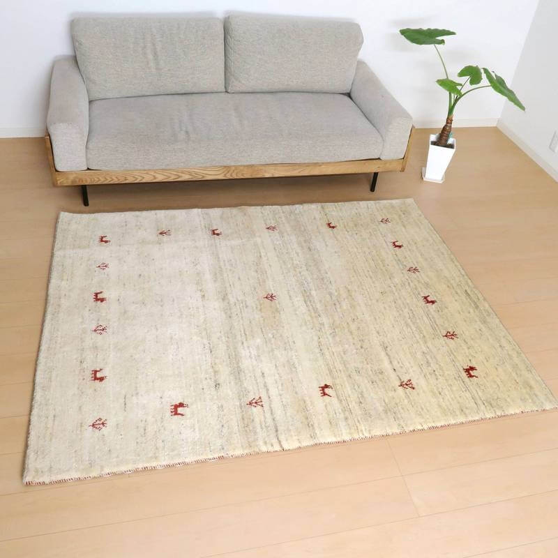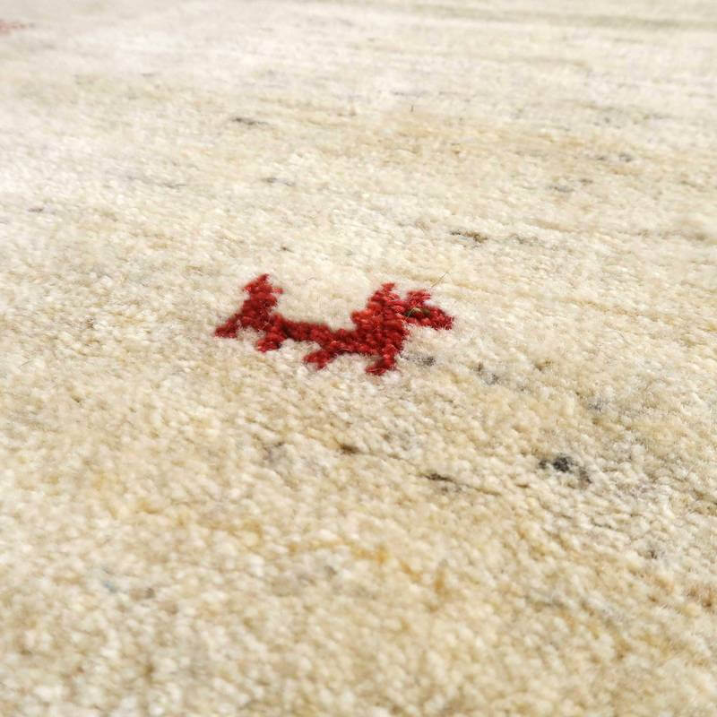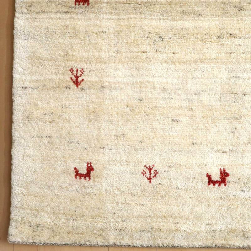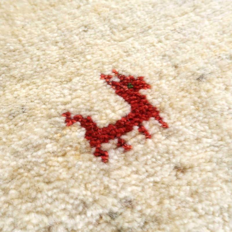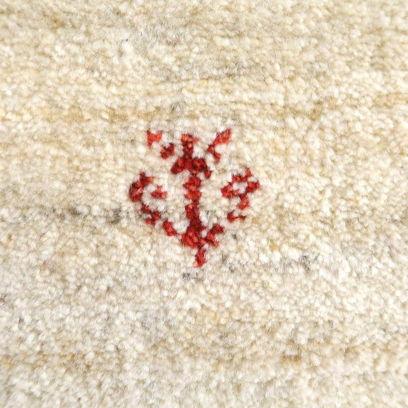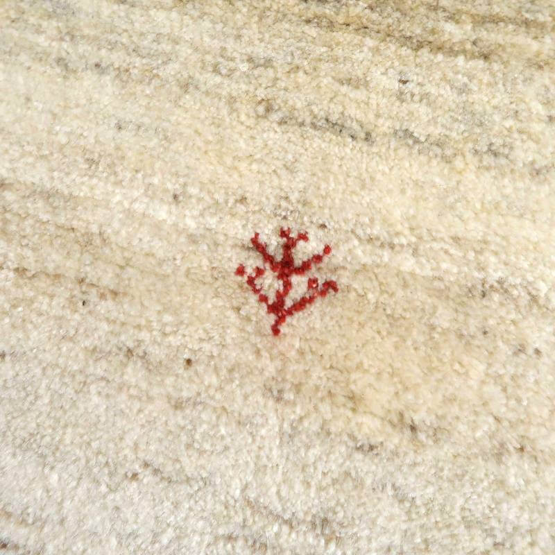 羊の毛色をそのまま活かした無染色の羊色で、ナチュラルな雰囲気がより大きく感じられます。薄いグレーやベージュのグラデーションがやんわり入り、可愛らしい小さなモチーフがくるりと枠柄となったシンプルなデザインのギャッベです。