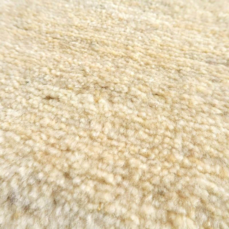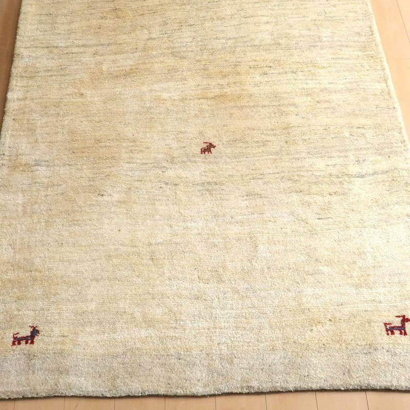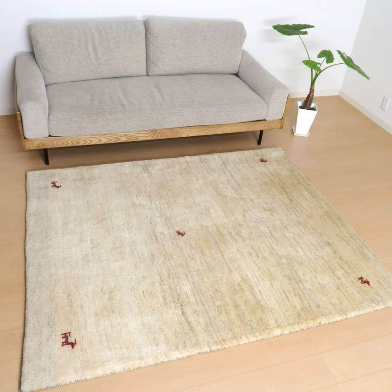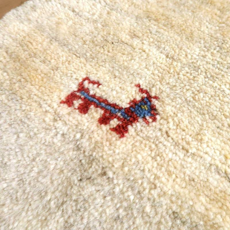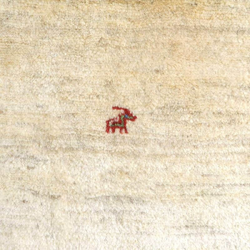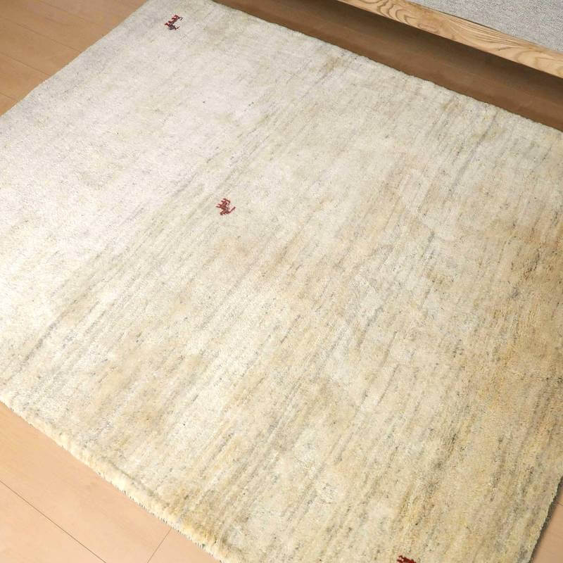 羊の毛色をそのまま活かした無染色の羊色のベースは、どんな場所にも似合うナチュラルな風合い。薄いグレーやベージュのグラデーションがやんわり入った、シンプルなデザインのギャッベです。