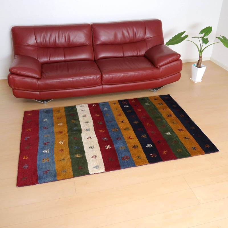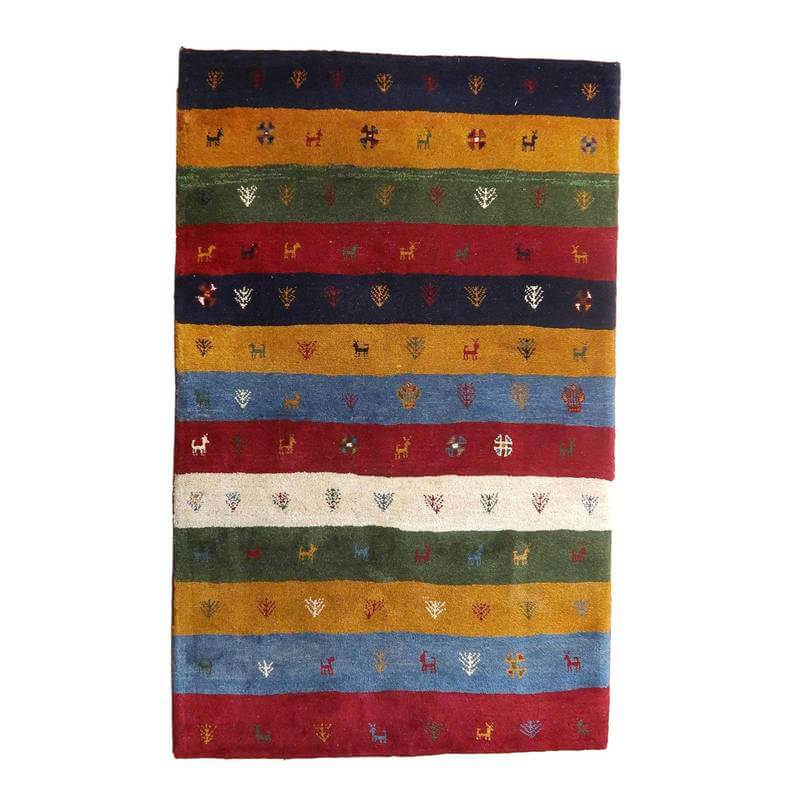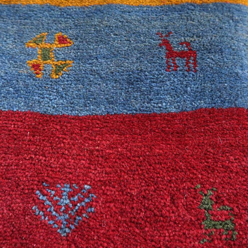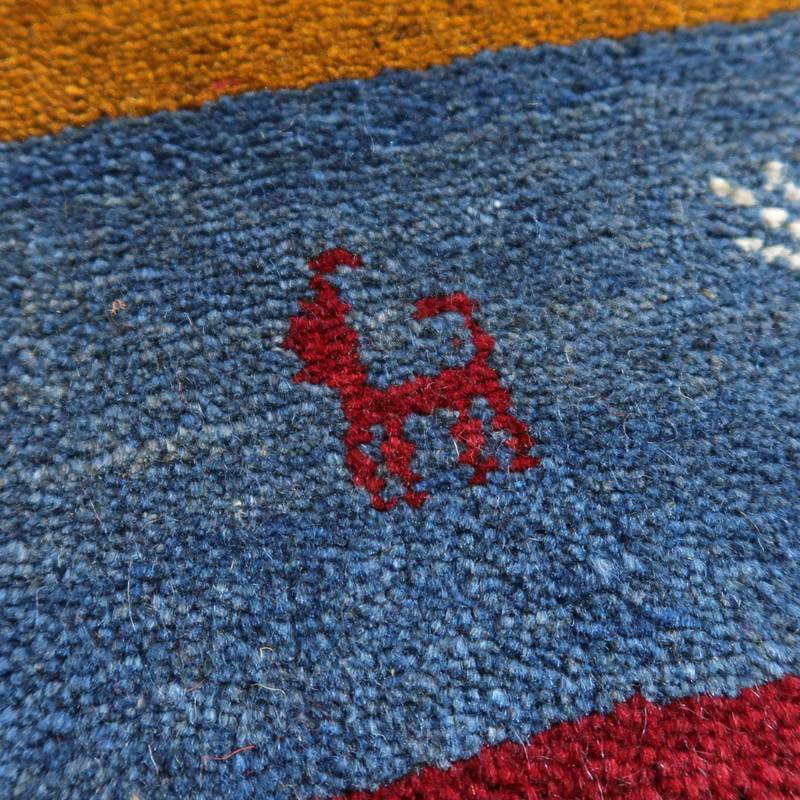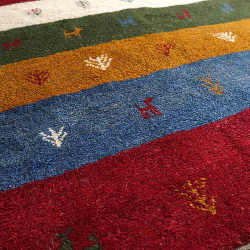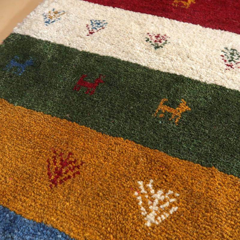赤、マスタードイエロー、、ブルー、白、ネイビーやモスグリーンの程よく濃いカラーを重ねたボーダーデザインのギャッベ。動物や生命の木が連なった素朴なぬくもりのあるデザインです。
