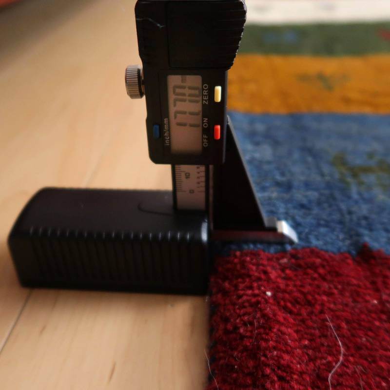 照明の違いで色合いが多少違って見えます。また、ギャッベは毛足に向きがあるので、見る方向で、明るかったり暗かったりも見えます。