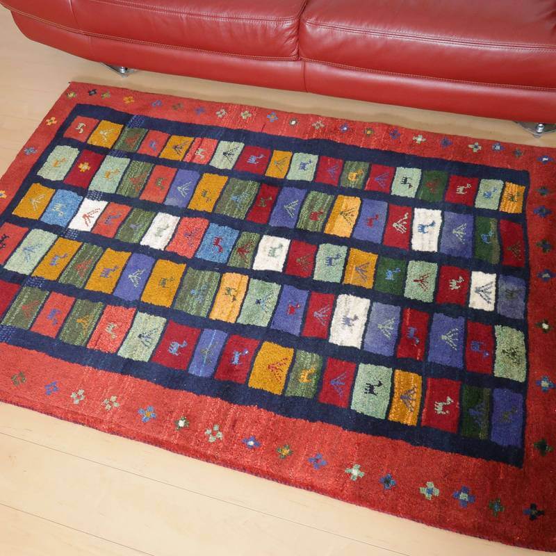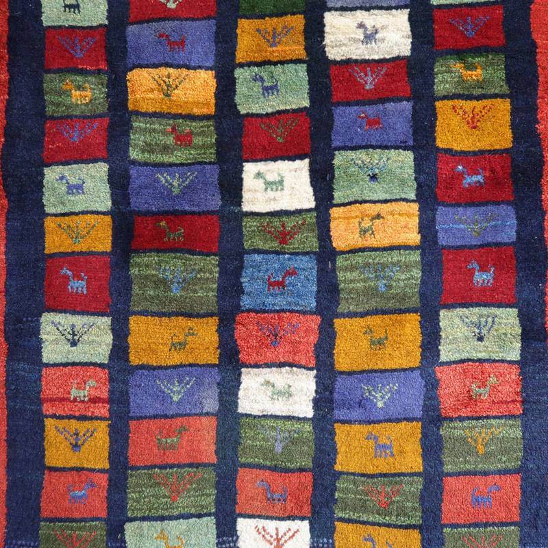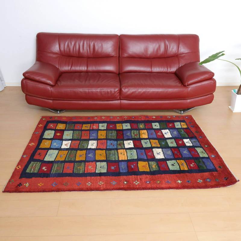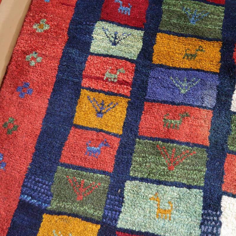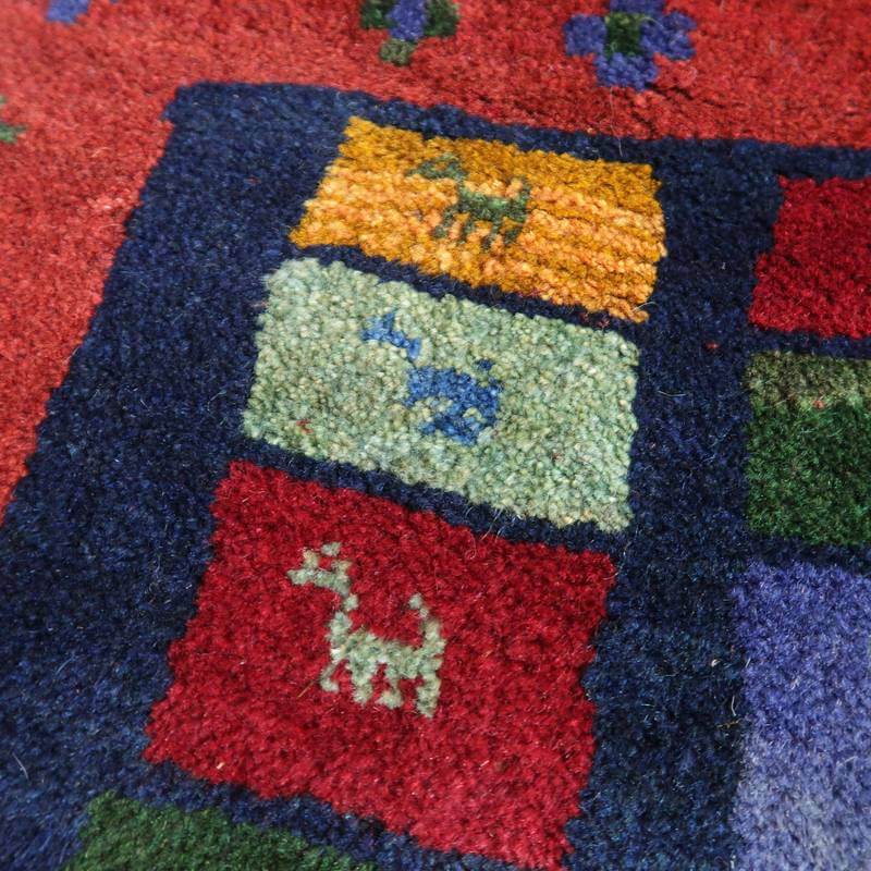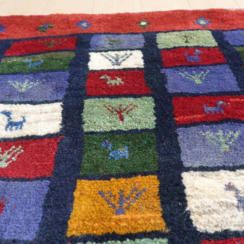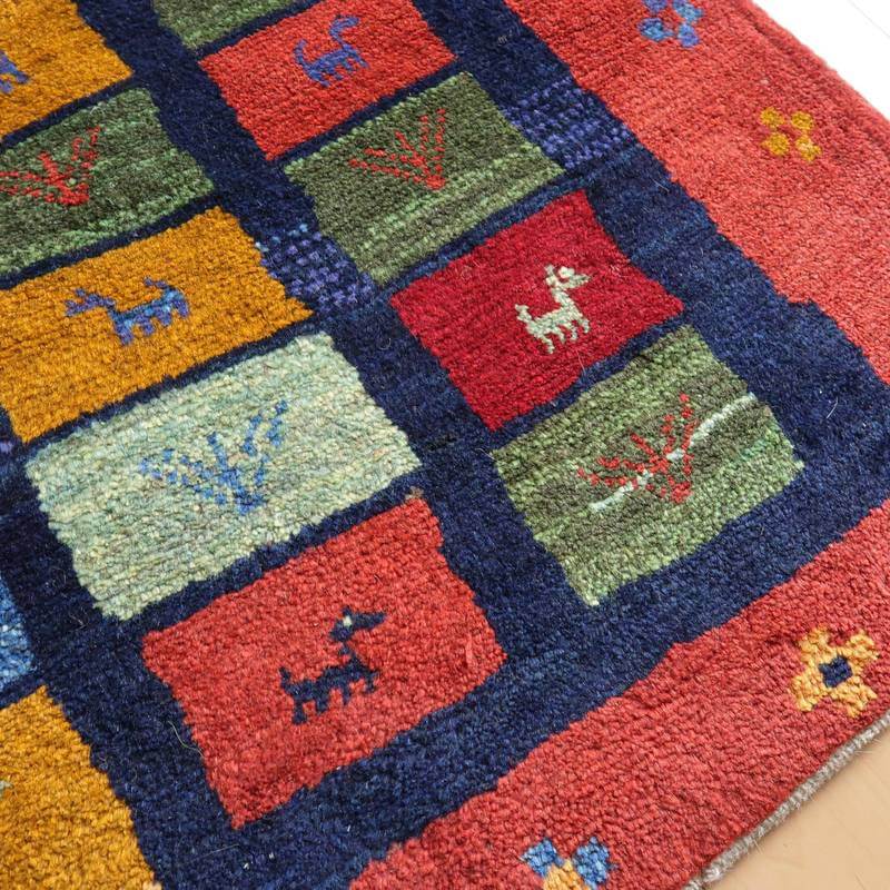 多彩な四角が並んだ彩豊かな楽しいデザイン。四角の一つ一つに動物や生命の木のモチーフが入っています。ほんわかとした赤の枠には花のモチーフが並んで可愛らしい雰囲気。自由なラインと野性味あふれる素朴な風合いから、ギャッベ特有の手仕事の温かさが感じられます。左端で179センチ、右端で183センチと長さに手織りならではの少しの差がございます。