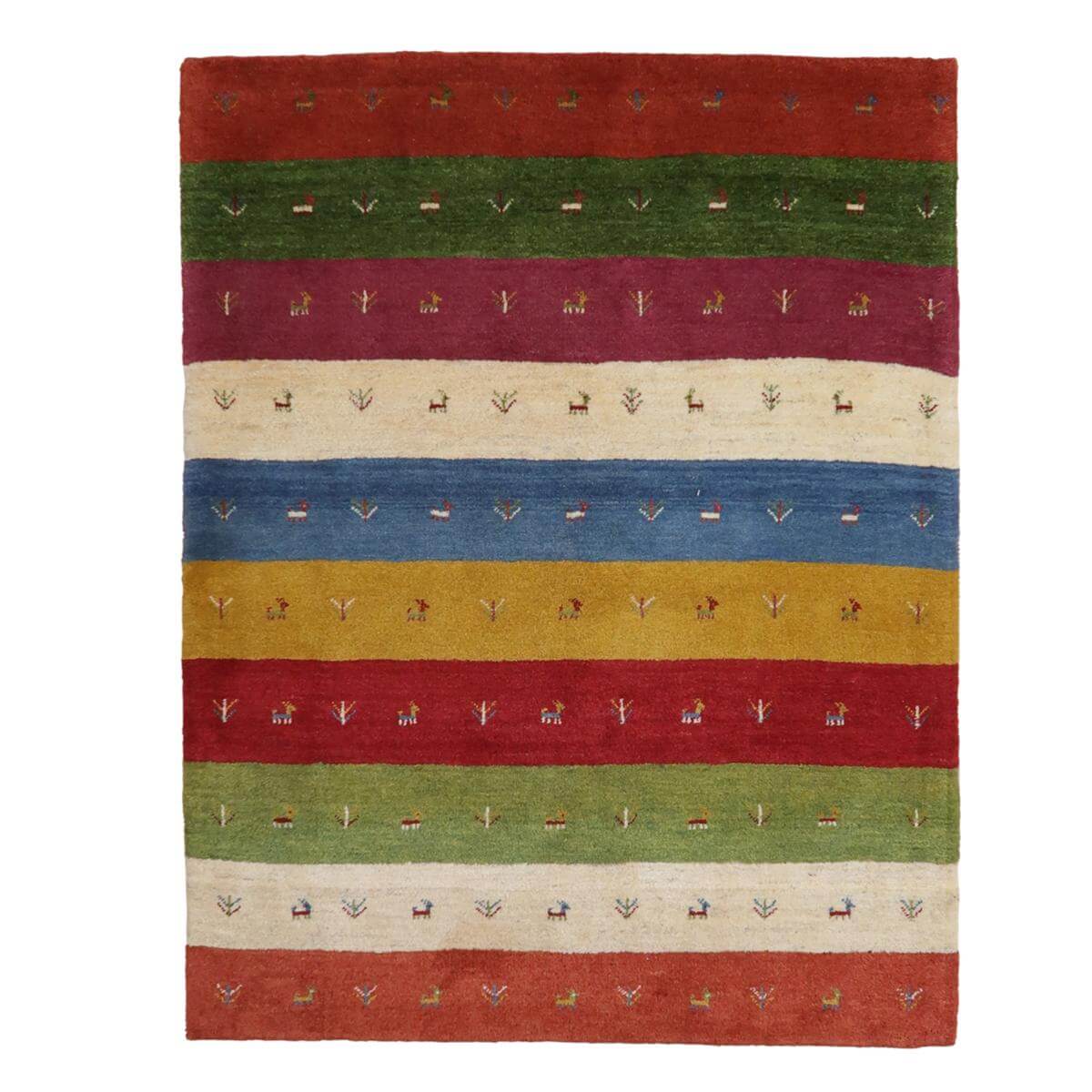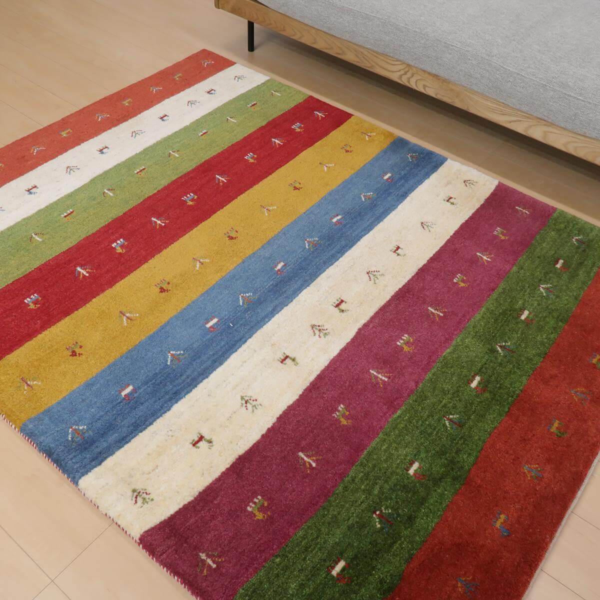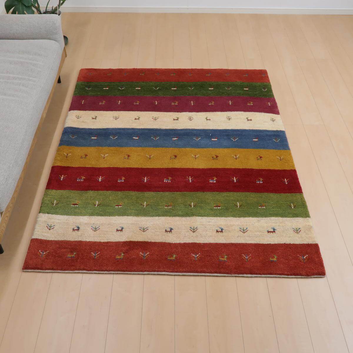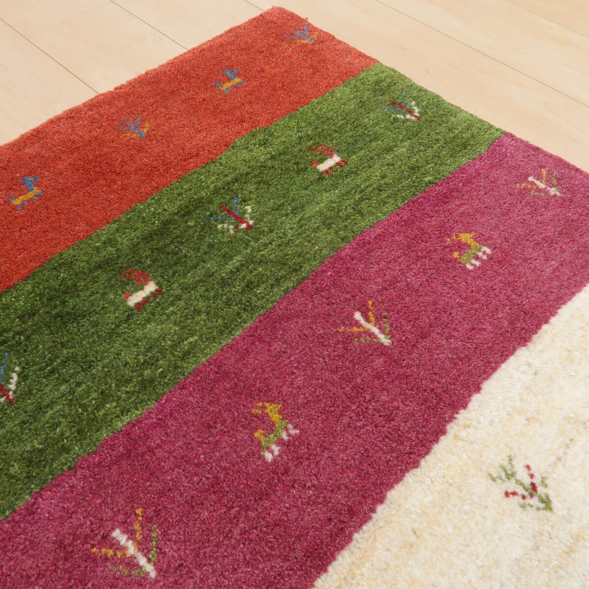 落ち着いた緑、深い赤、鮮やかな黄色、そして生成りが交互に並び、それぞれの帯には動物のモチーフが描かれています。