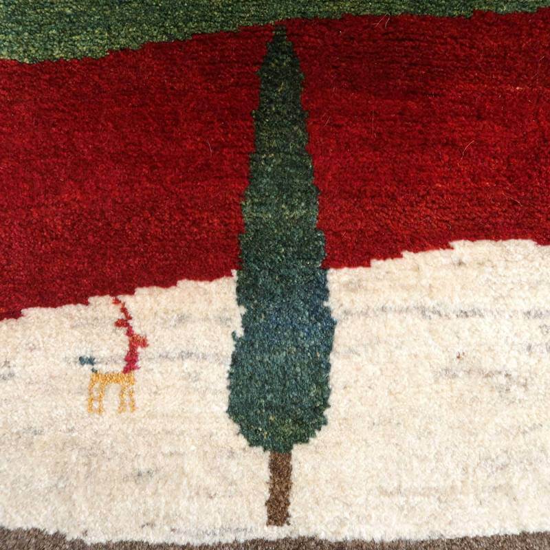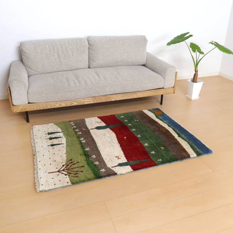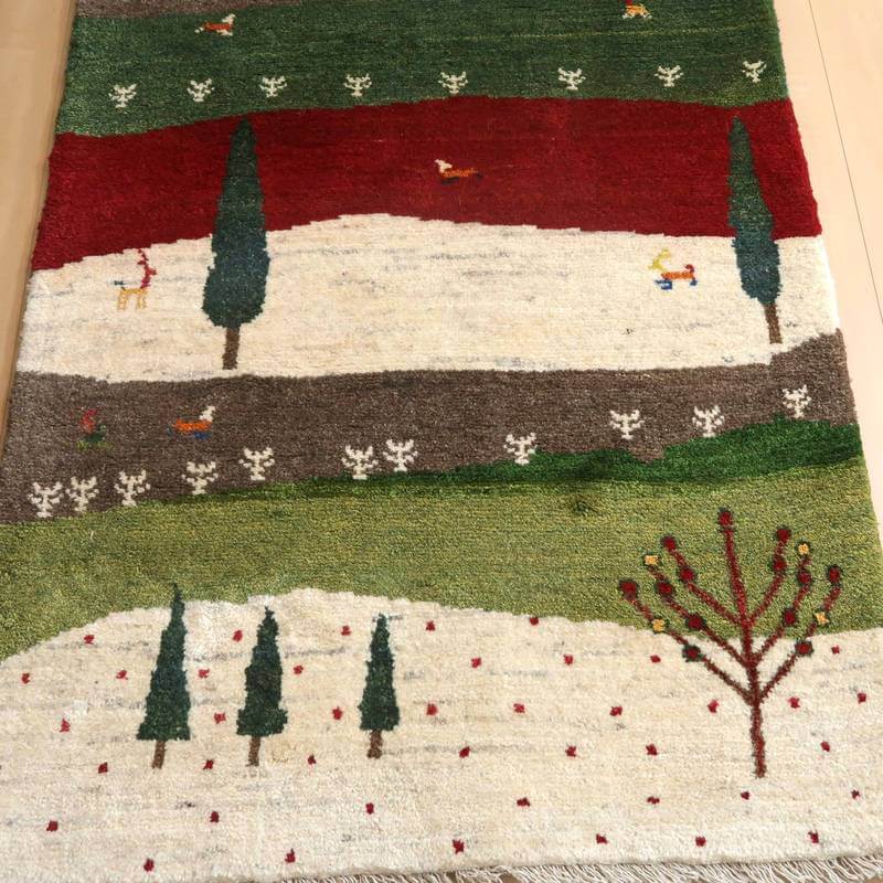 木々の姿と広がりのある風景を写し取ったランドスケープデザイン。赤、グリーン、生成り、グレーベージュ、ブルーがボーダーのように配置された明るい印象のギャッベです。