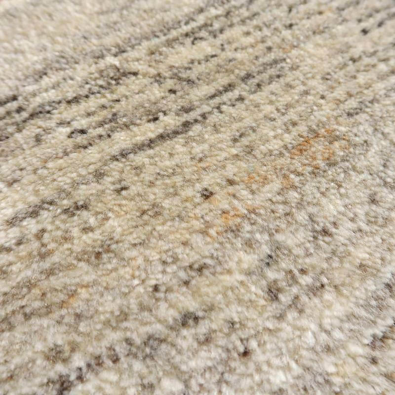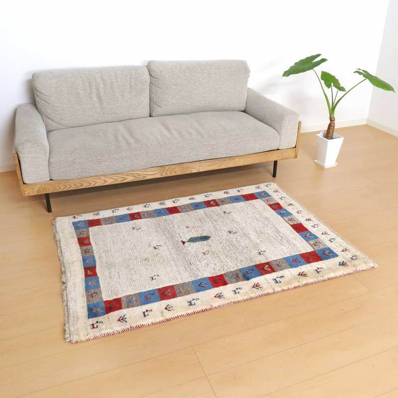 羊の毛色をそのまま活かした無染色の羊色の、薄いグレーやベージュのグラデーションがやんわり入った敷く場所を選ばないシンプルなギャッベ。くるりと枠柄となった四角や、小さなモチーフが可愛らしい、まとまりのあるデザインです。