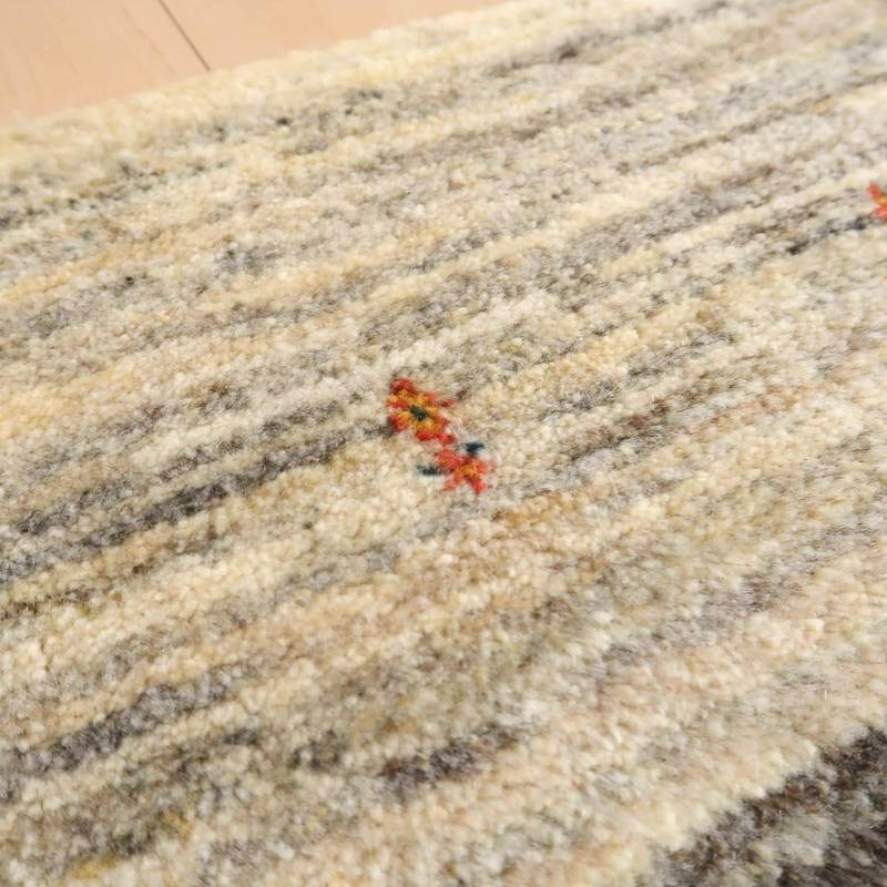 生成り、グレーやベージュ、こげ茶は、全て羊の毛色をそのまま活かした無染色の羊色。敷く場所を選ばないナチュラルなカラーを切り替えたボーダーに、繊細な雰囲気の動物や花のモチーフが入ったシンプルなデザインです。