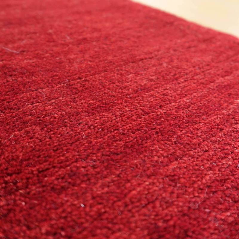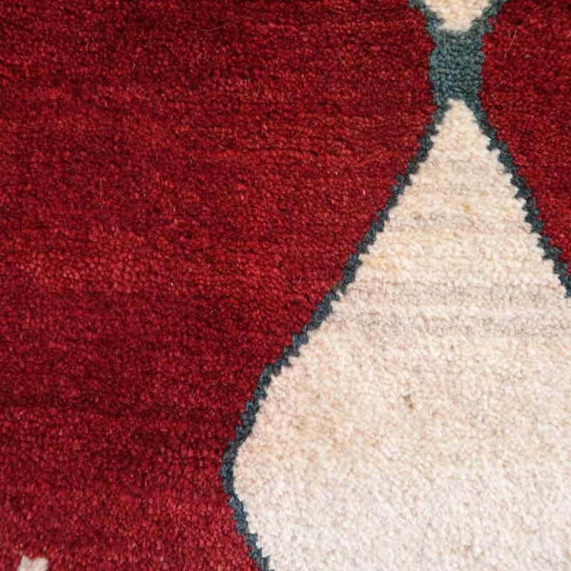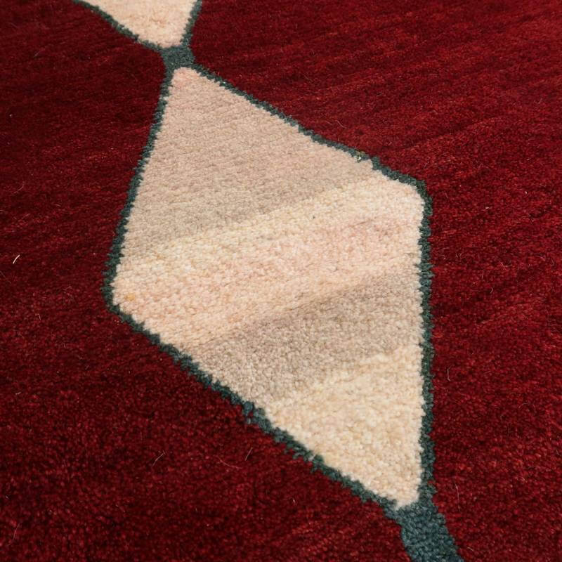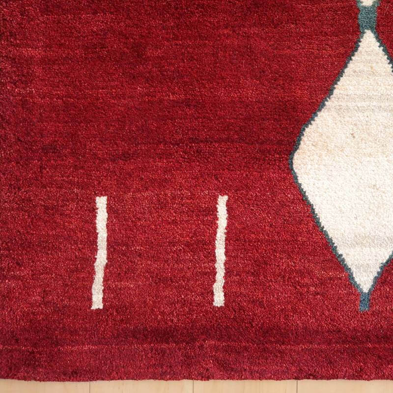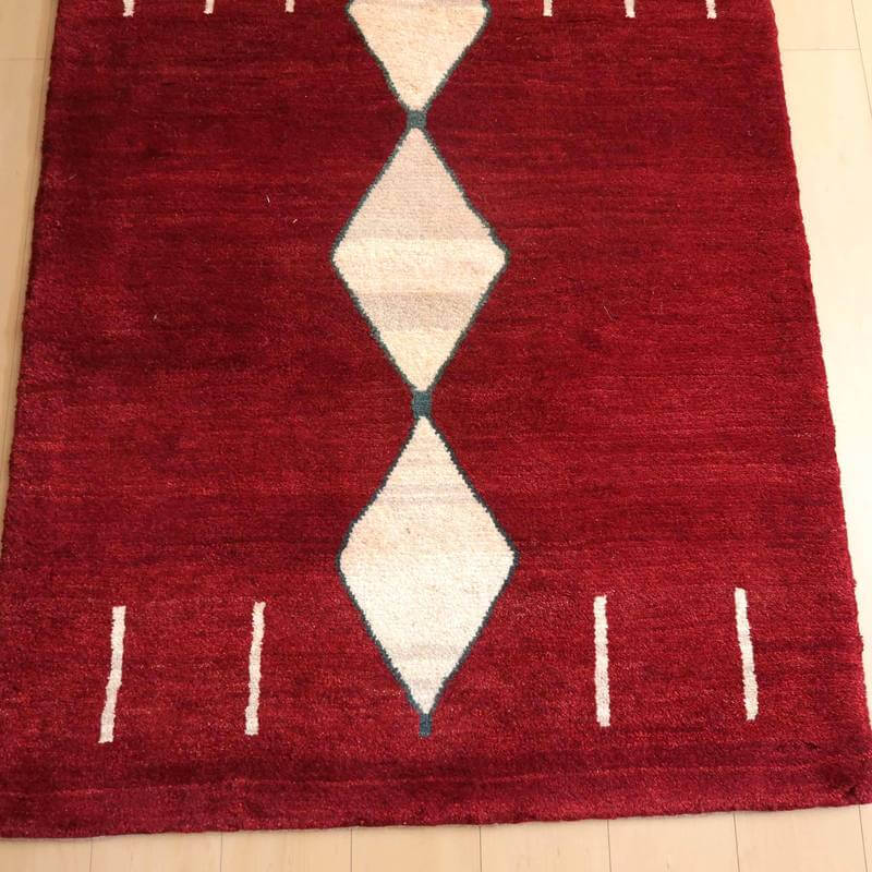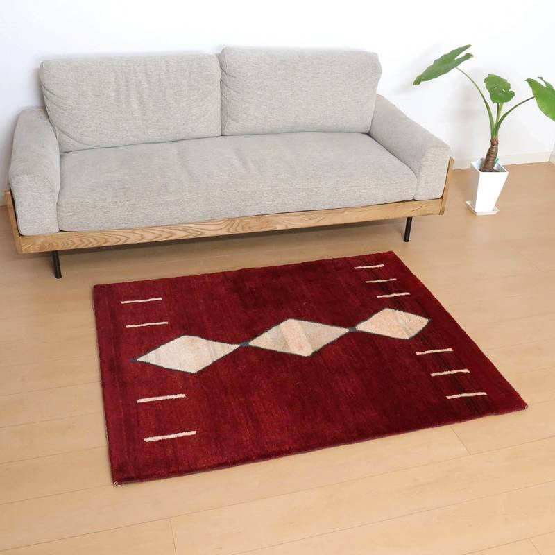 鮮やか過ぎない少し暗めの赤色でお部屋に馴染みやすい落ち着きのある雰囲気のギャッベ。連なったひし形のモチーフと縦に入ったラインがアクセントとなった、シンプルモダンなデザインです。