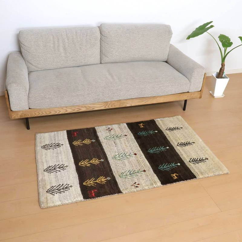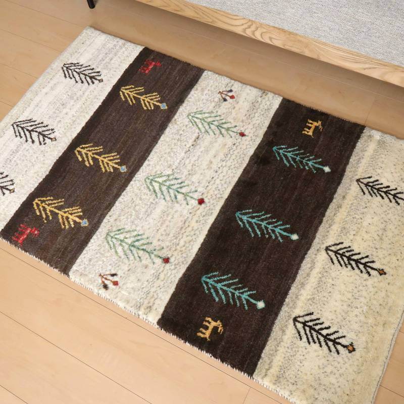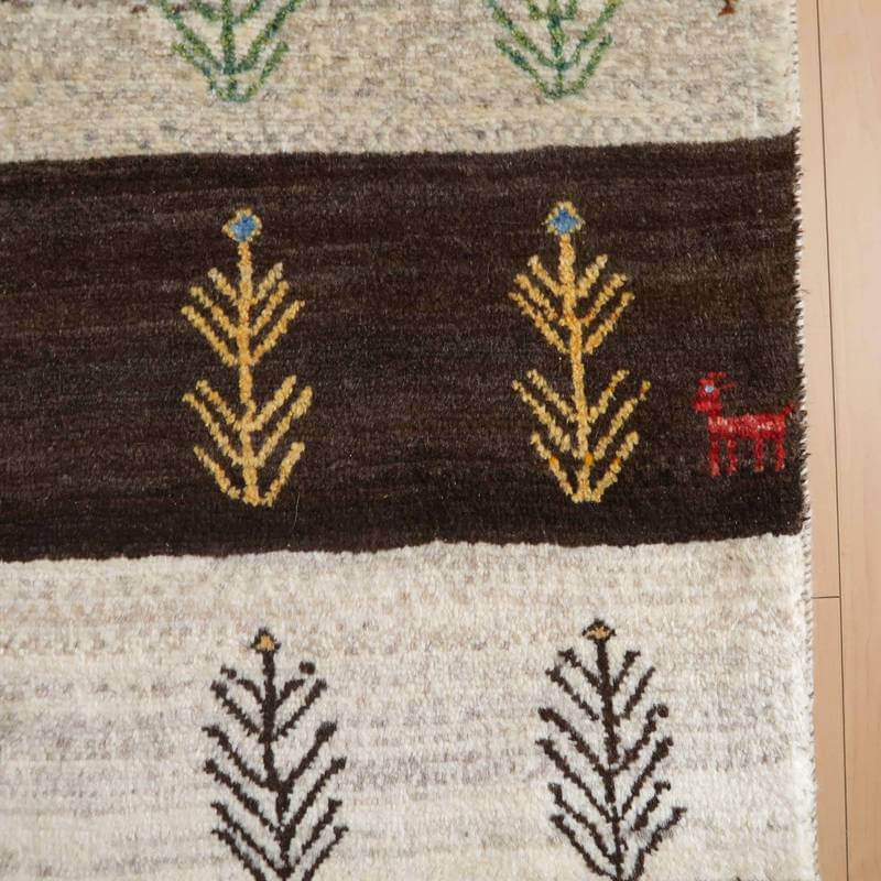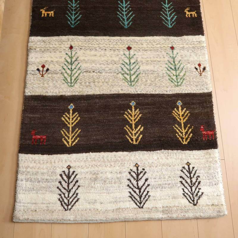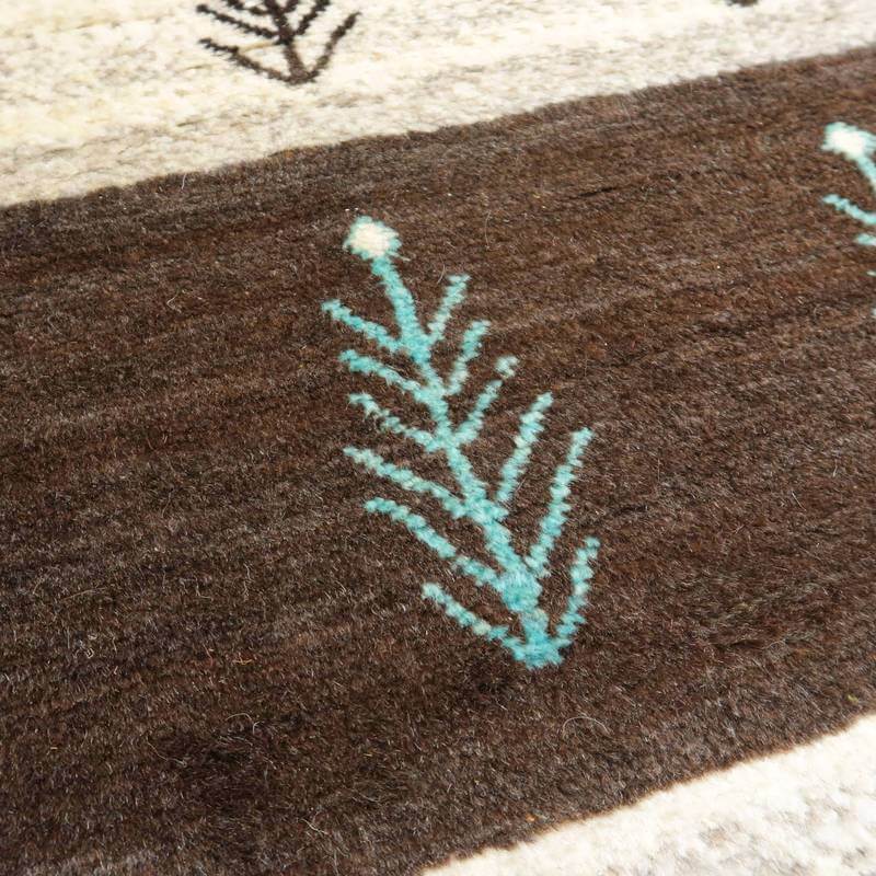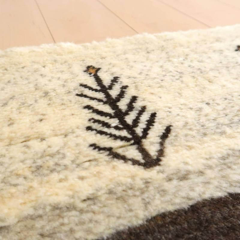 生成りとこげ茶色の、羊本来の毛色をそのまま活かした原毛を組み合わせたボーダーは、天然の色が楽しめるシンプルなデザインです。等間隔に並んだモチーフが彩を添えた明るい雰囲気のギャッベです。