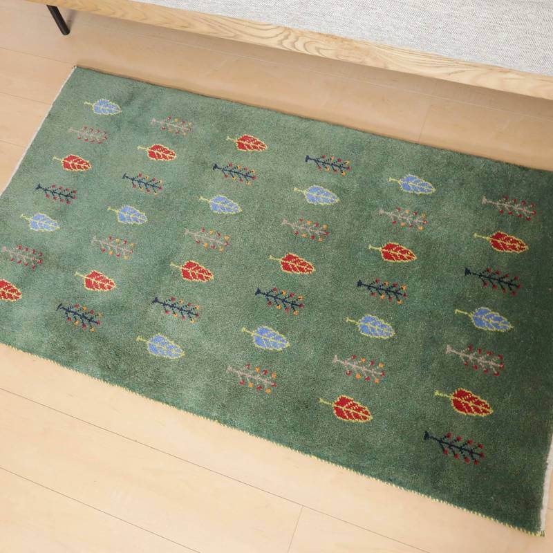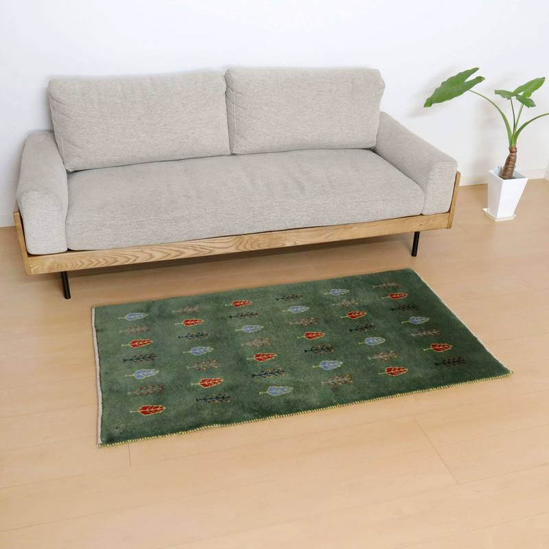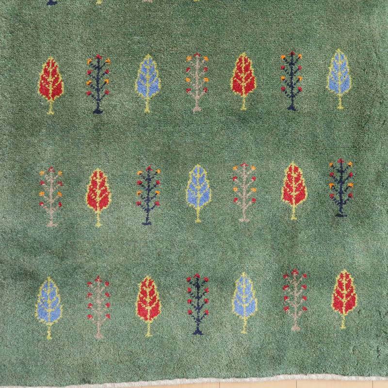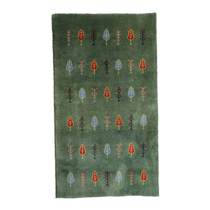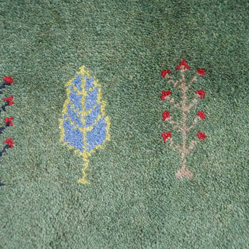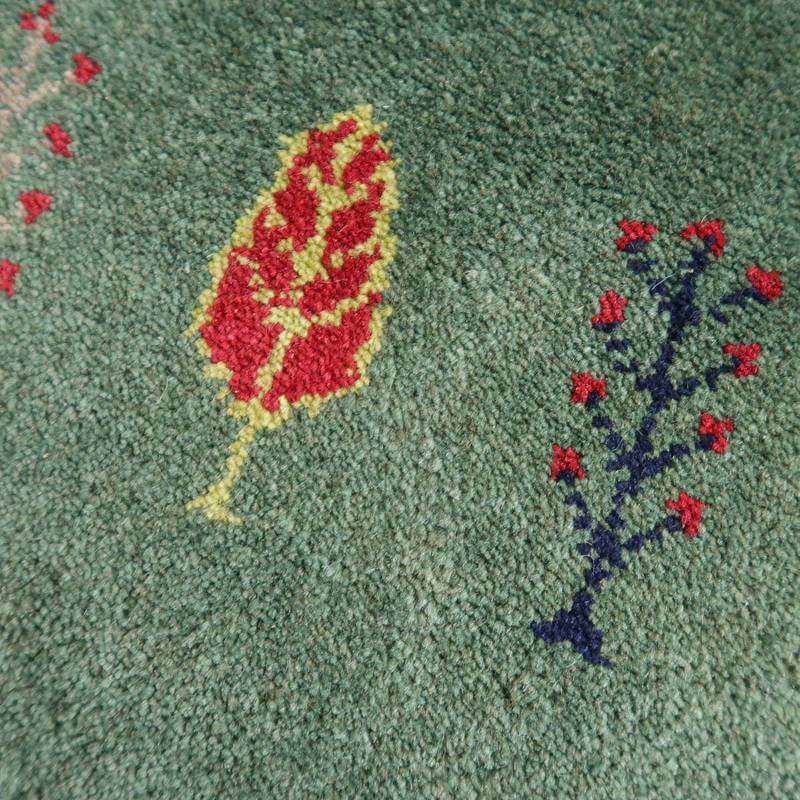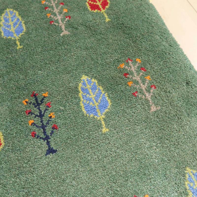 落ち着いたモスグリーンをベースに、赤やブルーやベージュの生命の木のモチーフが並んだ優しい雰囲気のギャッベです。