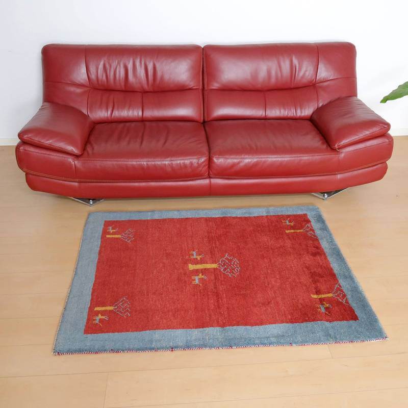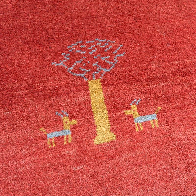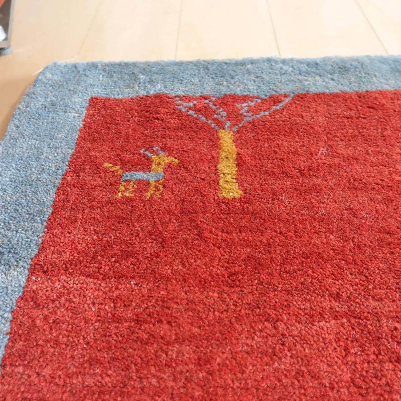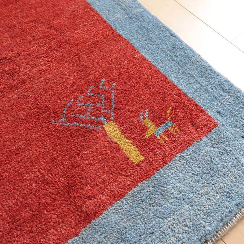 穏やかなレッドカラーにくすんだライトブルーの枠がついた明るい色合いのギャッベ。ユニークな形の生命の木とそこに集う動物たちに思わず笑みがこぼれるような愛嬌のあるデザインです。