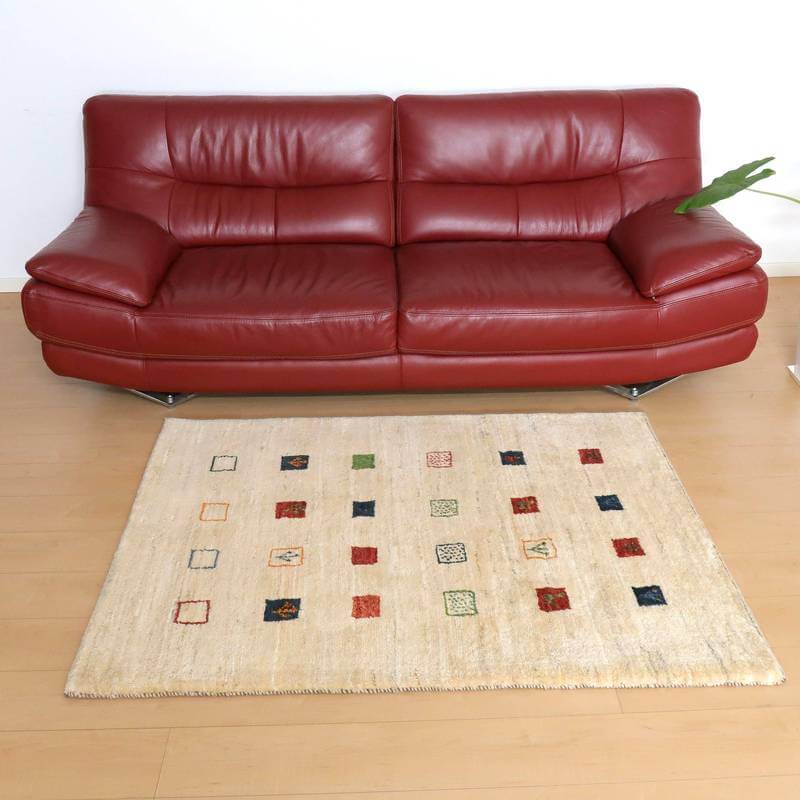 羊の毛色をそのまま活かした無染色の羊色のベースは、どんな場所にも似合うナチュラルな風合い。赤・青・緑・黄色の並んだ四角は、モチーフが入っていたり、ラインだけだったりと変化がついて、シンプルながら遊び心のあるデザインとなっています。