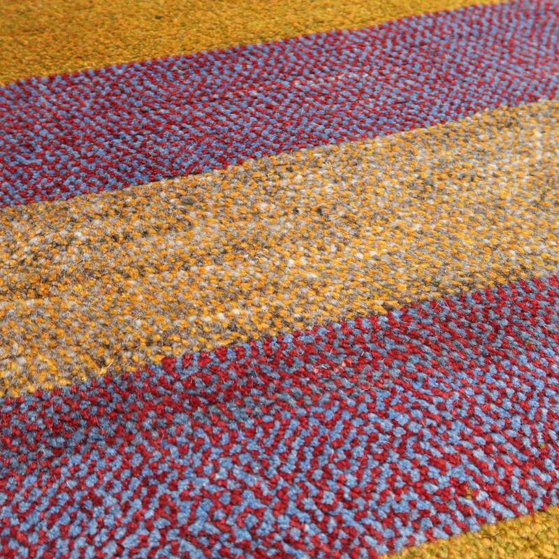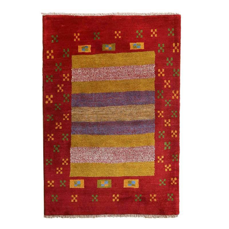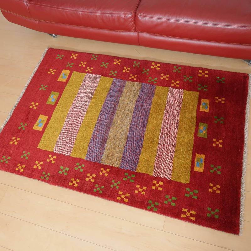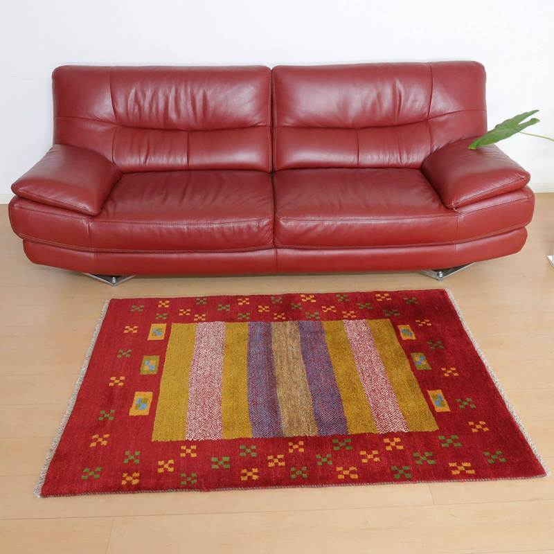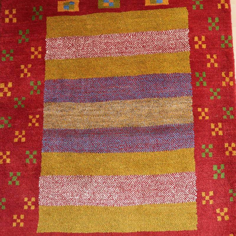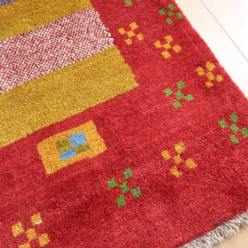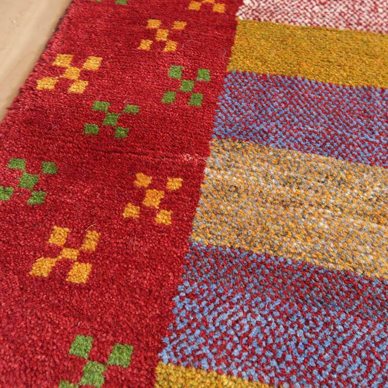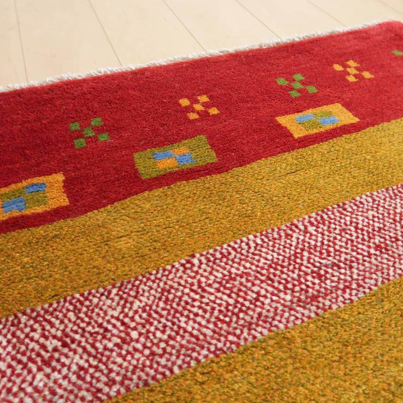 赤・青・くすんだ黄色・羊の原毛カラーを組み合わせたボーダー柄には、色糸を変えて重ねた点々柄が入って、ギャッベらしい自由な雰囲気が感じられます。赤の太い枠には花のモチーフが入って明るい雰囲気。