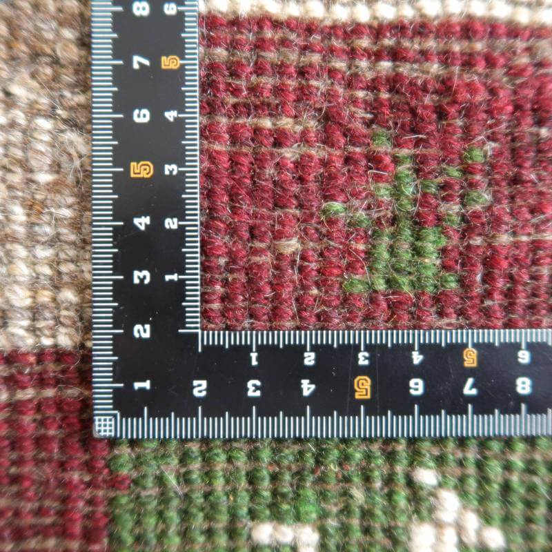 生成りやグレーなど羊の毛色をそのまま活かした無染色のウールのナチュラルな色にエンジや紺、緑、青の濃いめのくすみカラーの四角が並んだタイルデザイン。シックな色使いで落ち着いた雰囲気です。ふっくら厚手の毛足。左端で150センチ、右端で147センチと長さに手織りならではの少しの差がございます。