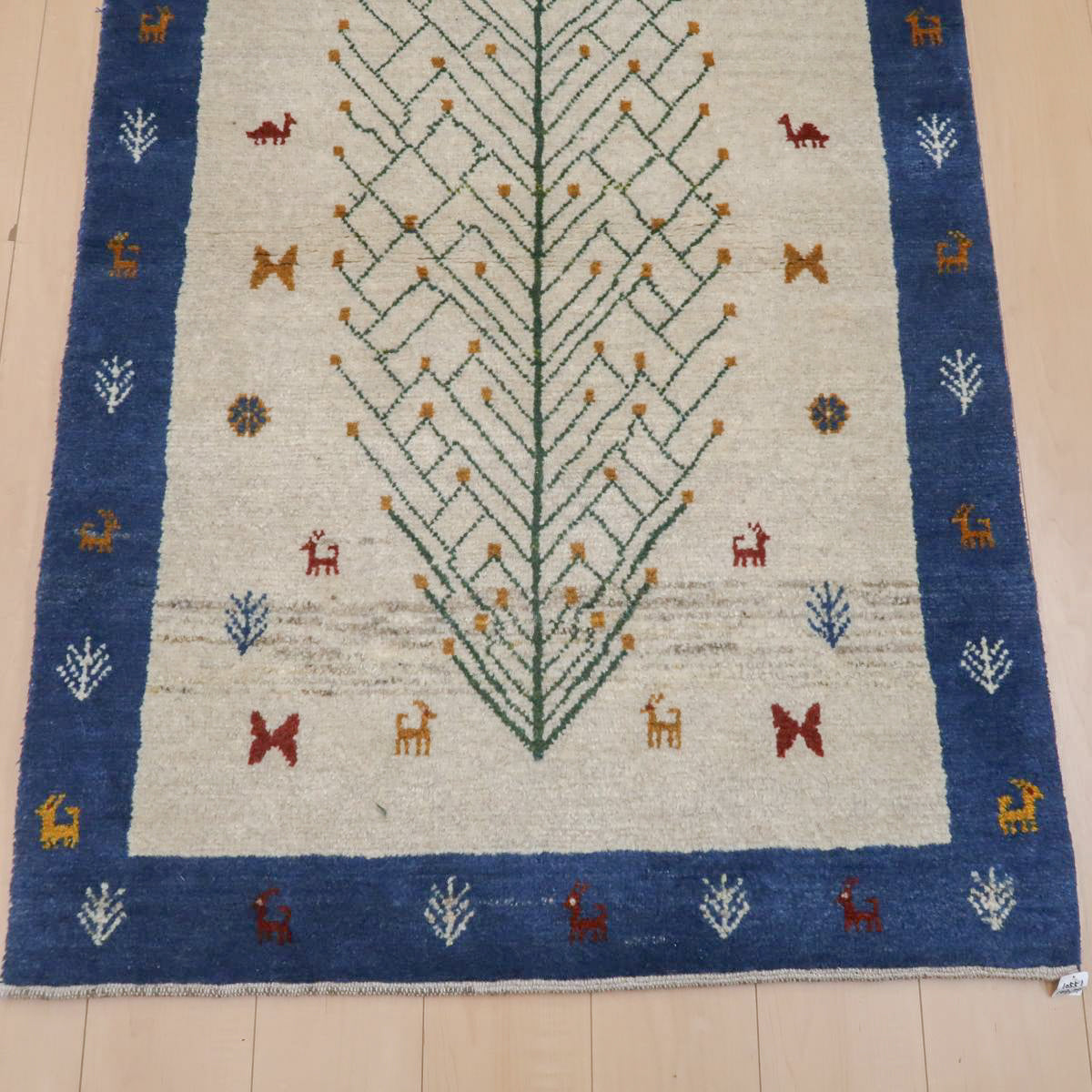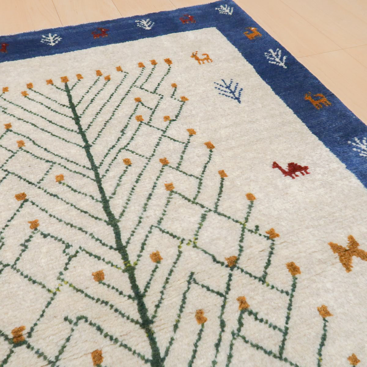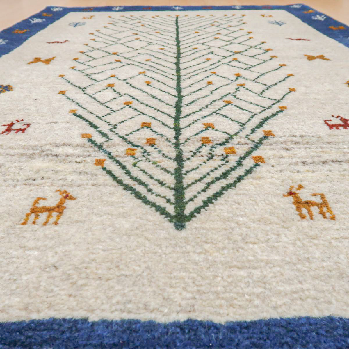 優しい色味の生成りと青が基調のギャッベ。中央には緑色で生命の木のモチーフが描かれ、その周囲にはカラフルで小さなモチーフが散りばめられて、楽しい雰囲気を演出しています。青の縁取りは全体を引き締め、清々しく落ち着いた印象を与えてくれます。可愛らしさと自然の温かみが感じられる一枚です。