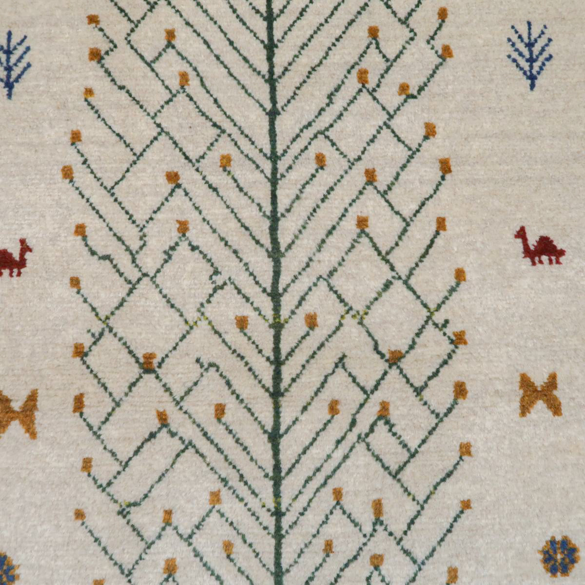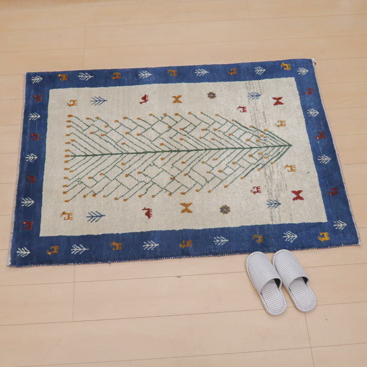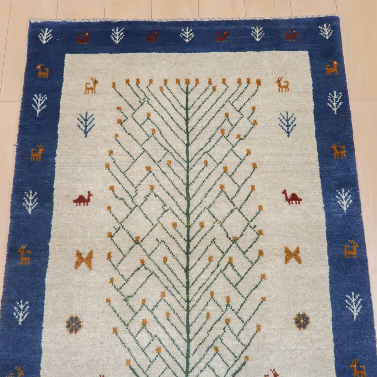 優しい色味の生成りと青が基調のギャッベ。中央には緑色で生命の木のモチーフが描かれ、その周囲にはカラフルで小さなモチーフが散りばめられて、楽しい雰囲気を演出しています。青の縁取りは全体を引き締め、清々しく落ち着いた印象を与えてくれます。可愛らしさと自然の温かみが感じられる一枚です。