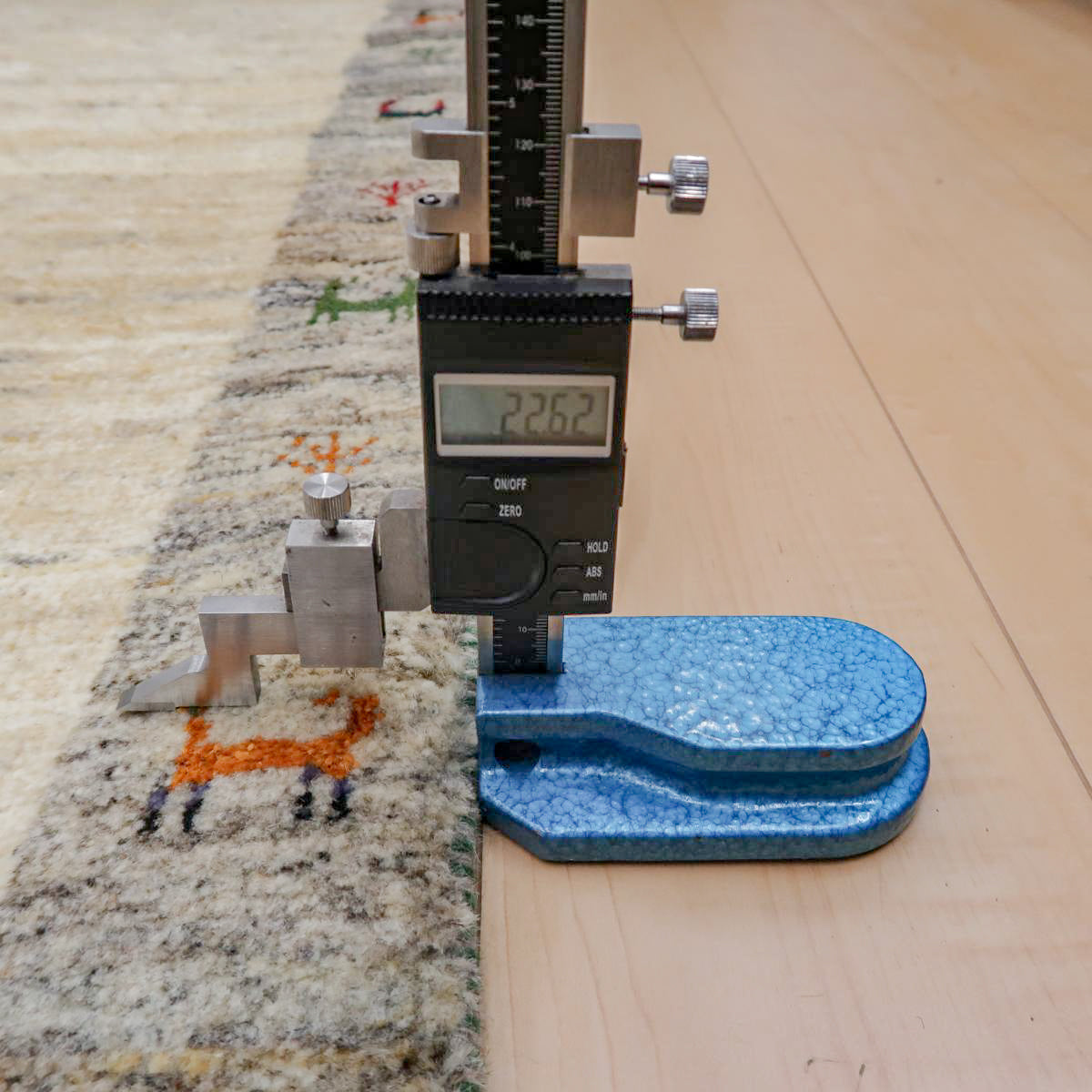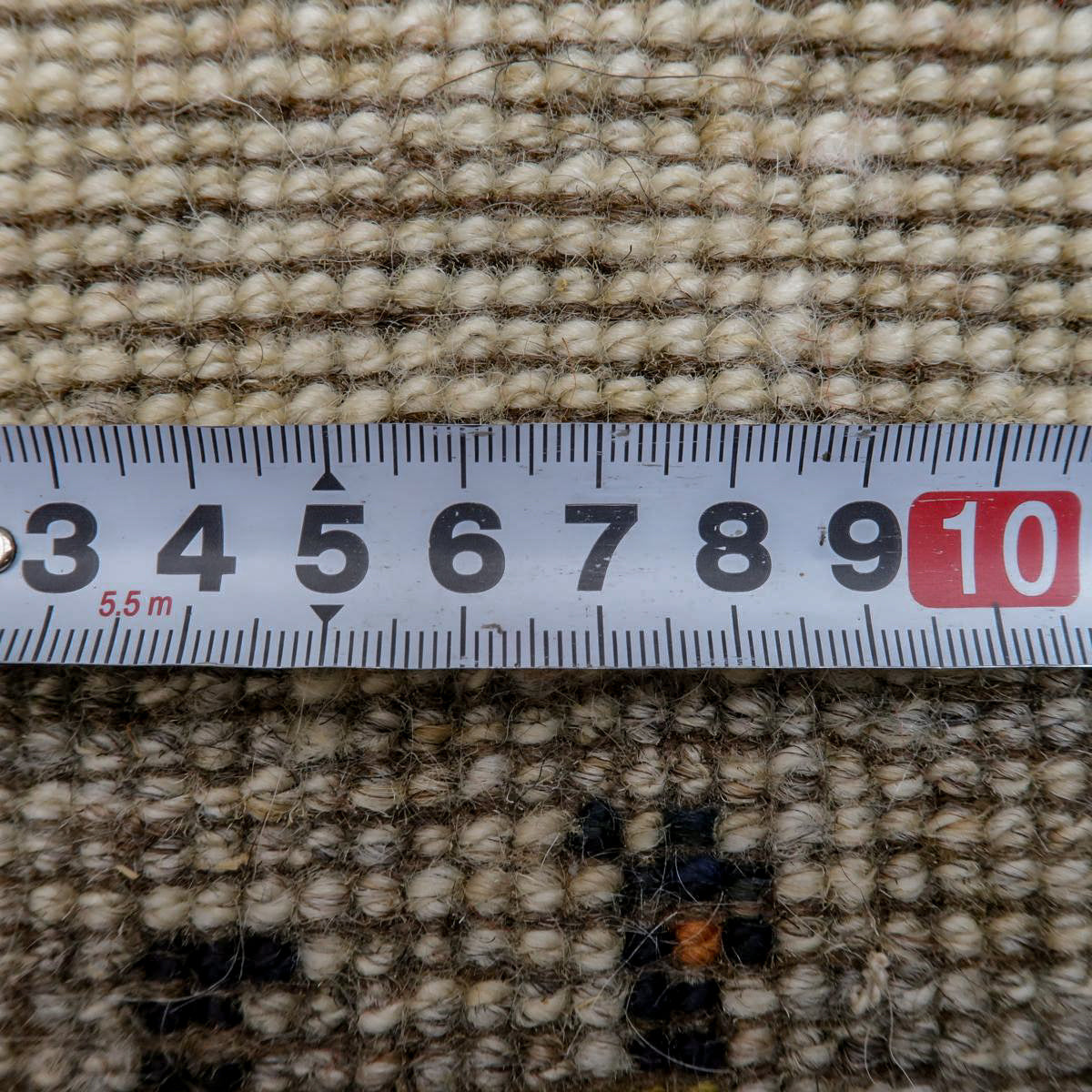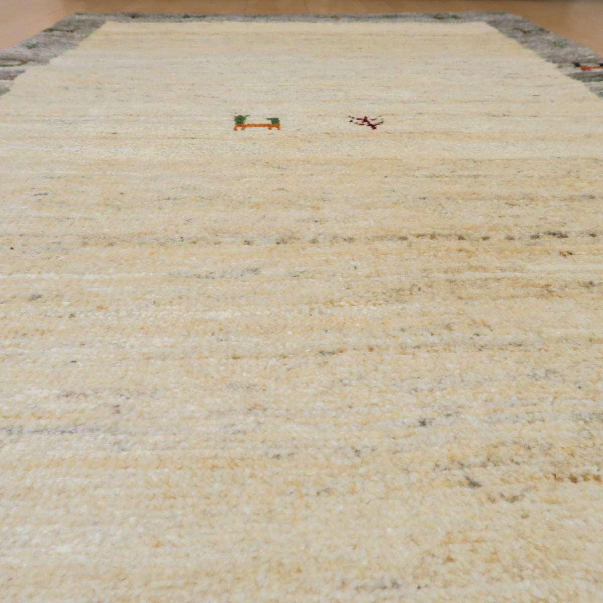 優しい生成りを基調にした、シンプルなギャッベです。赤や緑、黄色の小さなモチーフが、明るさと可愛らしさをプラスしています。灰色のアブラシ(グラデーション)の縁取りが程よく全体を引き締め、穏やかでリラックスした雰囲気をより一層感じさせます。シンプルでありながらも温かみのある、素朴な風合いのギャッベです。