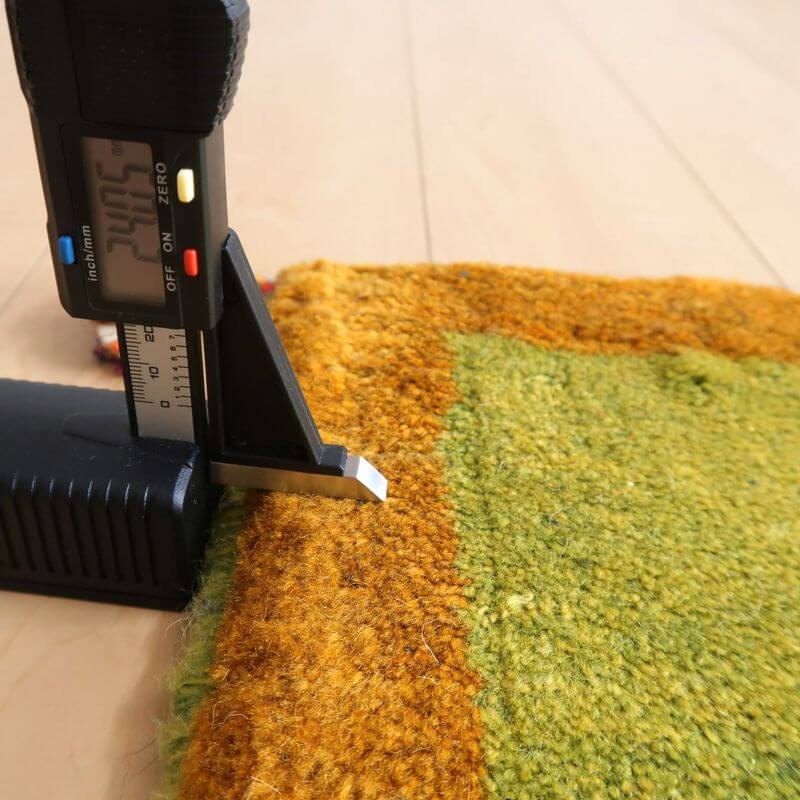 開封すぐの撮影でシワが見える写真があります。照明の違いで色合いが多少違って見えます。また、ギャッベは毛足に向きがあるので、見る方向で、明るかったり暗かったりも見えます。