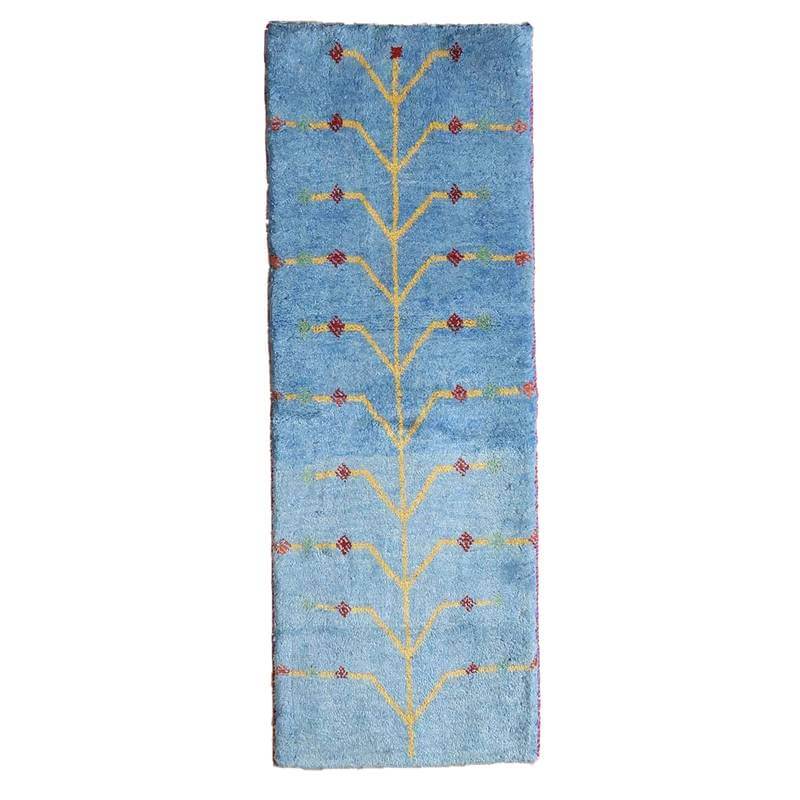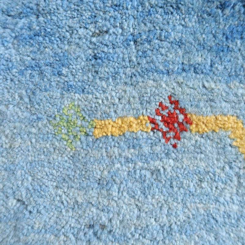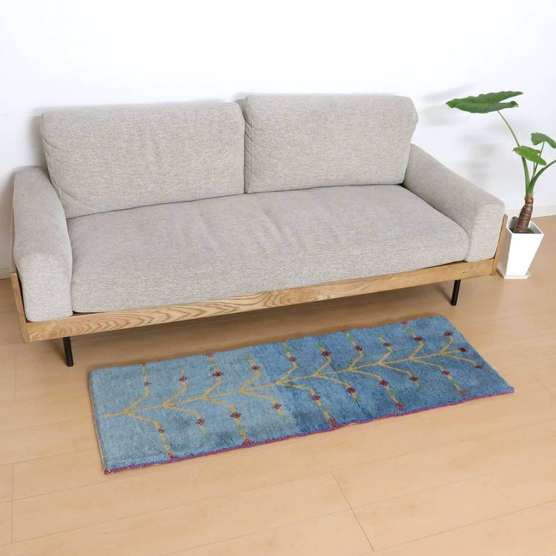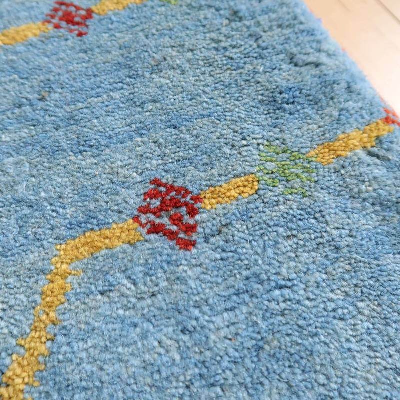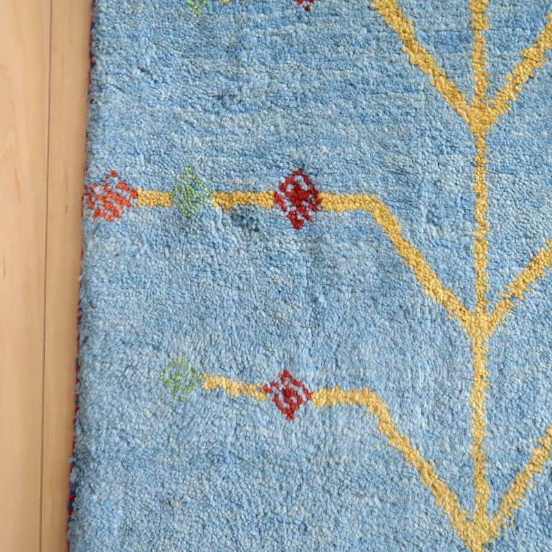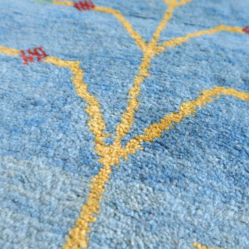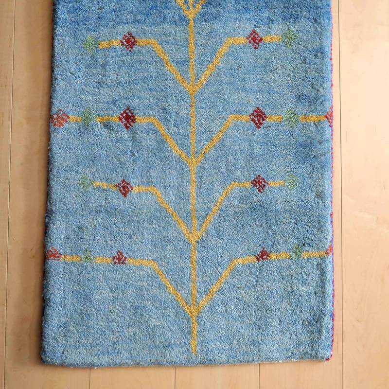 空を連想させるブルーが爽やかなギャッベ。生命の木が真っすぐに伸びて生き生きとした雰囲気です。