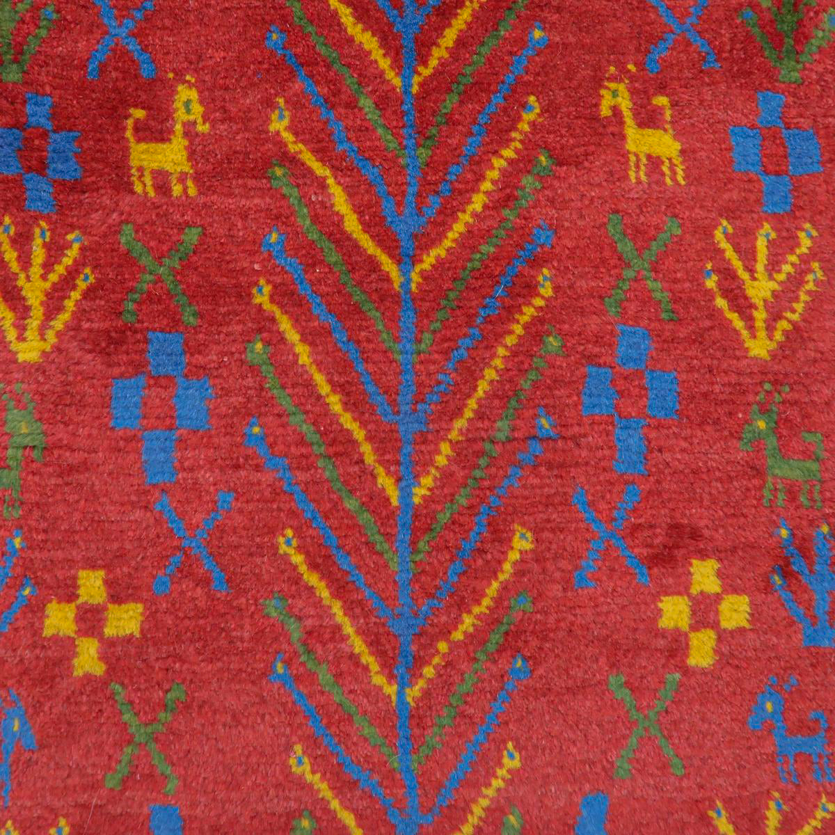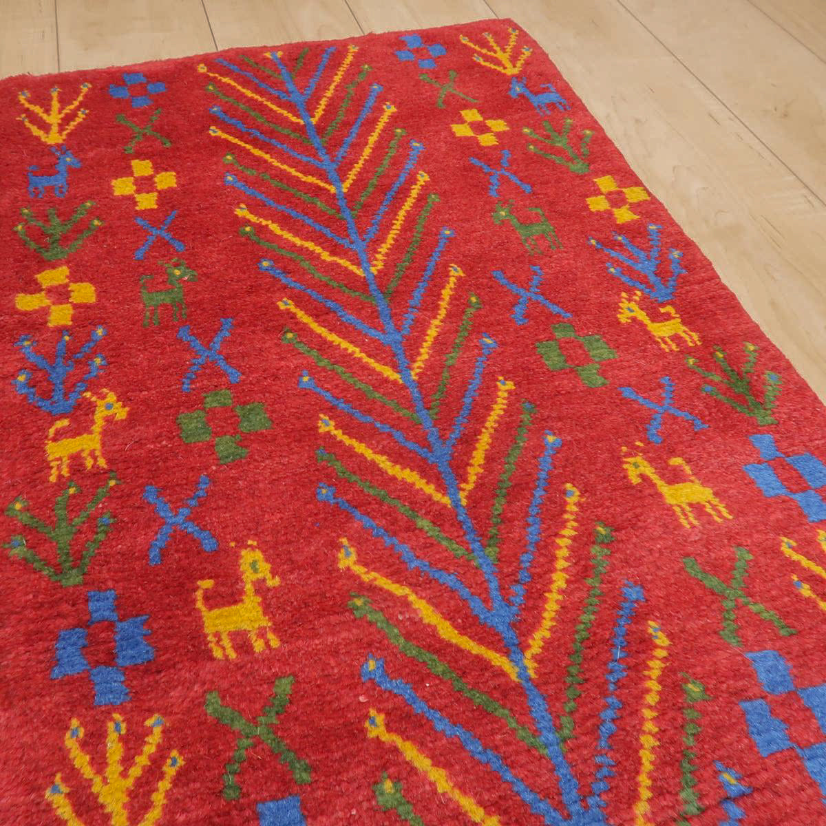 赤の鮮やかな色合いが目を引きます。カラフルな動植物モチーフが規則的に描かれ、活気のある雰囲気。中央には堂々とした生命の木が配され、力強さも表現しています。全体的にカラフルでありながら調和のとれたデザインで、空間にエネルギーと明るさをもたらしてくれる一枚です。