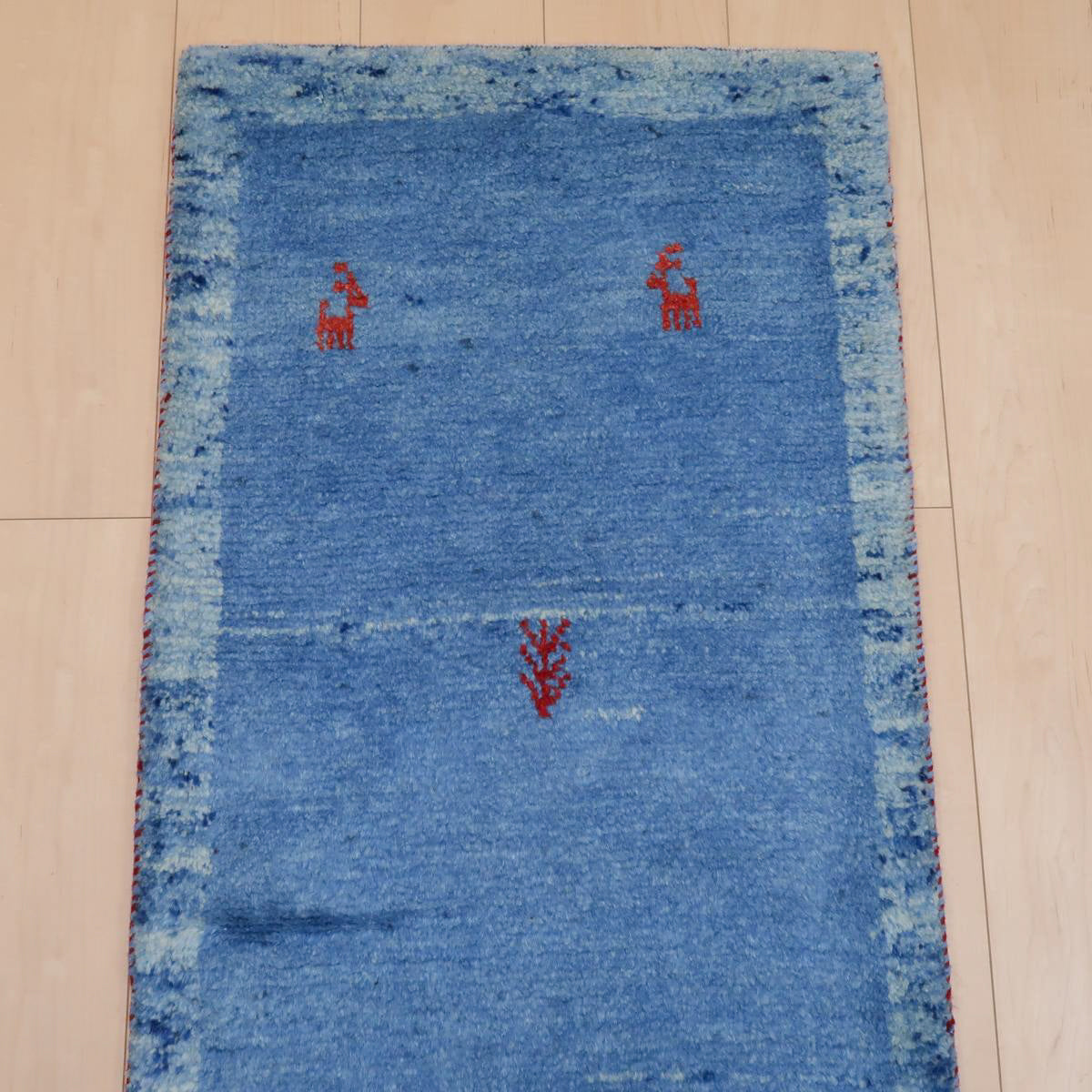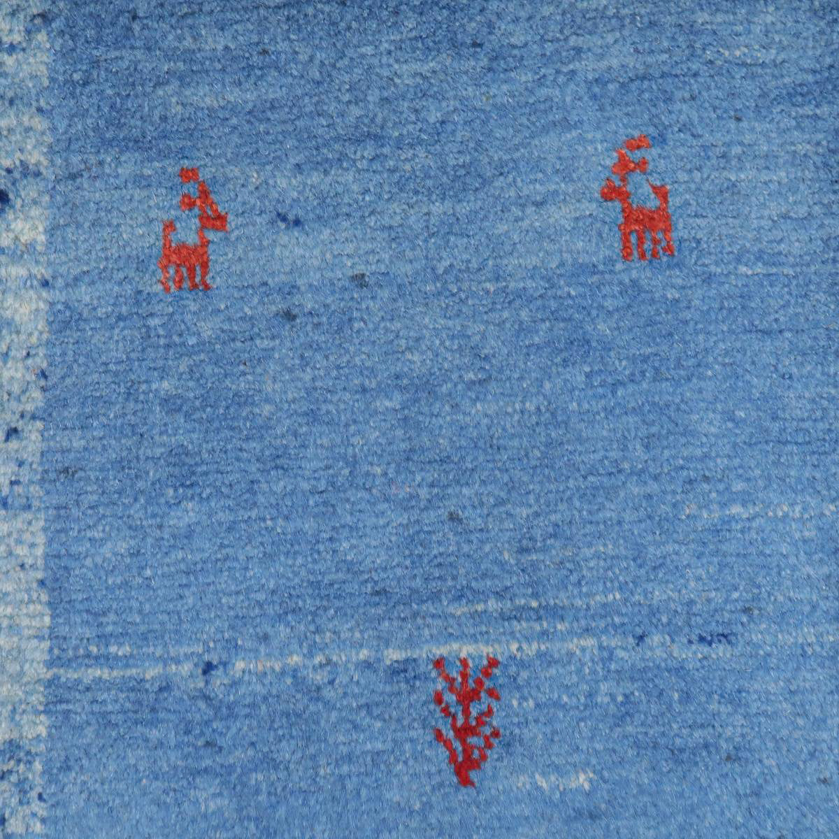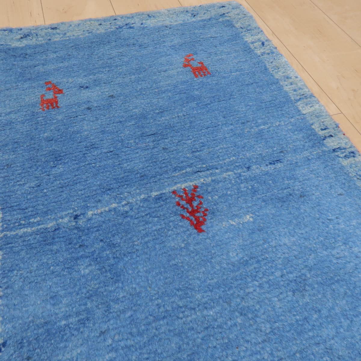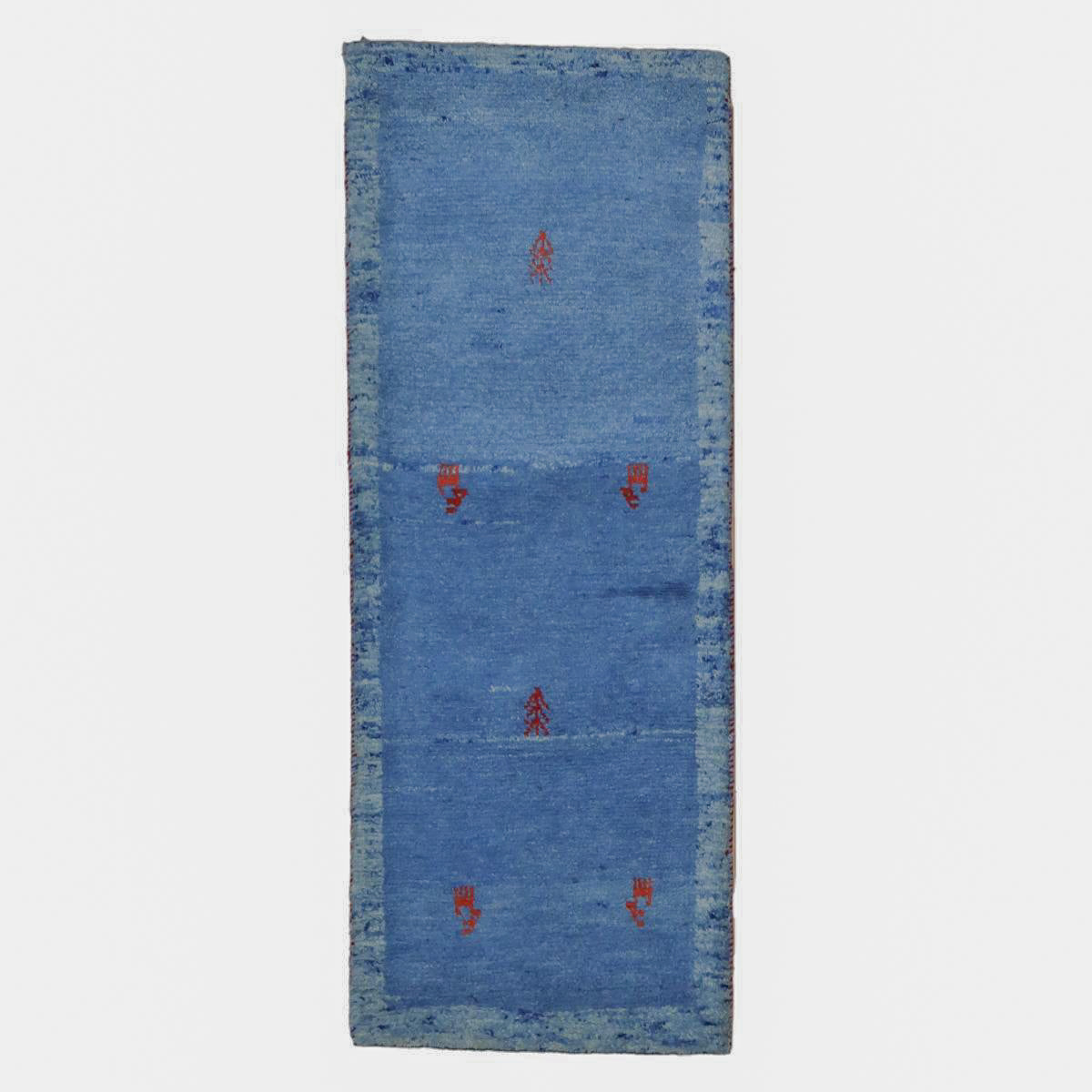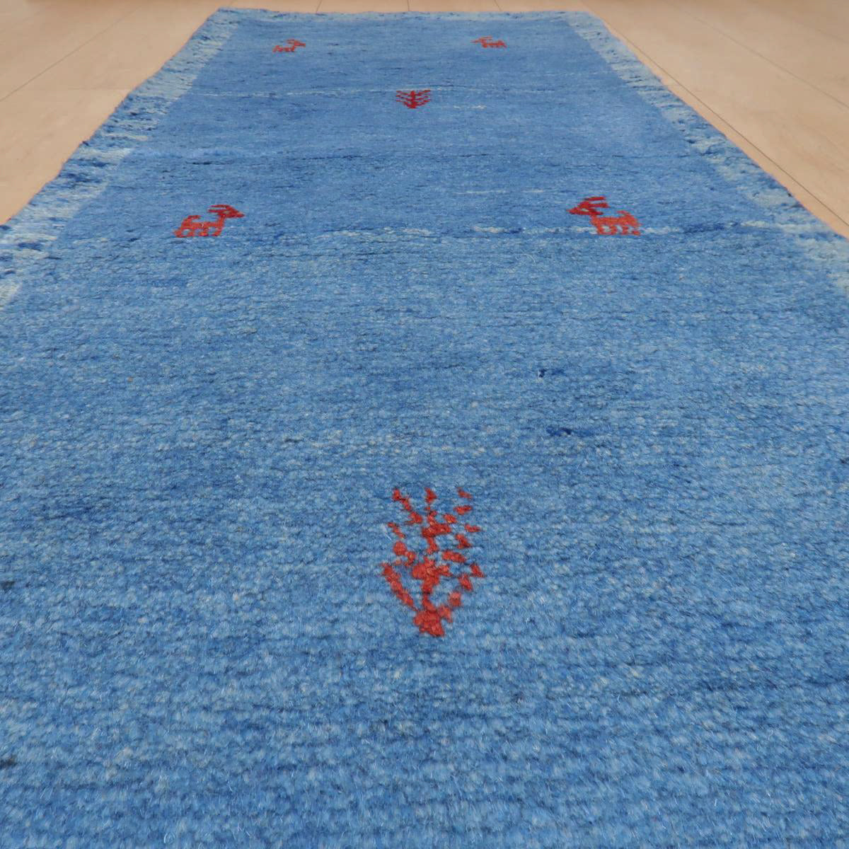 優しい色合いの青を基調にしたギャッベ。同系色のムラ織の縁取りが、美しく全体を引き締めています。赤の動植物モチーフがアクセントとなり、シンプルなデザインに可愛らしさを添えています。お部屋に敷くことで、空間に爽やかさと温かみをもたらしてくれる一枚です。