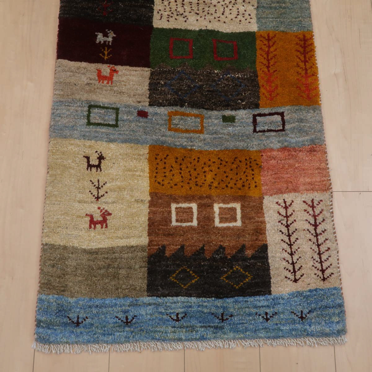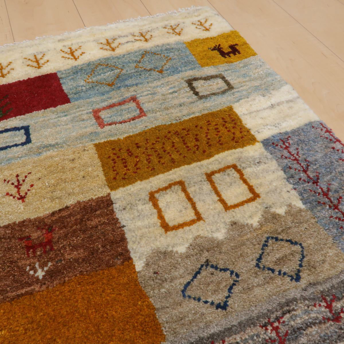 カラフルな四角の模様がパッチワークのように連なった、楽しいギャッベ。優しい青、深い赤や黄色、茶色など、様々な色がバランスよく配置され、各部分に色々なモチーフが描かれています。色彩豊かでありながらも落ち着いた色味と調和の取れたデザインで、お部屋に温かみと個性をプラスしてくれる一枚です。