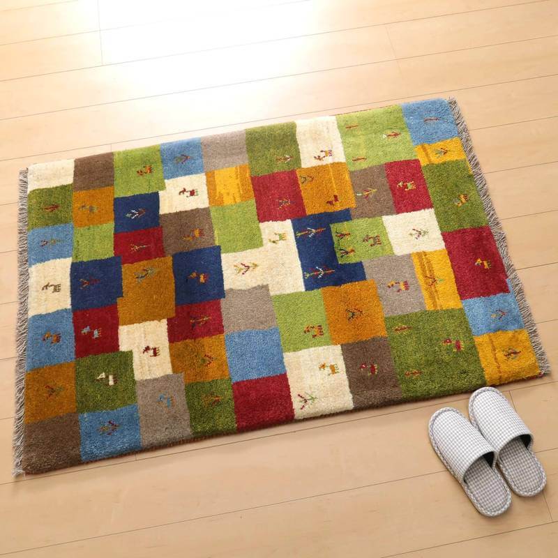 開封すぐの撮影でシワが見える写真があります。照明の違いで色合いが多少違って見えます。また、ギャッベは毛足に向きがあるので、見る方向で、明るかったり暗かったりも見えます。