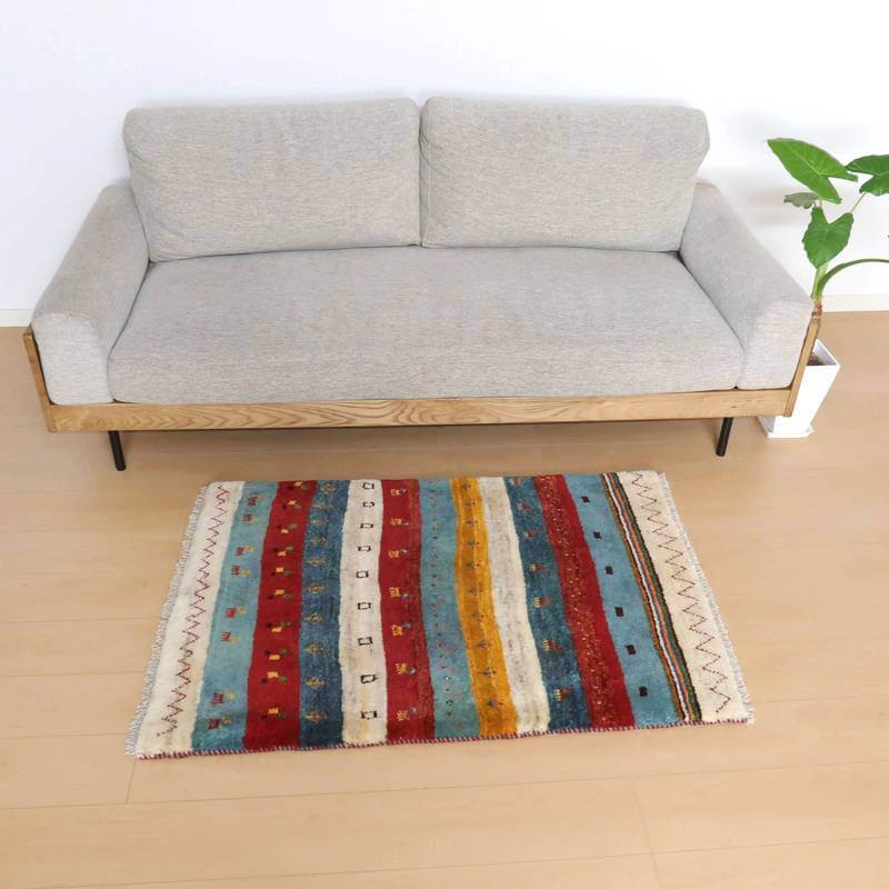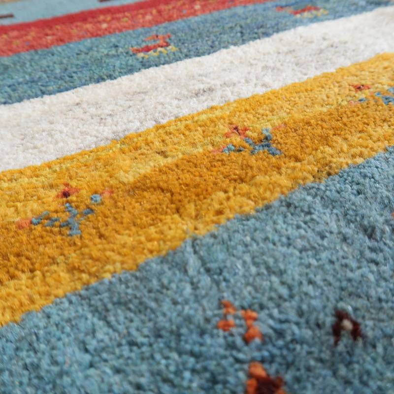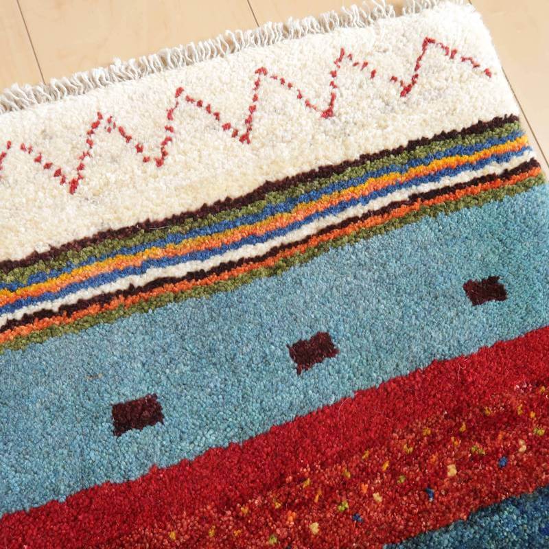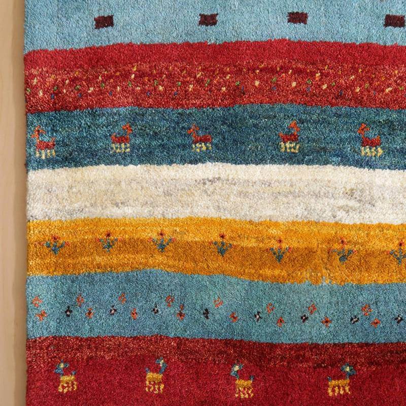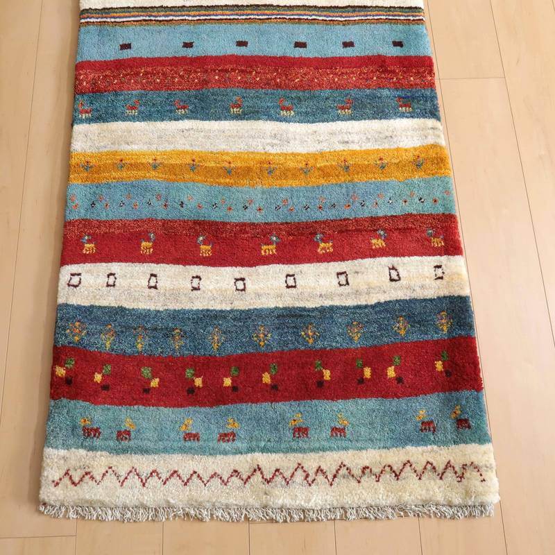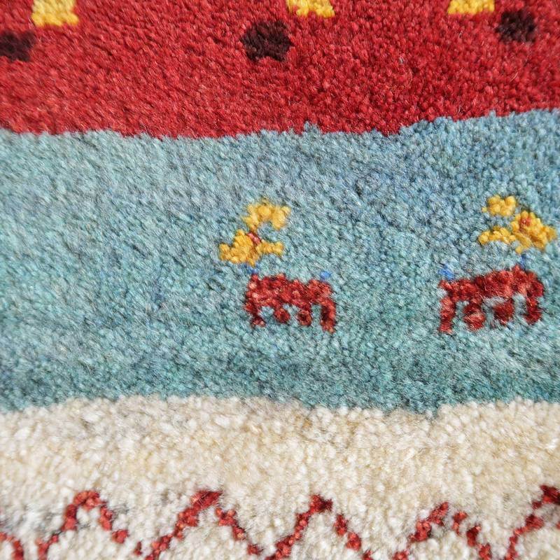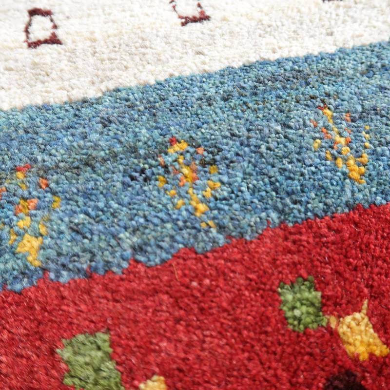 染色していない羊の原毛のやわらかなオフホワイトと濃淡のブルー、エンジと黄色のボーダー柄。動物や植物のモチーフが並んだ爽やかな雰囲気のギャッベです。むっくりと厚手で、目の詰まった艶のある毛足です。