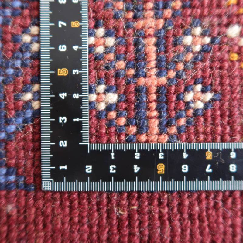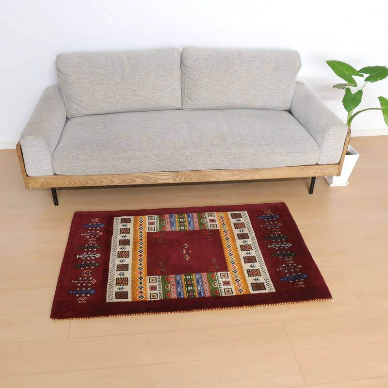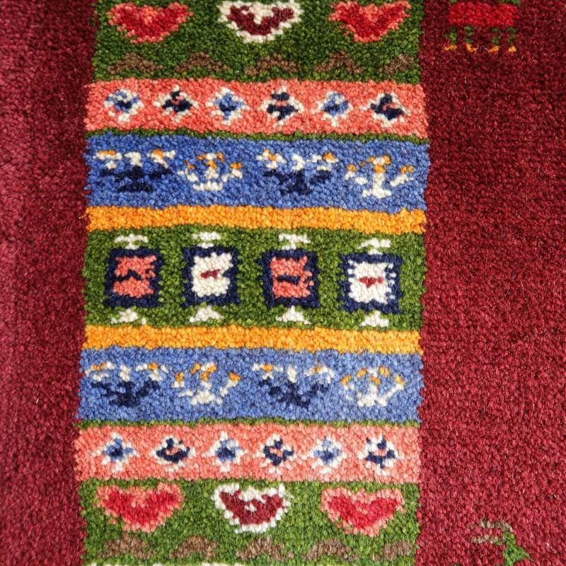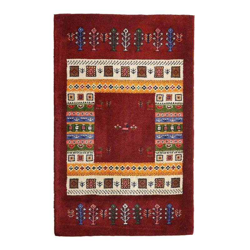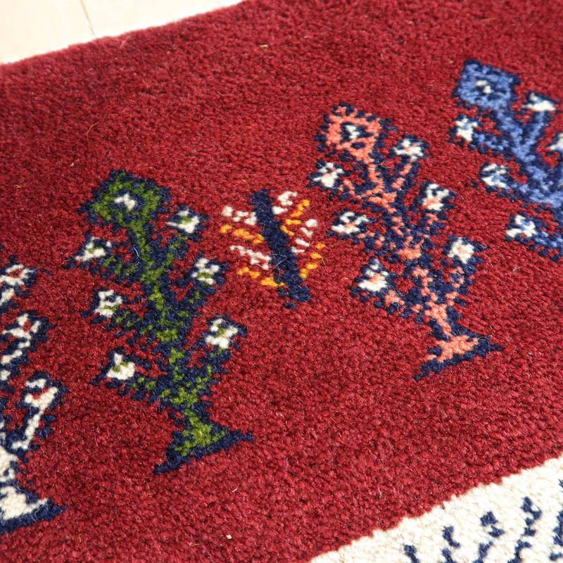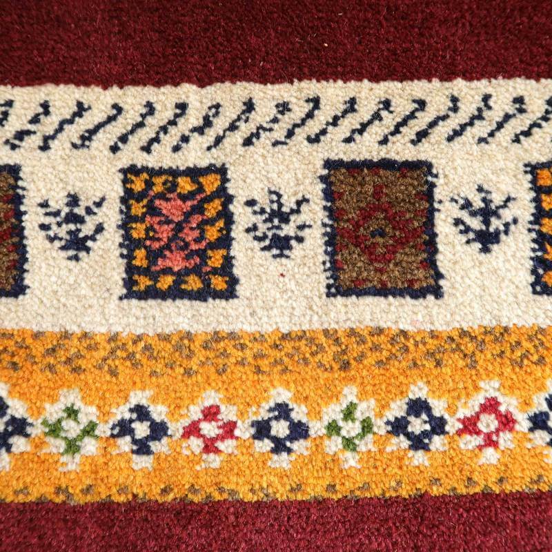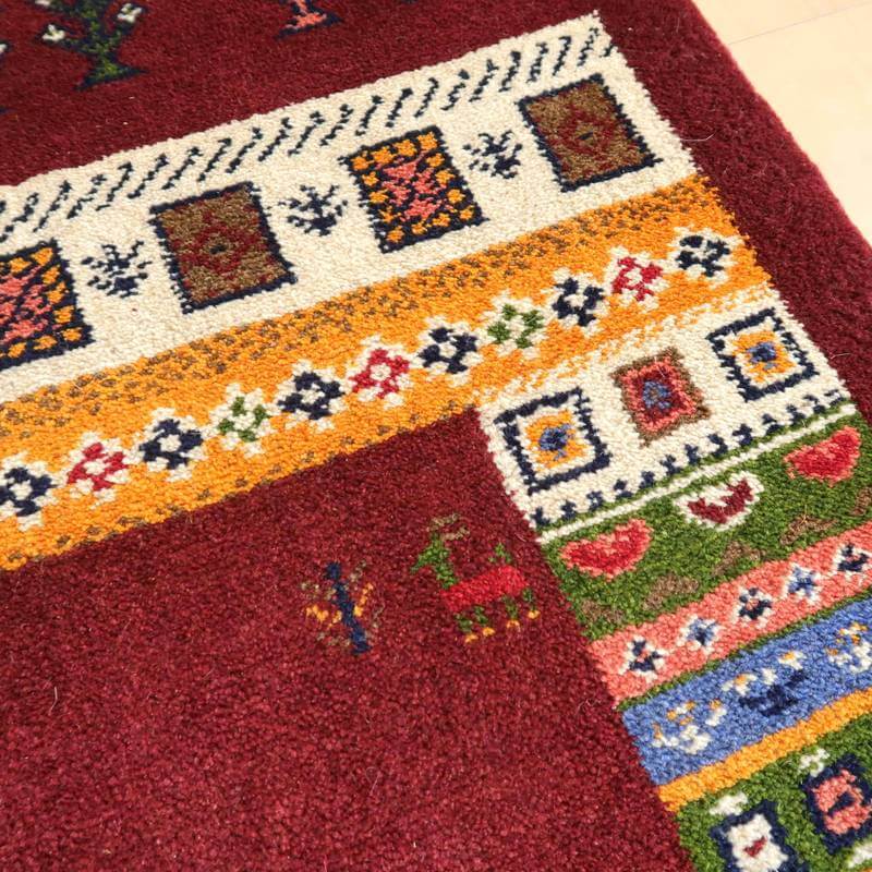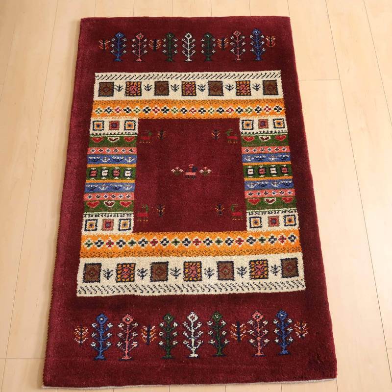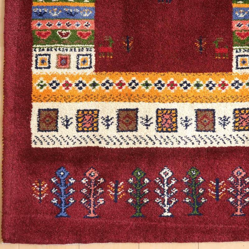 ベースとなっている深めのワインレッドは落ち着きのあるシックな色合い。オフホワイト・黄・緑・青・ピンクをカラフルに合わせた枠と、生命の木や幾何学模様、花などのモチーフが可愛い雰囲気を作っています。むっくりと厚手で、目の詰まった高品質のギャッベです。
