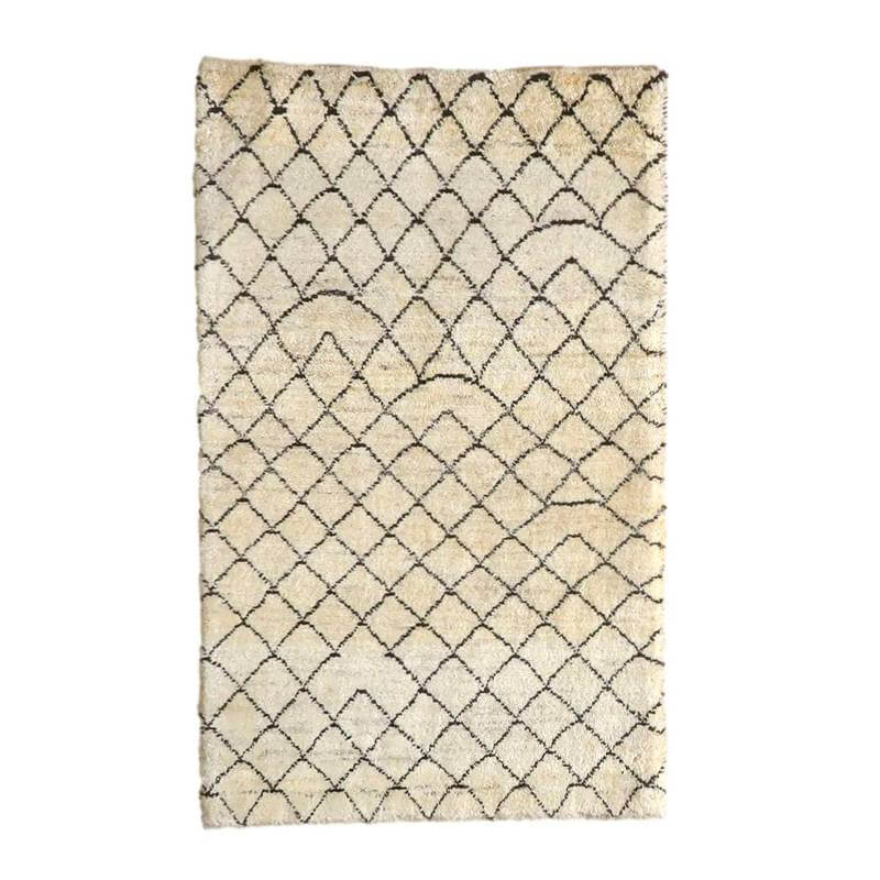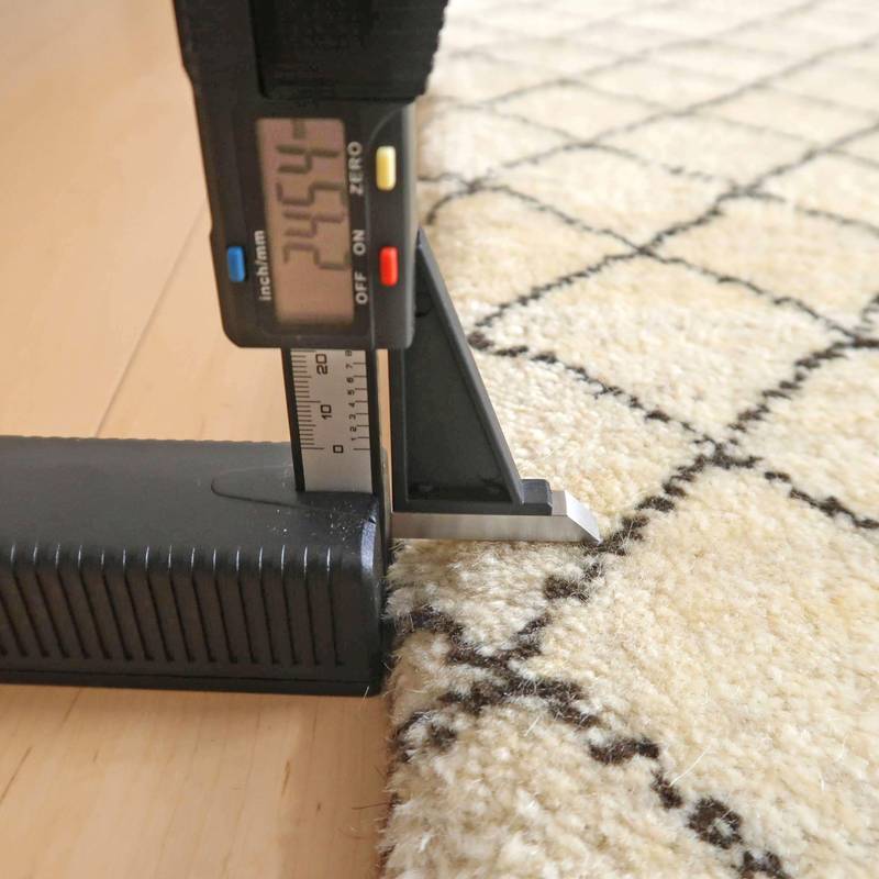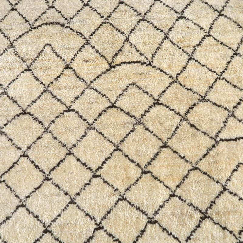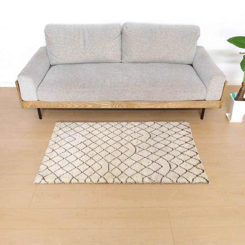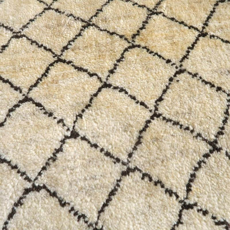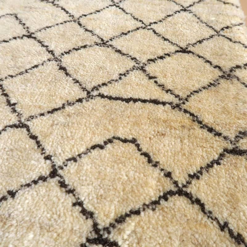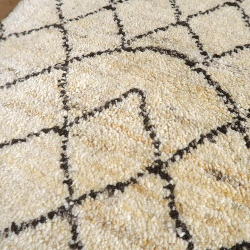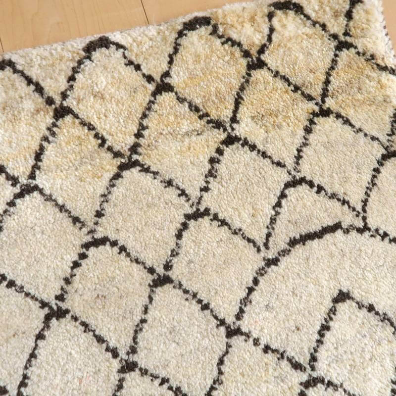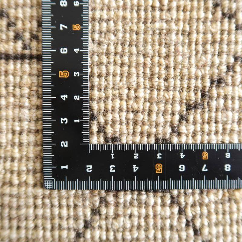 やんわりアブラシ(色むらのグラデーション)の入った生成りカラーにこげ茶のラインが交差するデザインは、全て羊の毛色をそのまま活かした無染色の原毛を使用してナチュラルな雰囲気が大きく感じられます。むっくりと厚手の生地です。