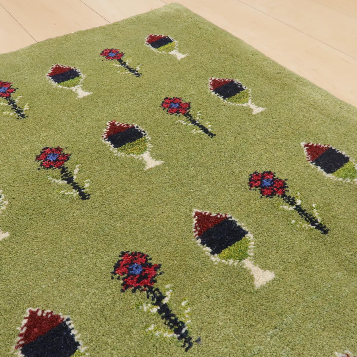落ち着いた緑の背景に、モチーフが並んでいて自然を感じさせるデザインです。モチーフの一つ一つが手作業による綺麗で丁寧な事を感じさせます。