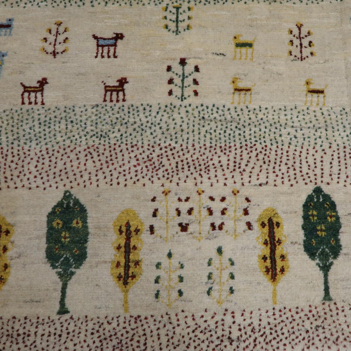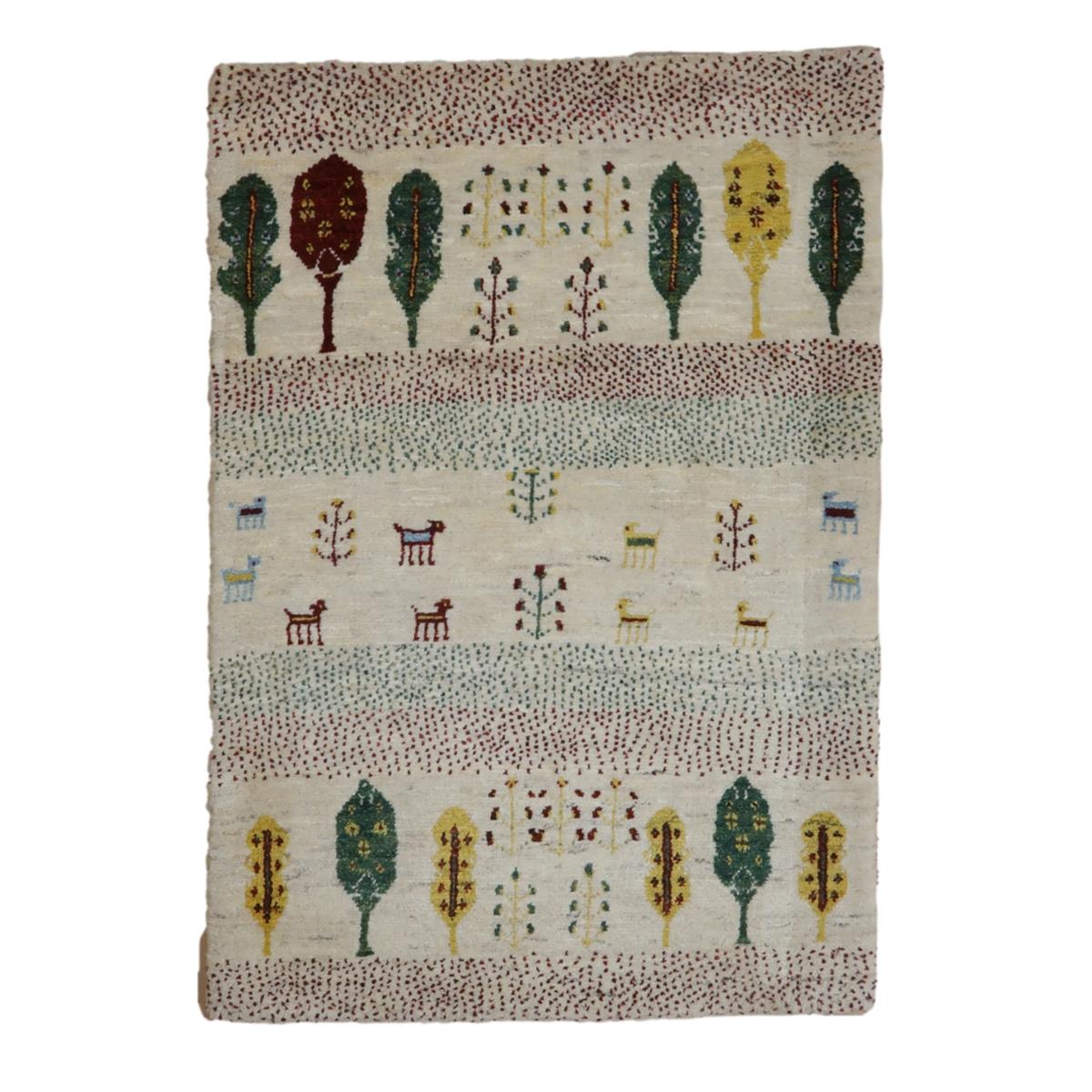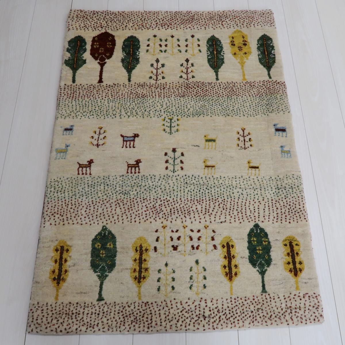穏やかな色を特徴としたこの絨毯には、緑、黄色、茶色の木が並び、その間には小さな動物や植物のモチーフが描かれています。