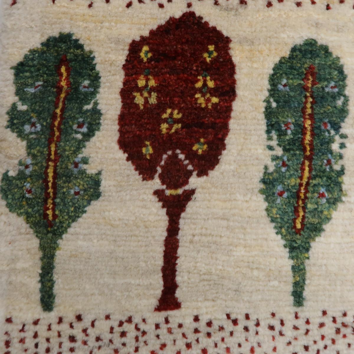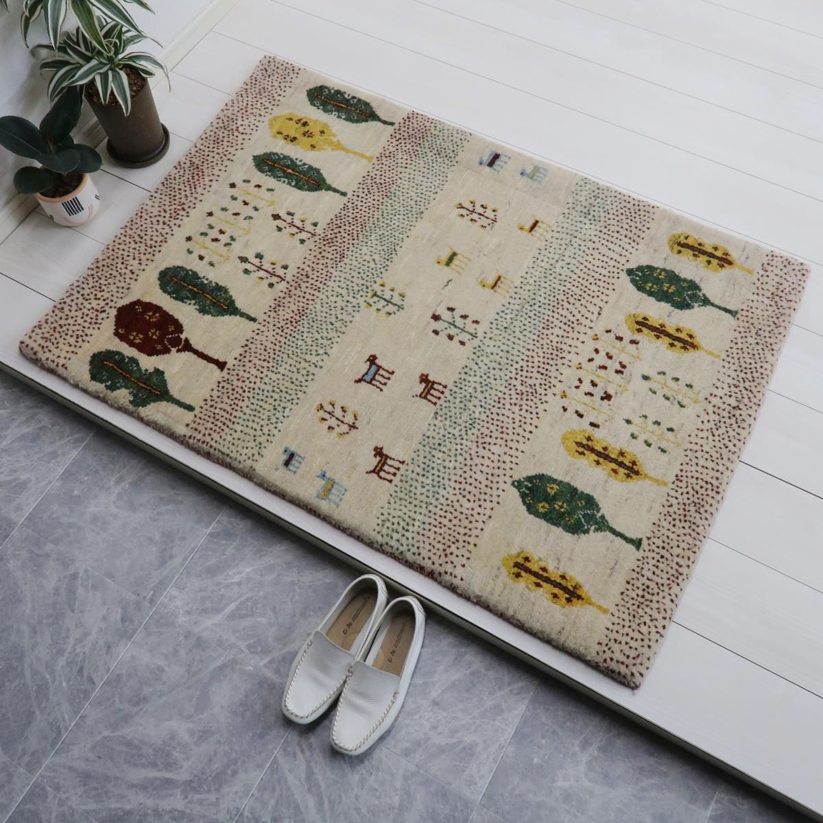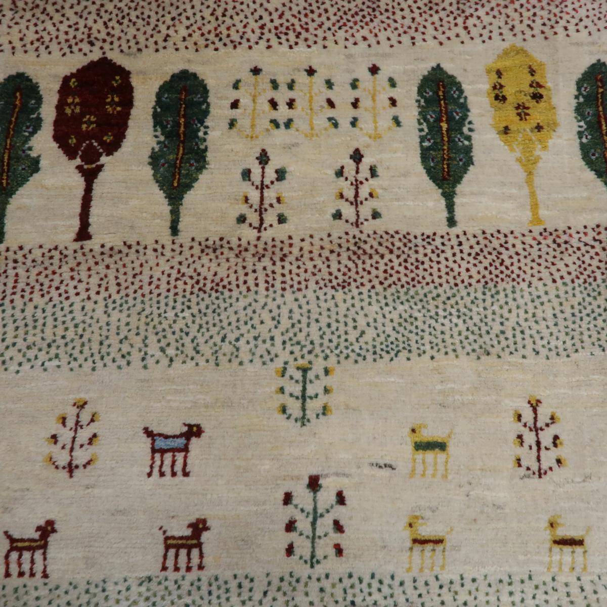 穏やかな色を特徴としたこの絨毯には、緑、黄色、茶色の木が並び、その間には小さな動物や植物のモチーフが描かれています。