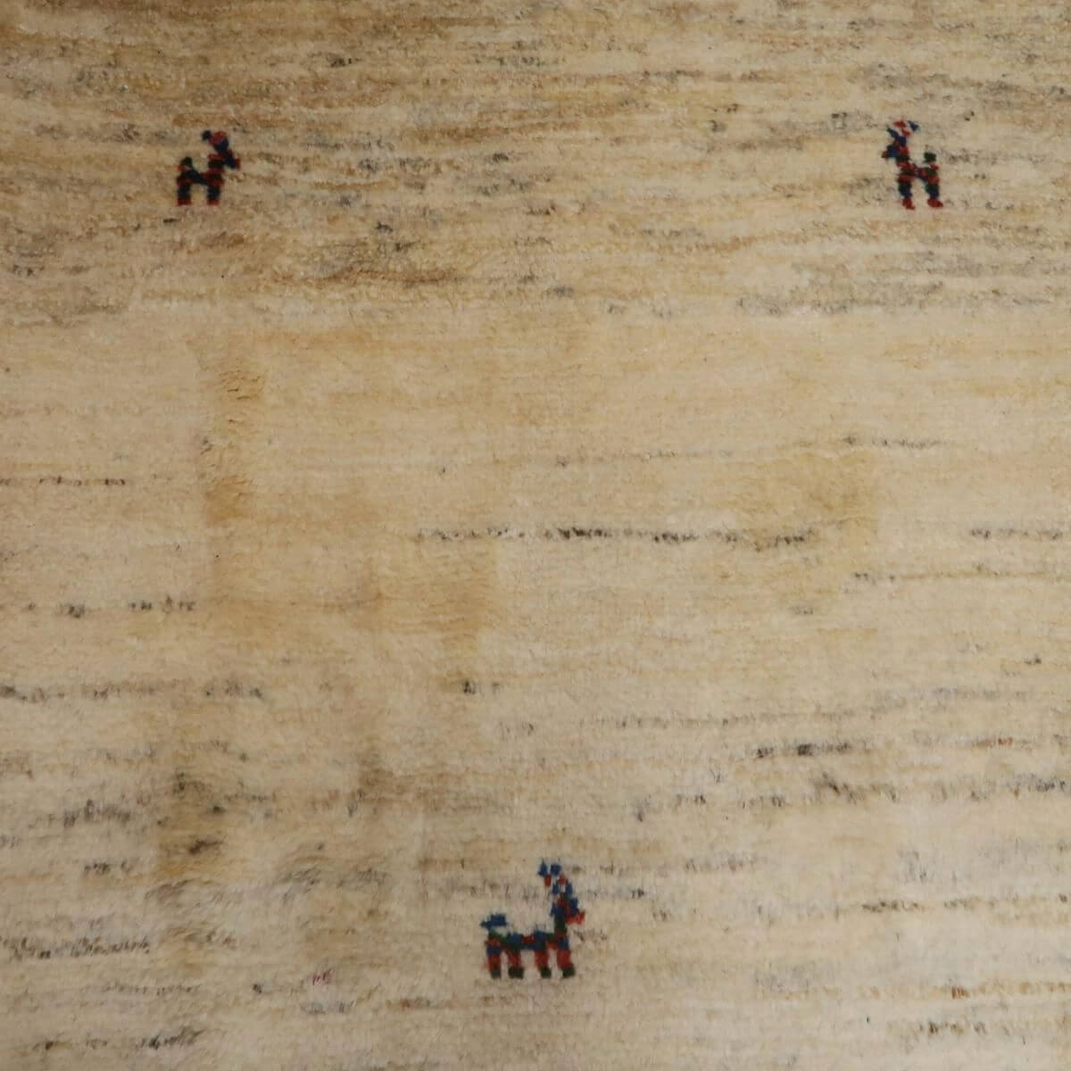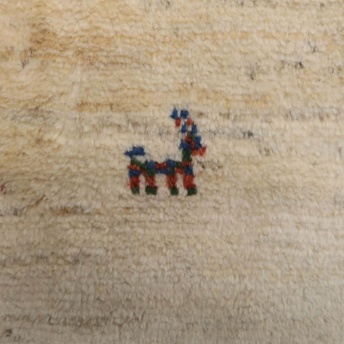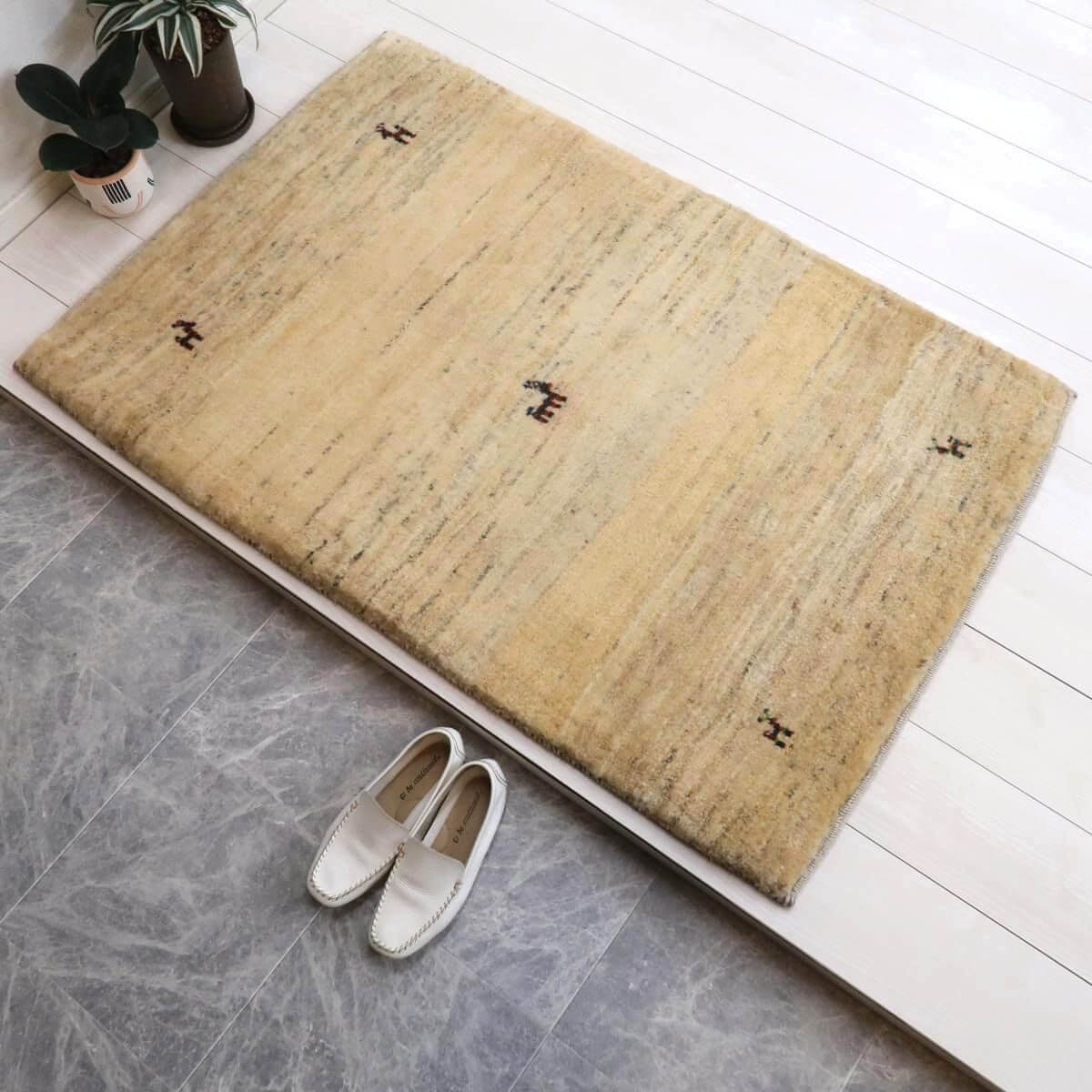 穏やかな生成りと黄色のグラデーションが心地よいこの絨毯は、温かみがあり、その背景には動物のモチーフが描かれています。