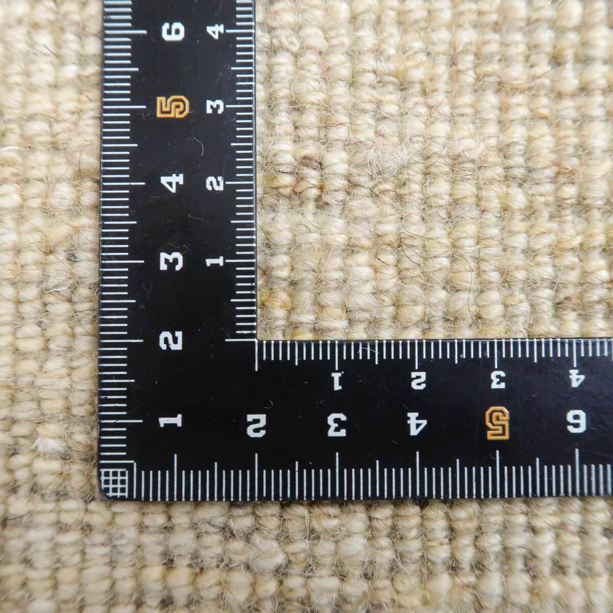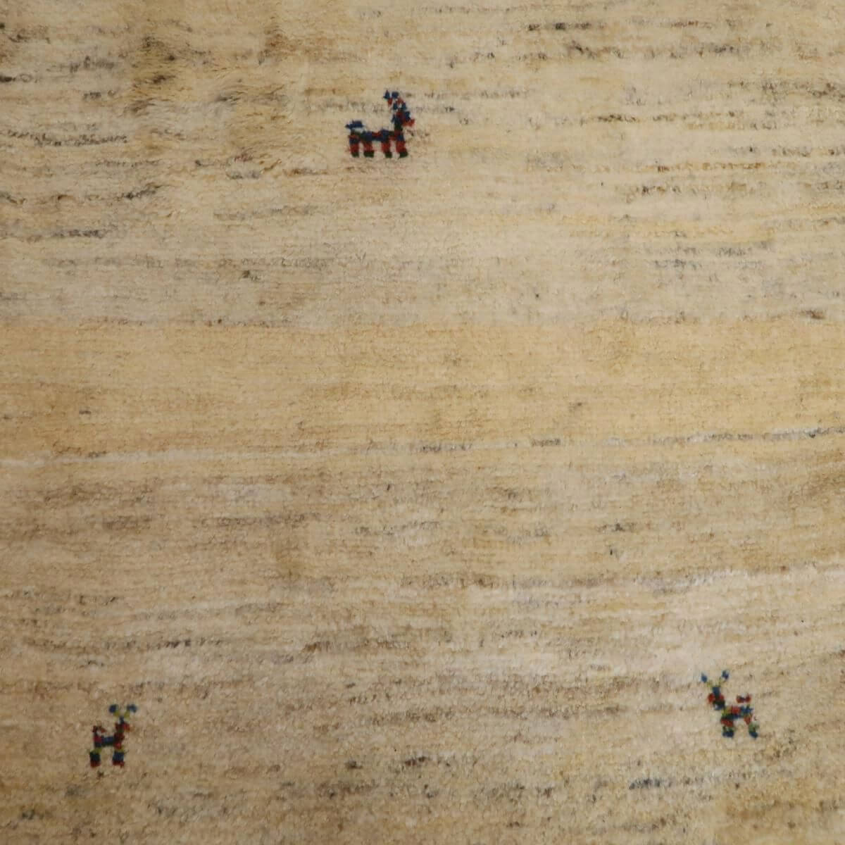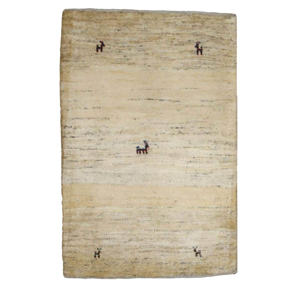 穏やかな生成りと黄色のグラデーションが心地よいこの絨毯は、温かみがあり、その背景には動物のモチーフが描かれています。