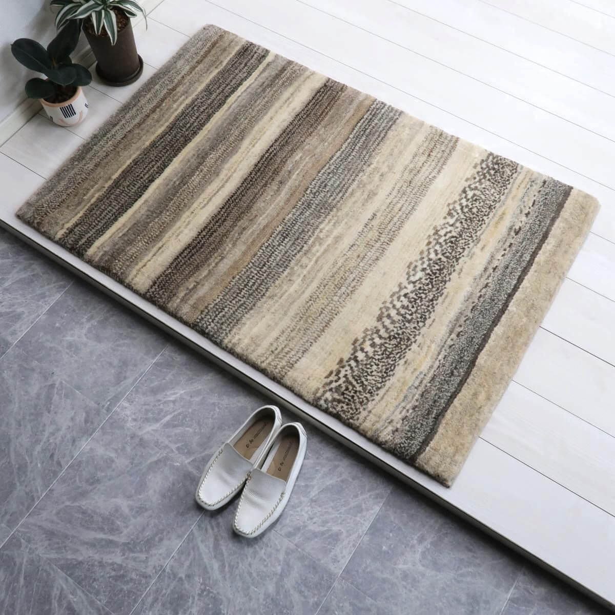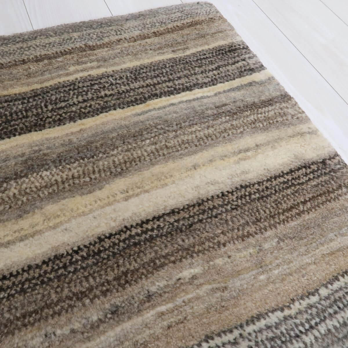 生成り、灰色、深い茶色が織られていて、細かな模様が各ストライプに繊細な輝きを与えています。