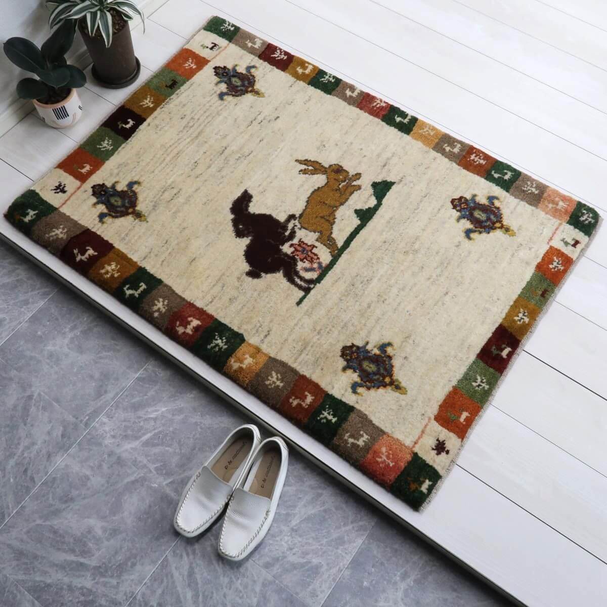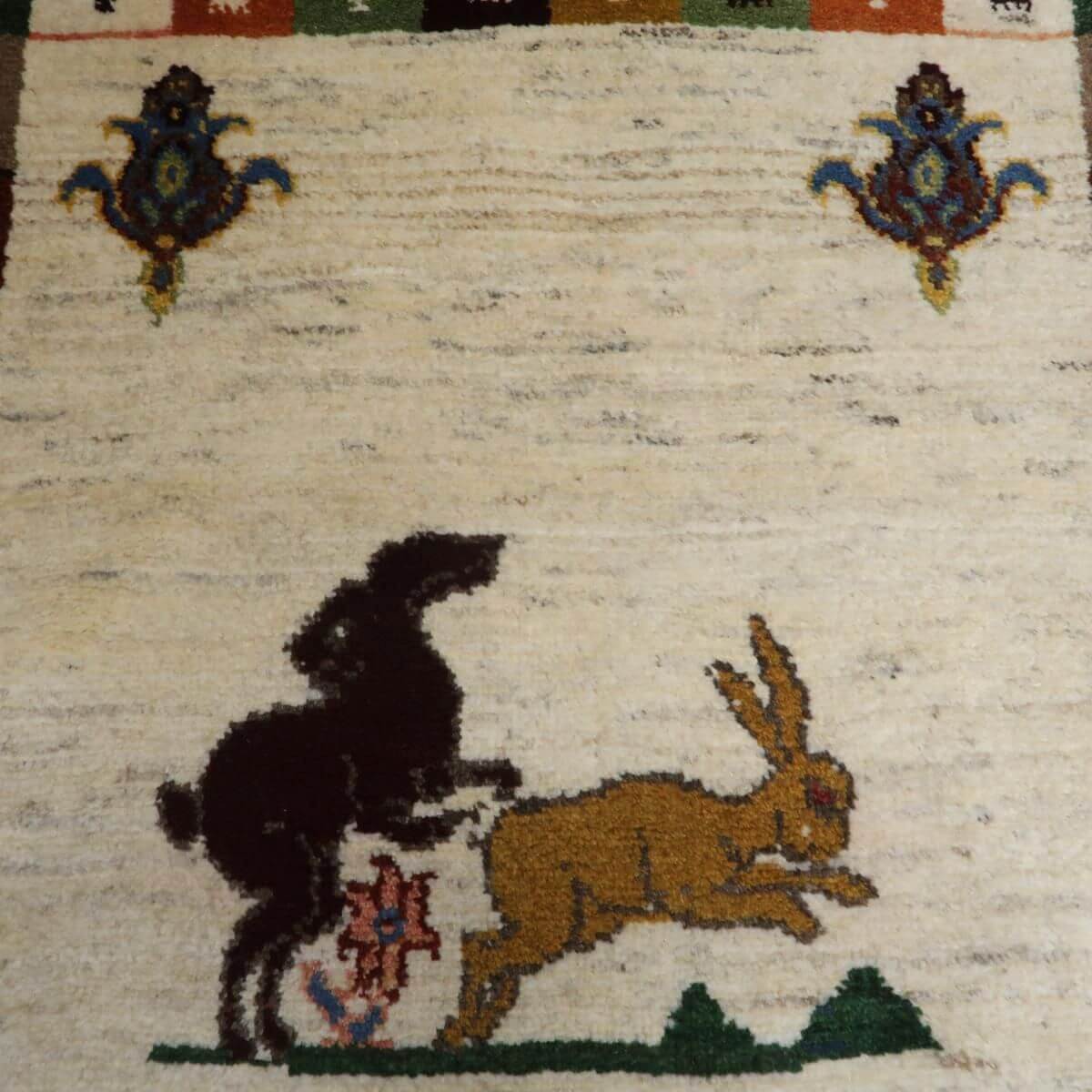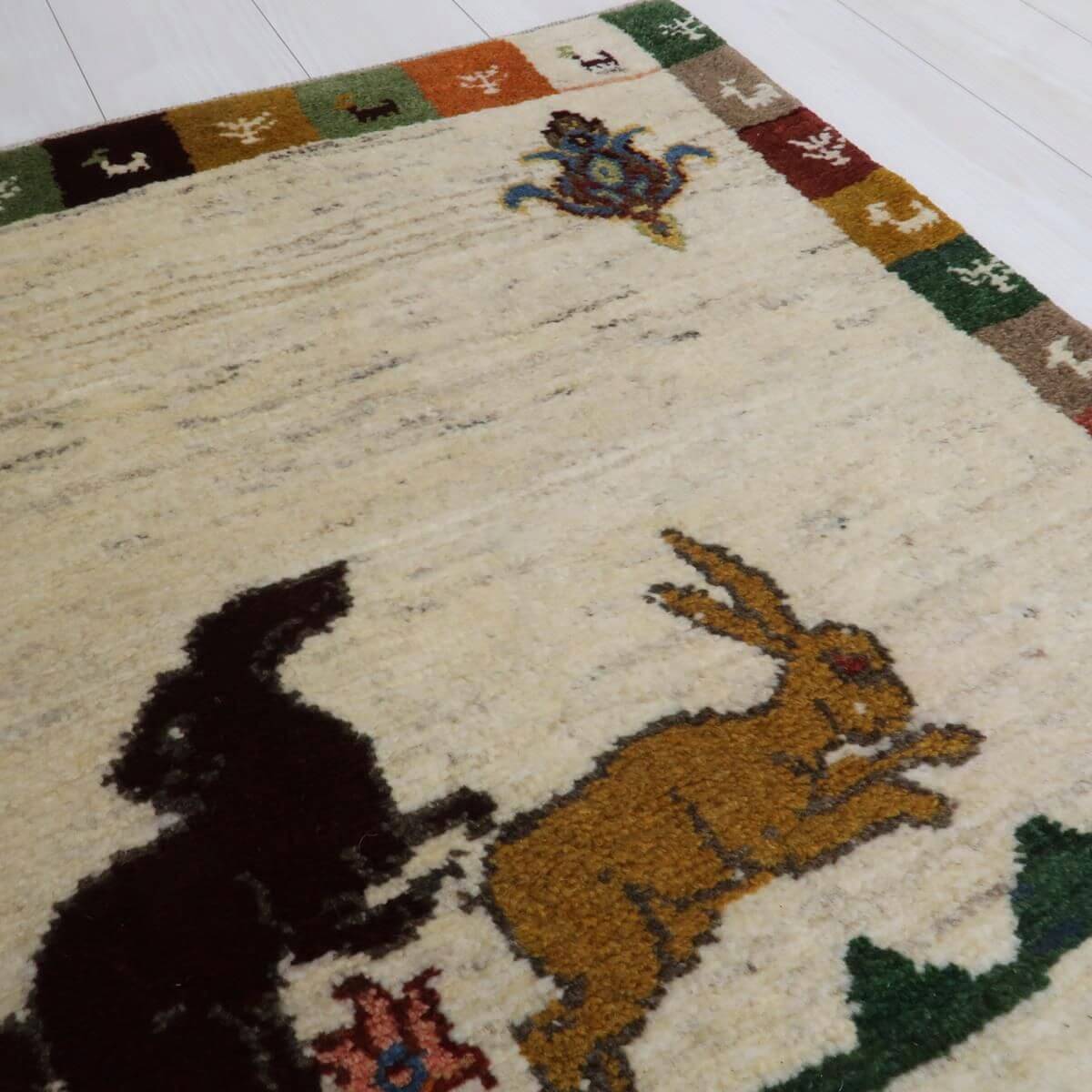この絨毯は、生成りを特徴で、中央に描かれた動物のモチーフがギャッベ全体を目立たせています。
