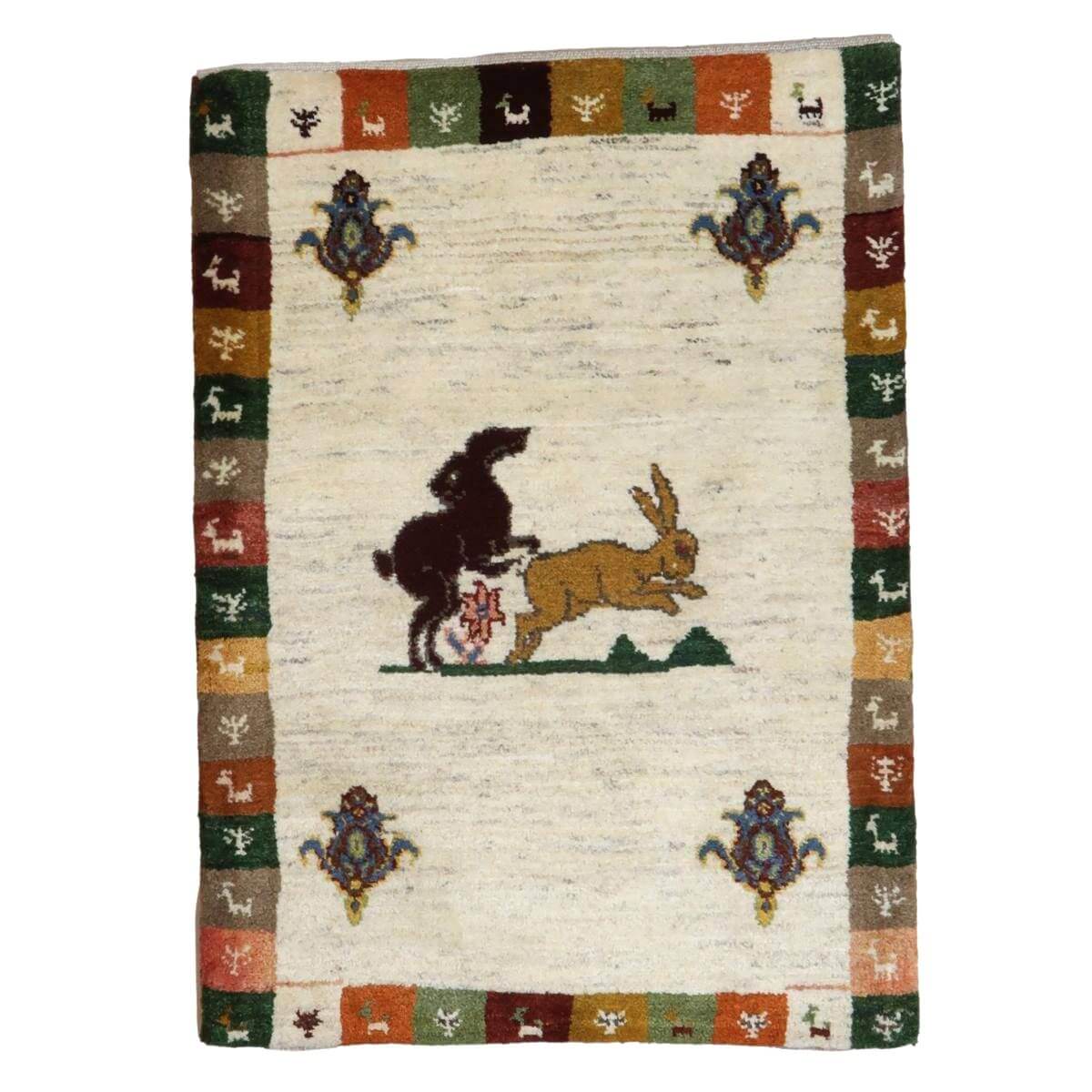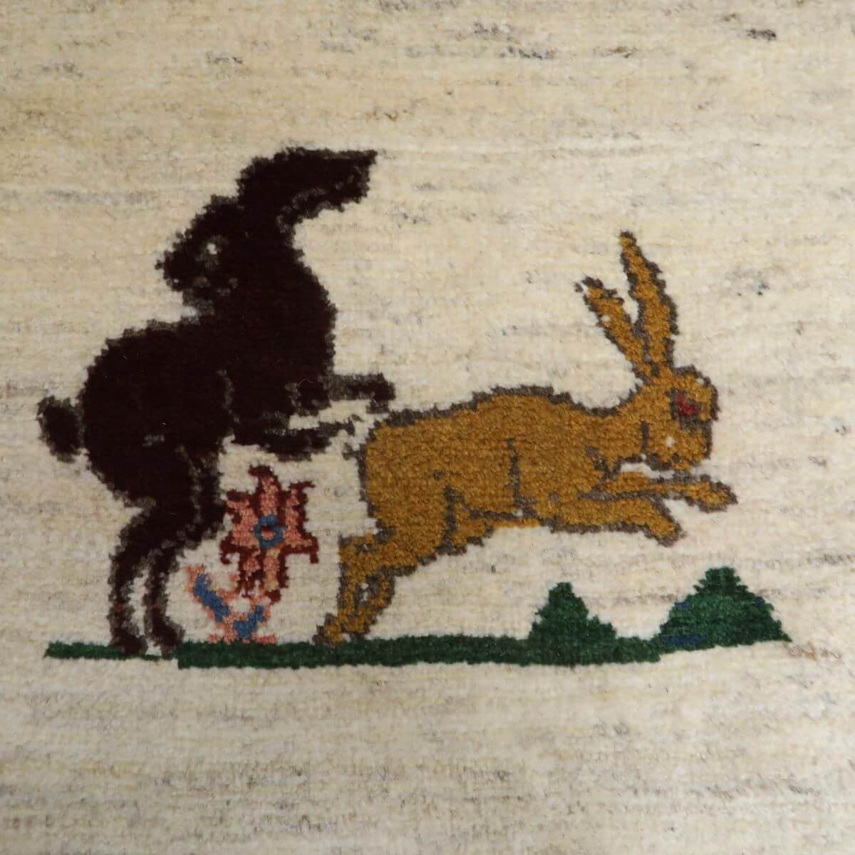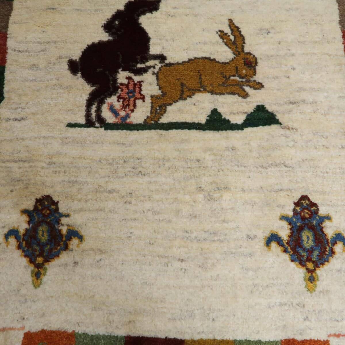 この絨毯は、生成りを特徴で、中央に描かれた動物のモチーフがギャッベ全体を目立たせています。