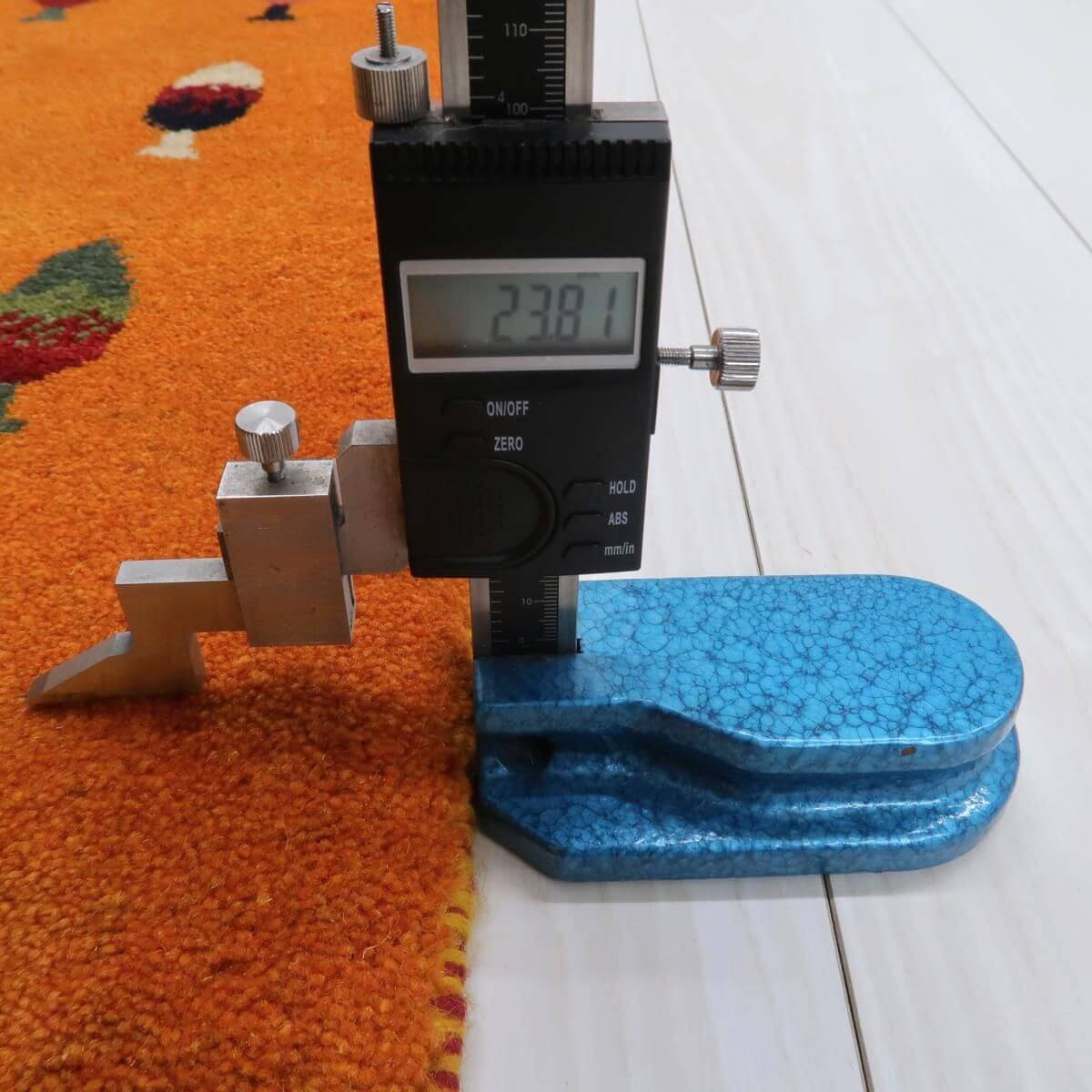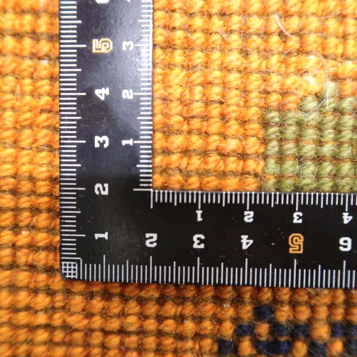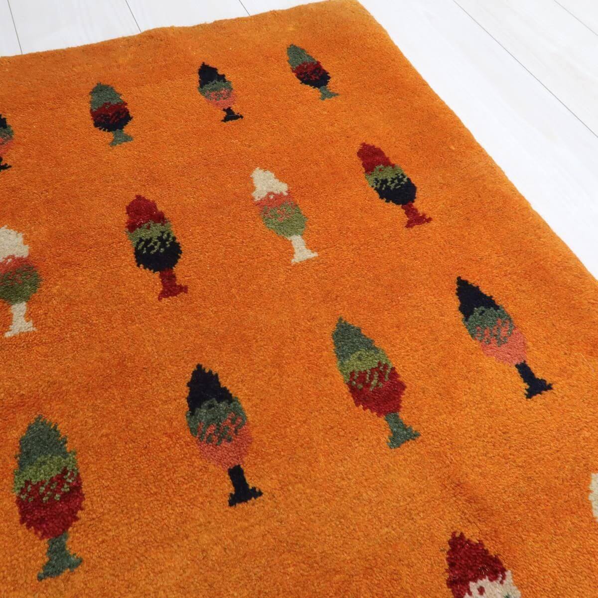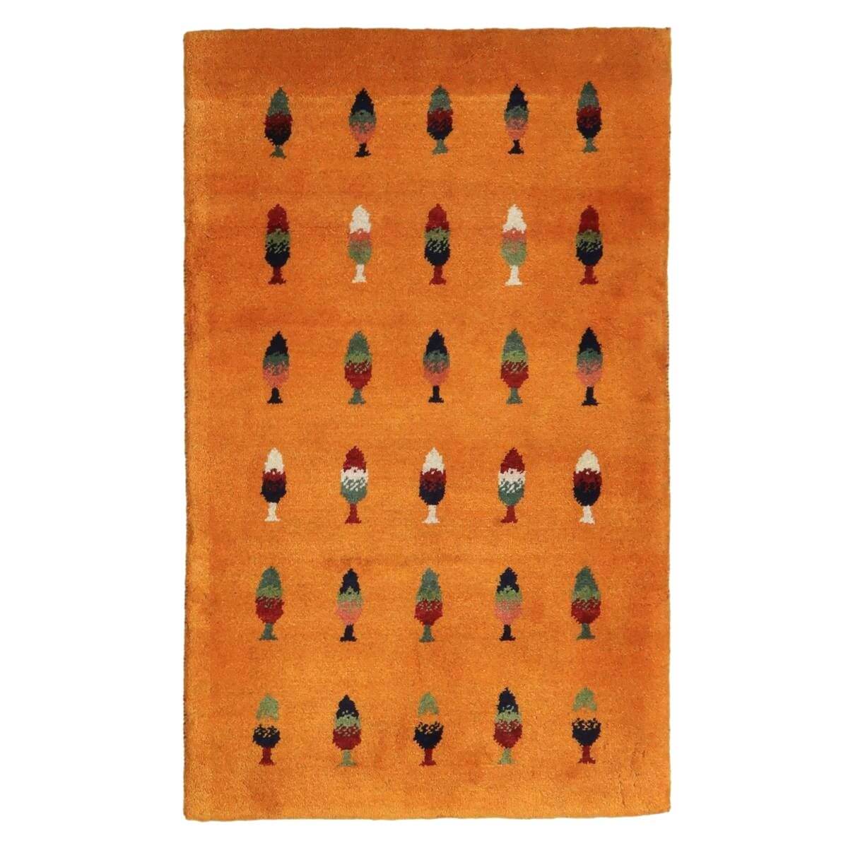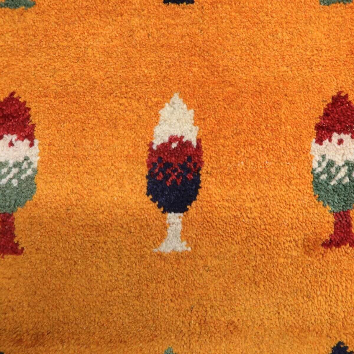 この鮮やかなギャッベは、活気に満ちた橙色の地に、様々な色のモチーフが並べられています。